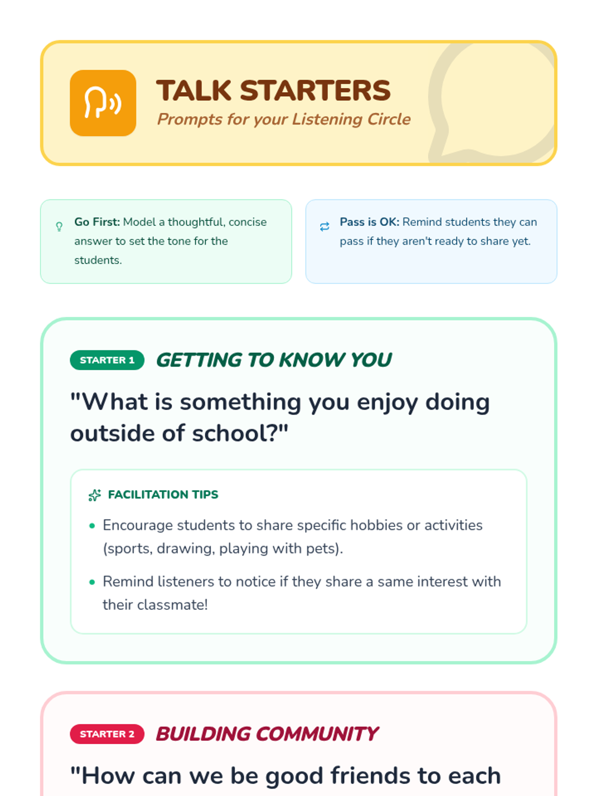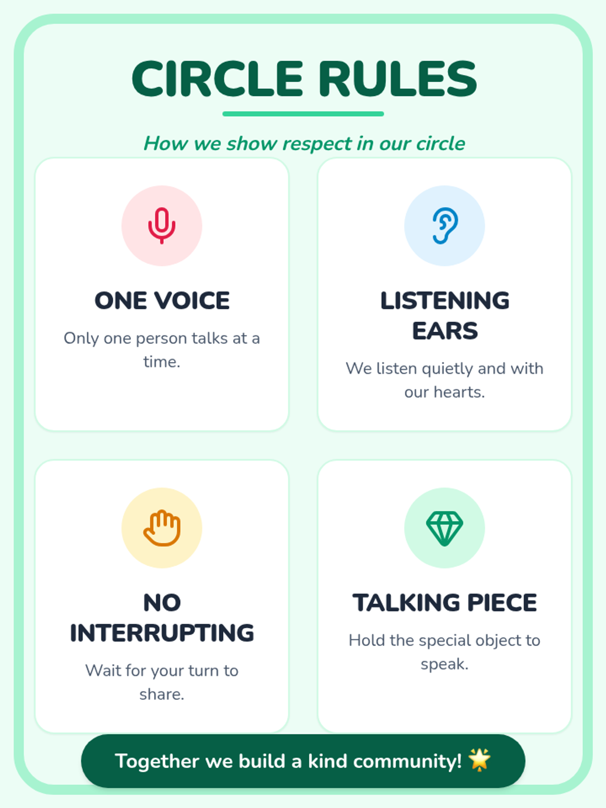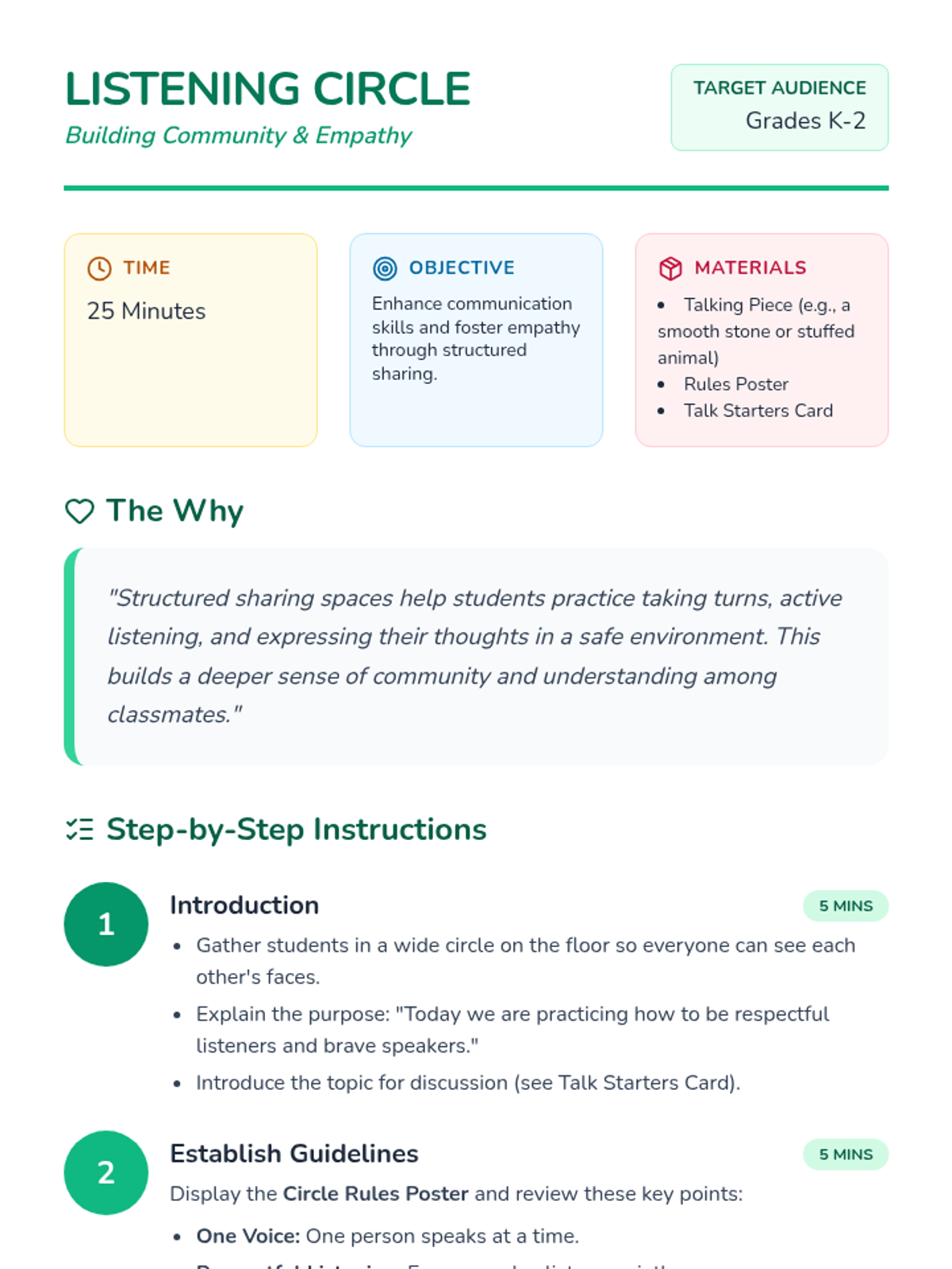 A structured social-emotional learning lesson for Grades K-2 where students practice active listening and respectful speaking in a community circle. Students use a talking piece to share their thoughts and build empathy for their classmates.