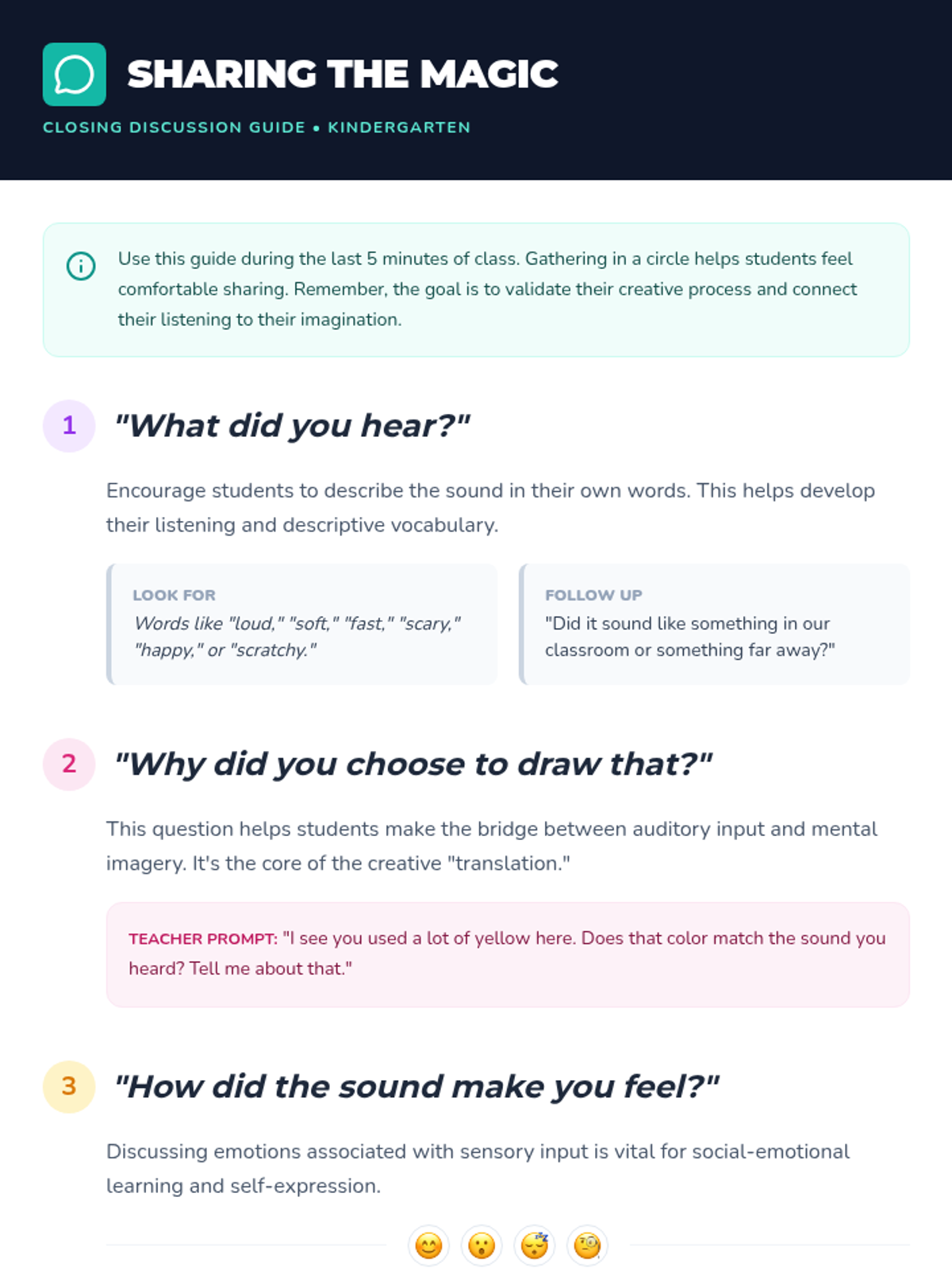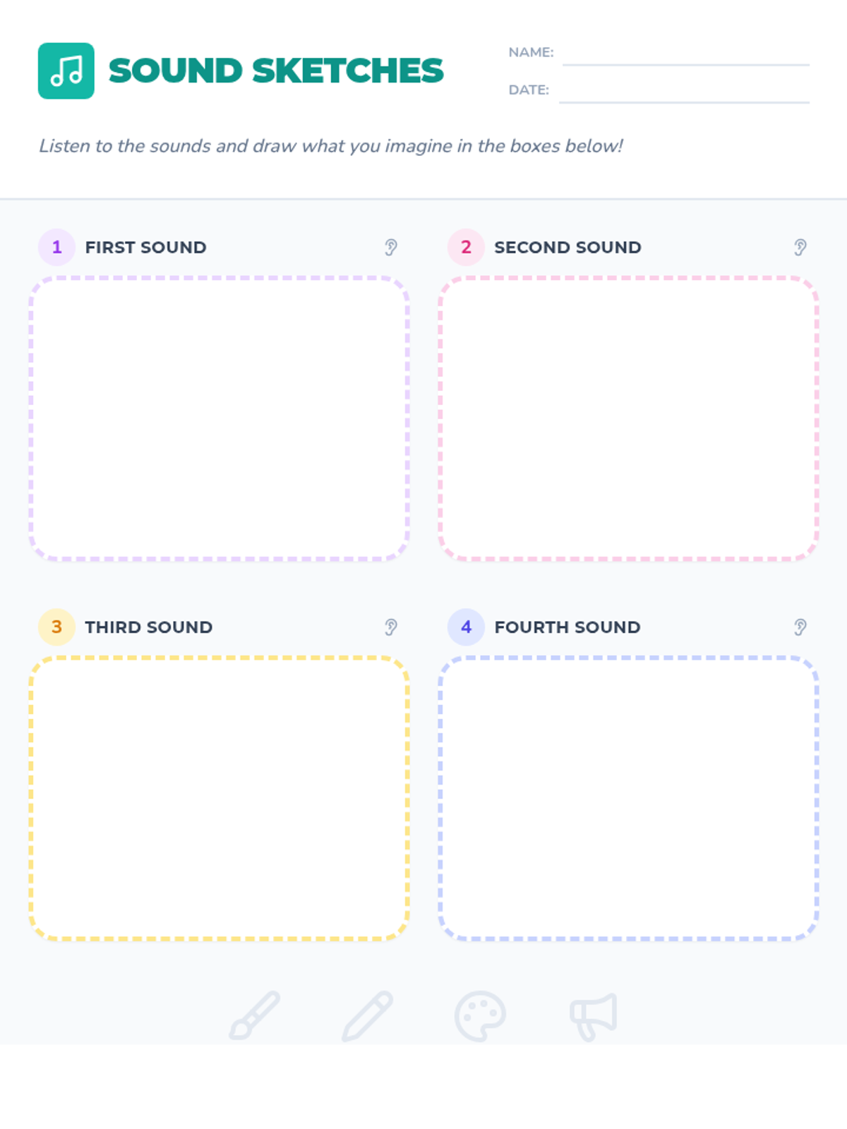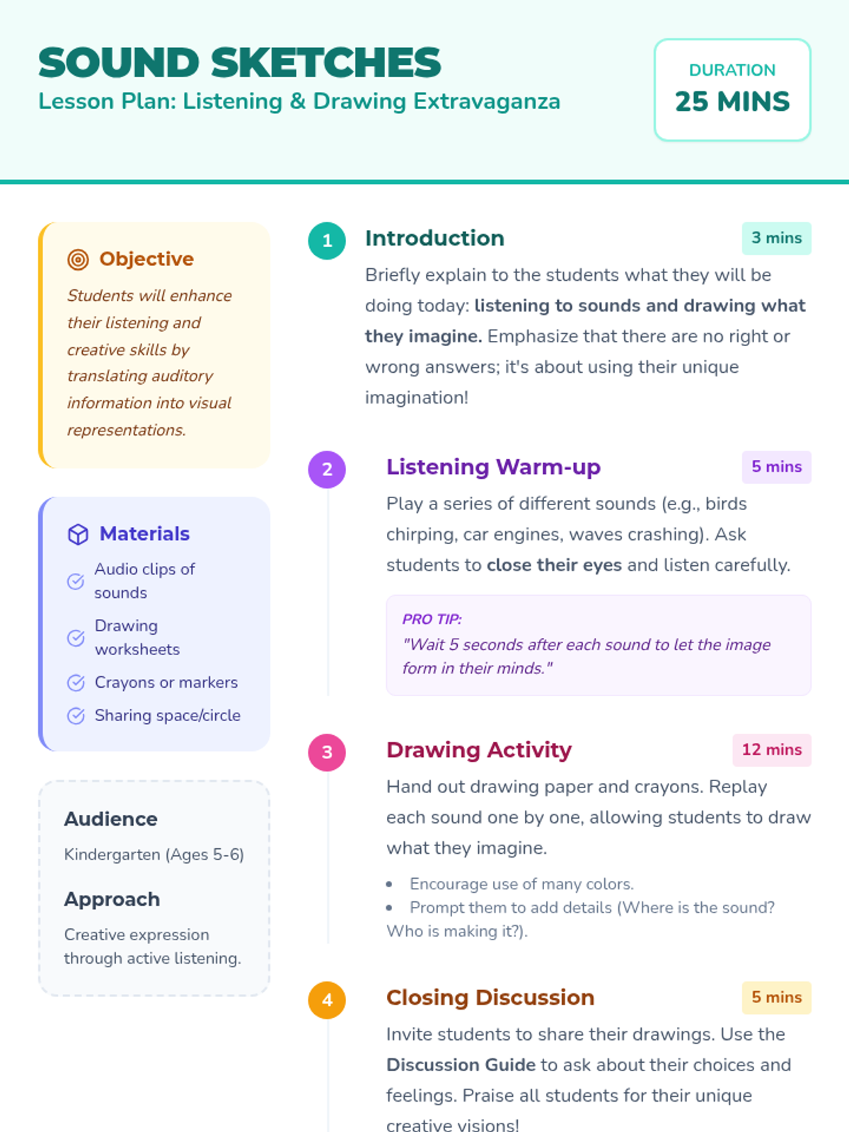 A creative Kindergarten lesson where students listen to various sounds and translate their auditory experiences into visual art, fostering active listening and imaginative expression.
