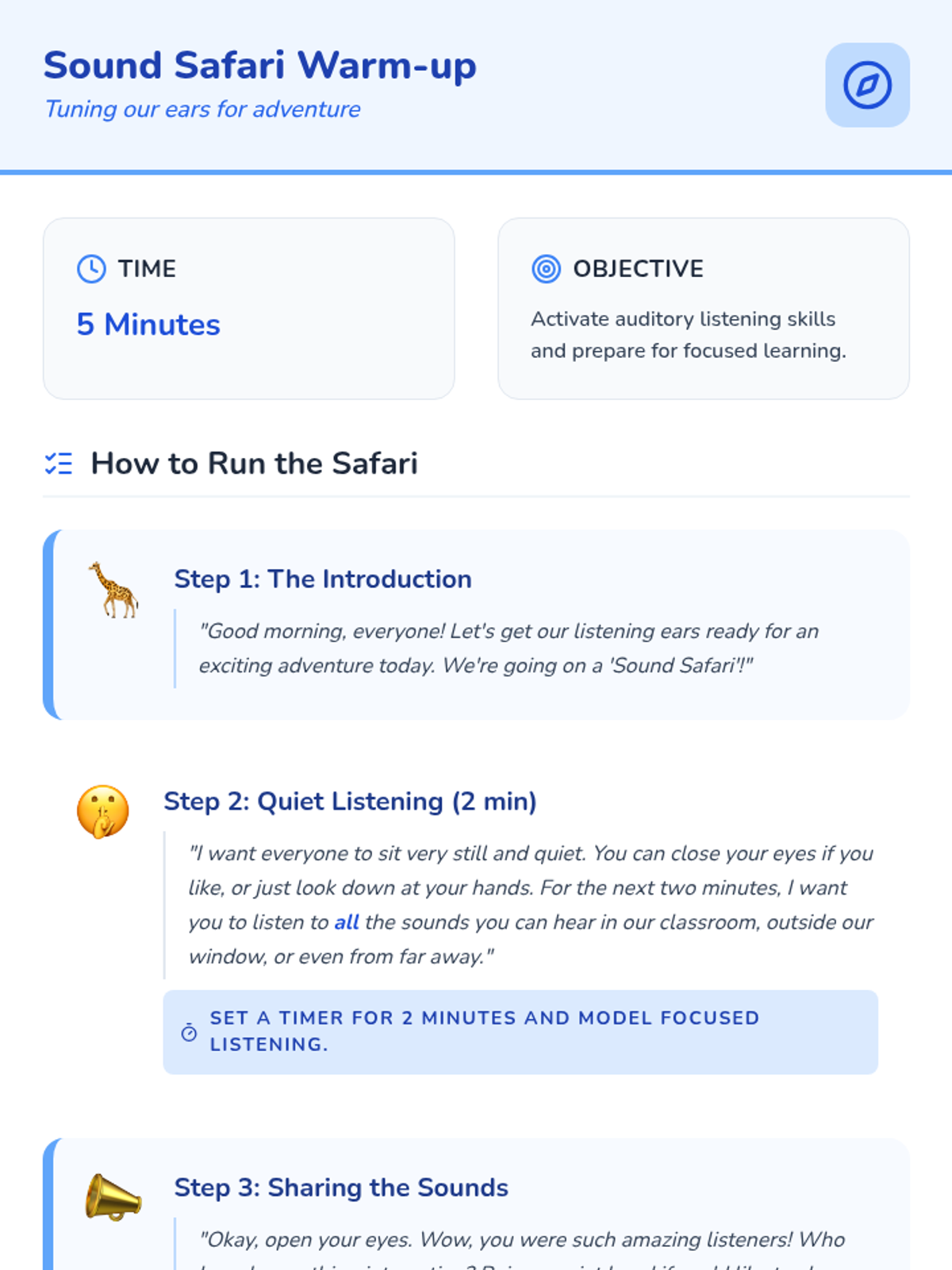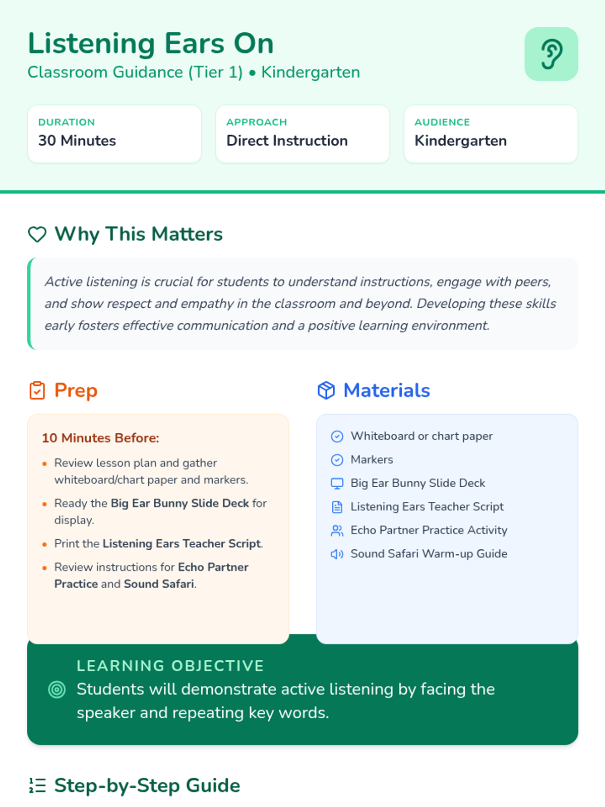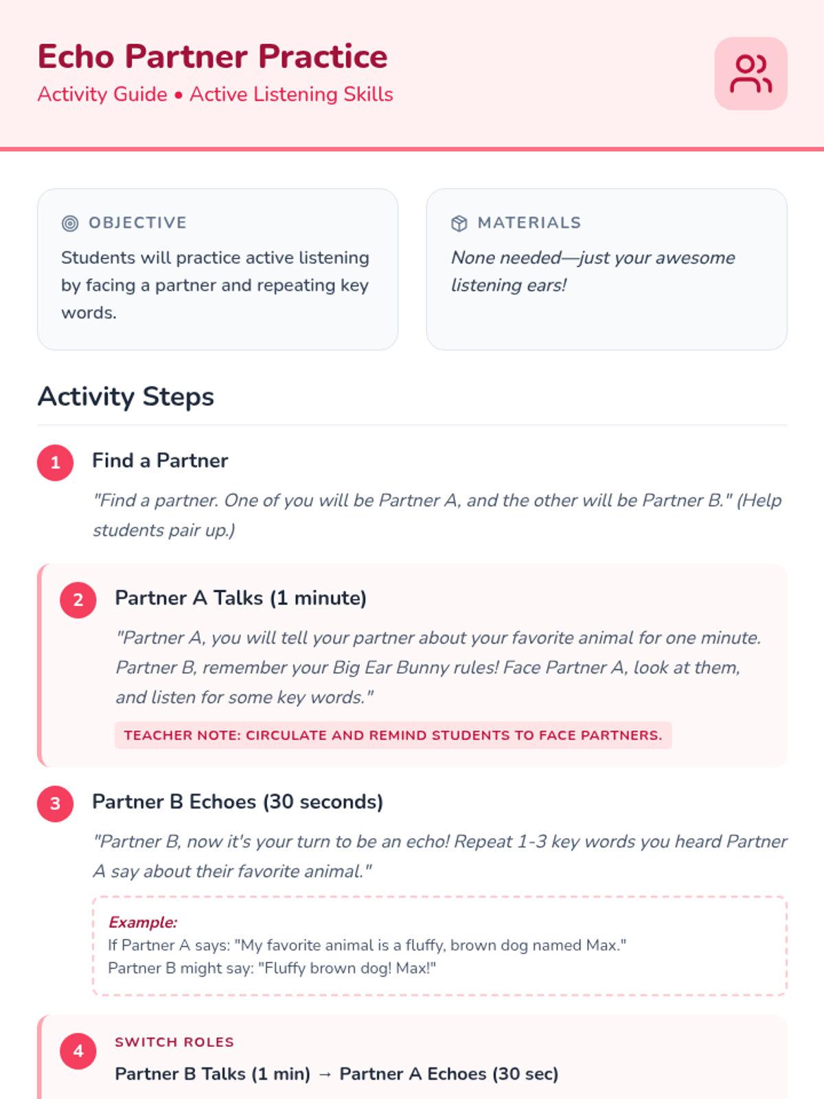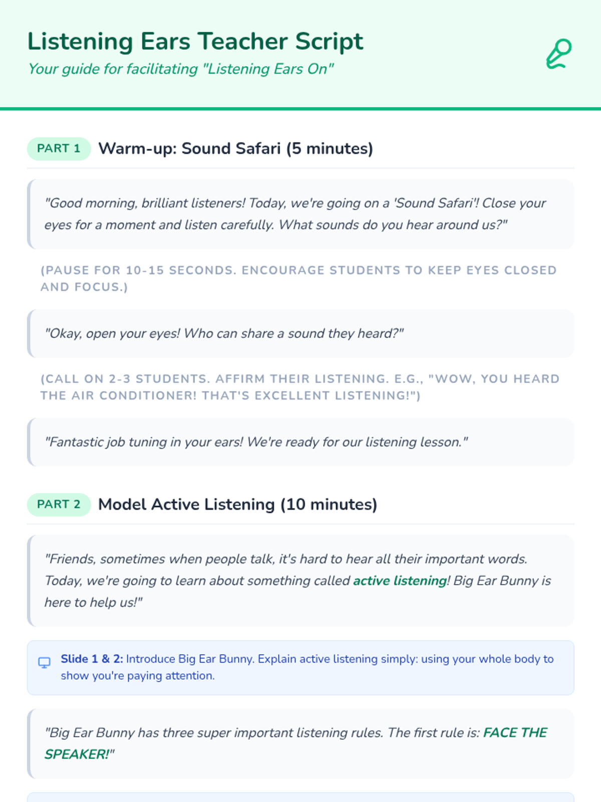 This lesson teaches Kindergarten students the importance of active listening skills. By practicing facing the speaker and repeating key words, students will develop respect and empathy, crucial for effective communication.