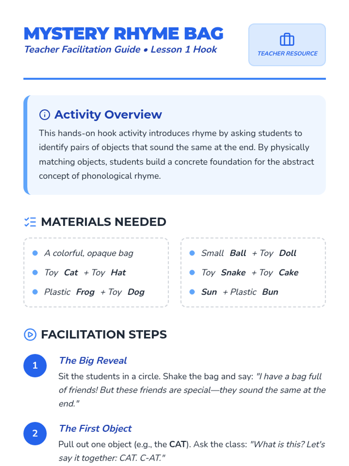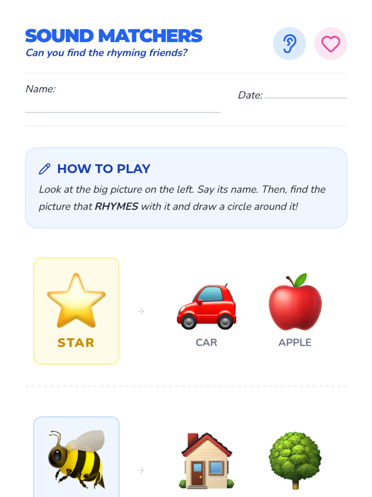 Students develop auditory discrimination by identifying rhyming words in spoken poetry and matching objects with similar ending sounds.