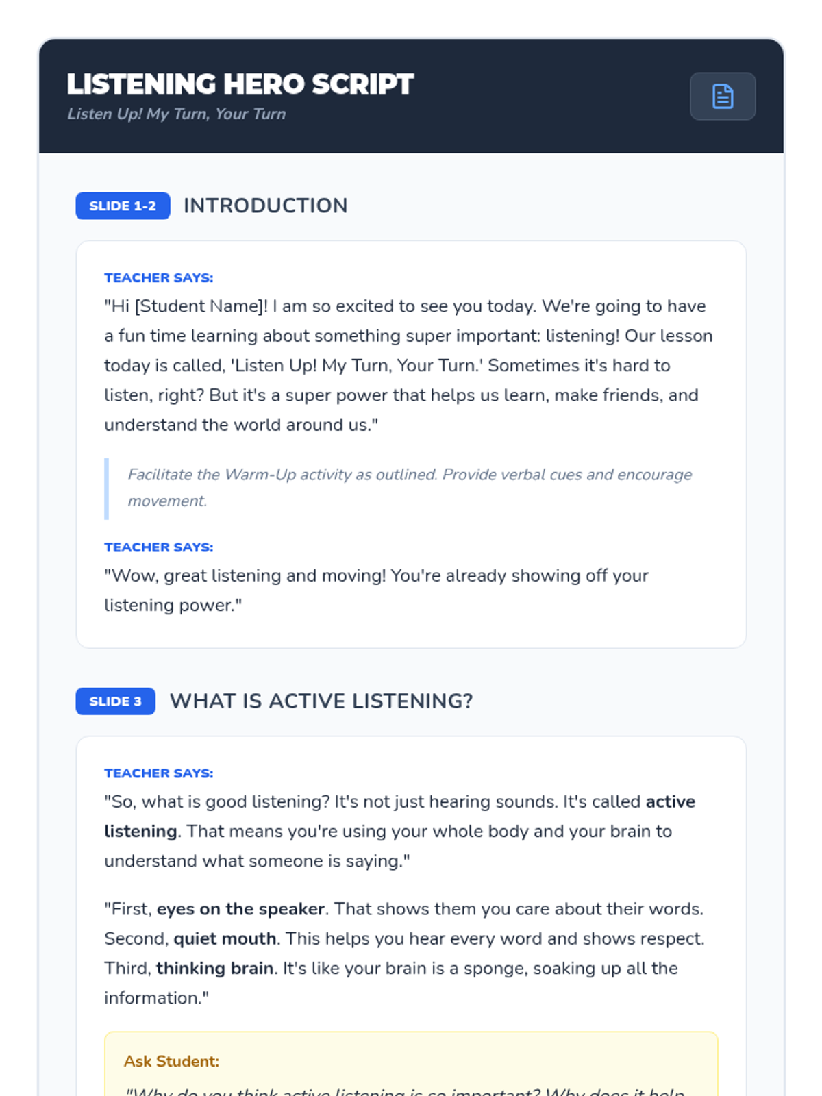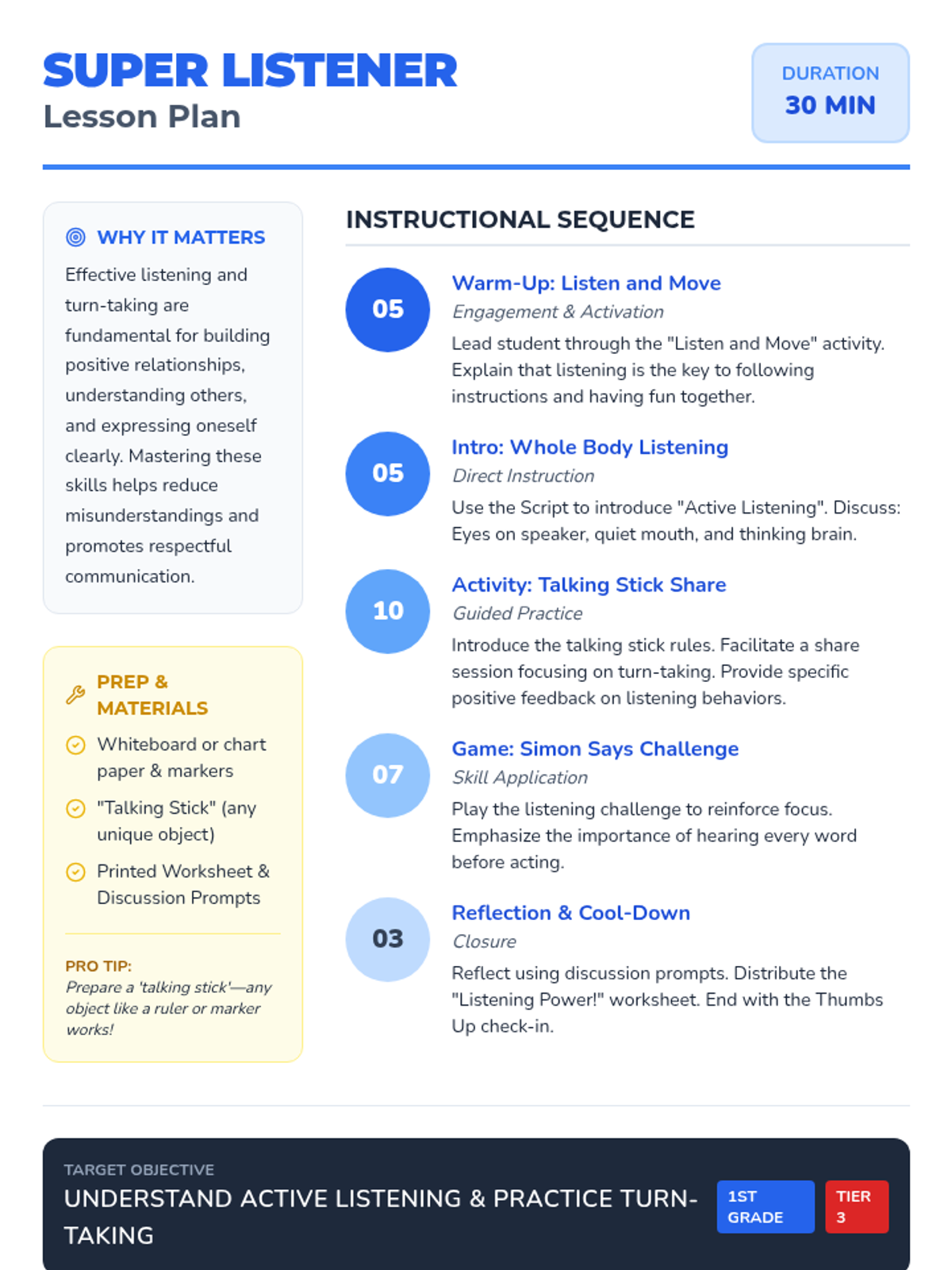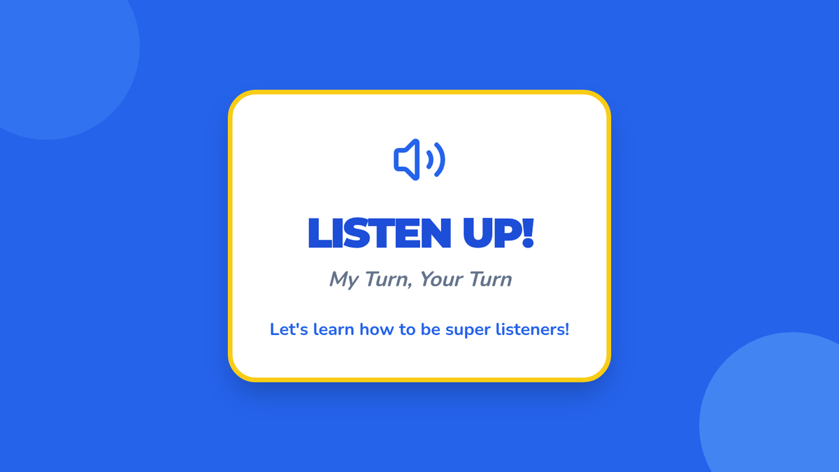 This 30-minute, individual lesson for a 1st grader teaches active listening and turn-taking skills using Cognitive Behavioral Therapy (CBT) techniques. It focuses on developing strong communication and social-emotional intelligence through interactive practice.