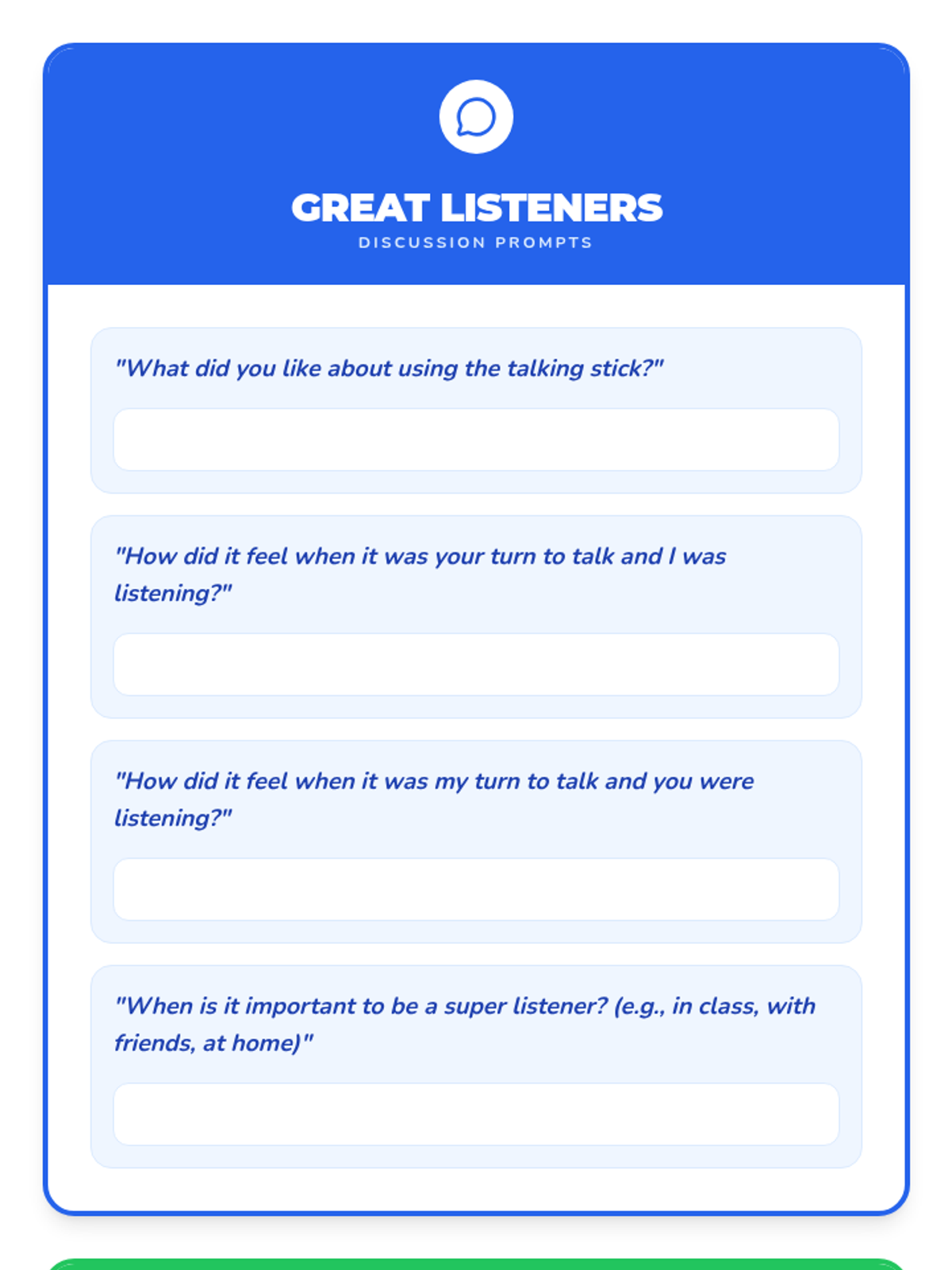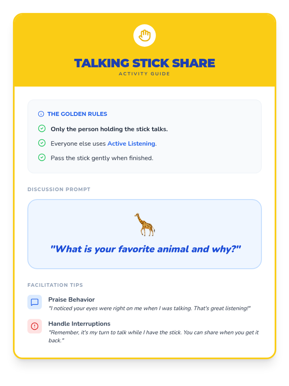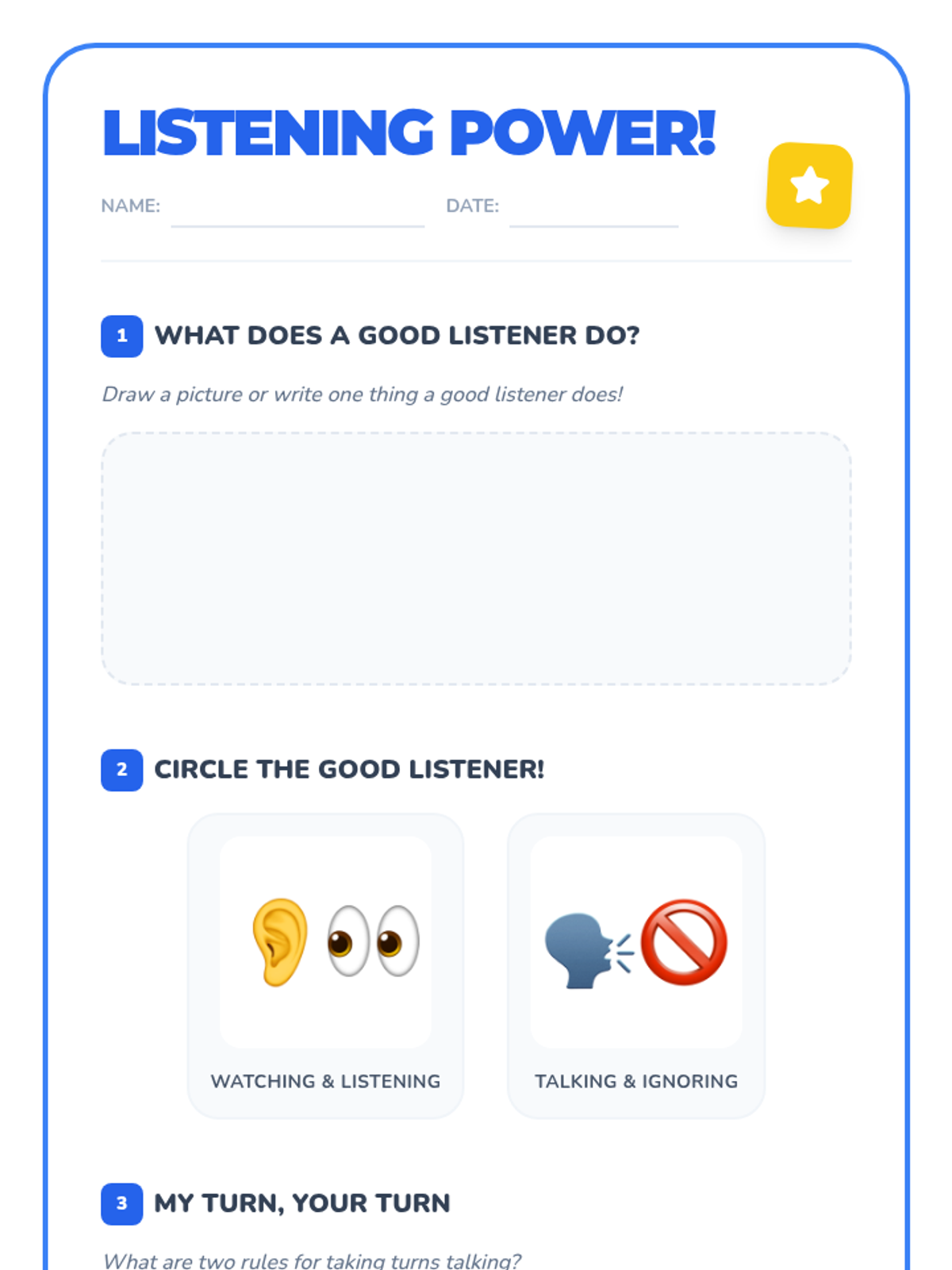 This 30-minute, individual lesson for a 1st grader teaches active listening and turn-taking skills using Cognitive Behavioral Therapy (CBT) techniques. It focuses on developing strong communication and social-emotional intelligence through interactive practice.