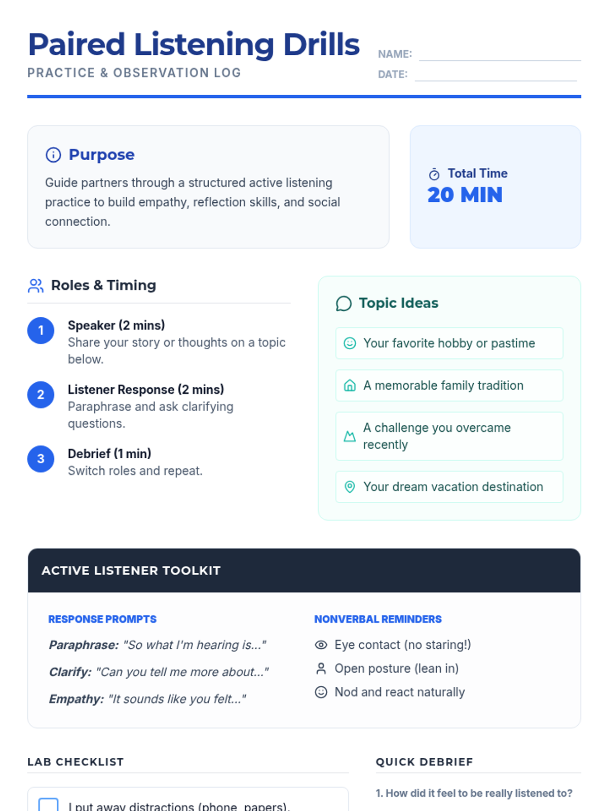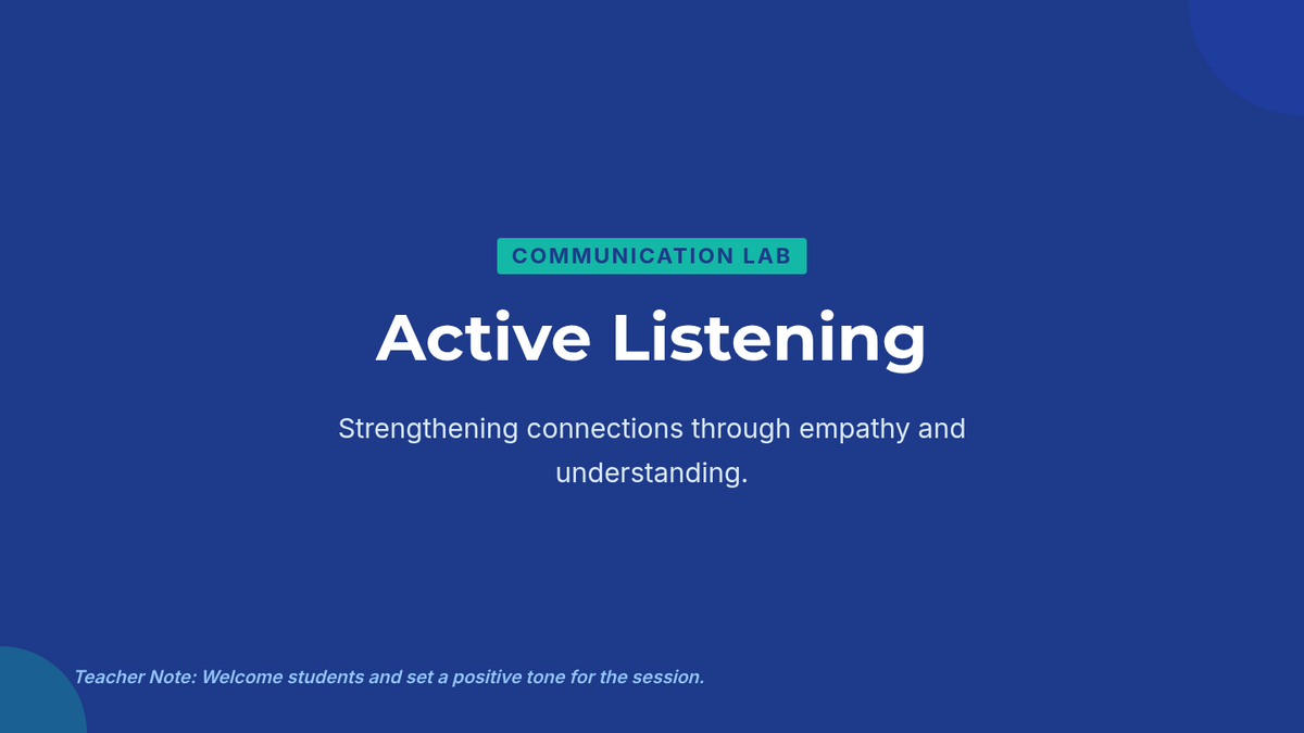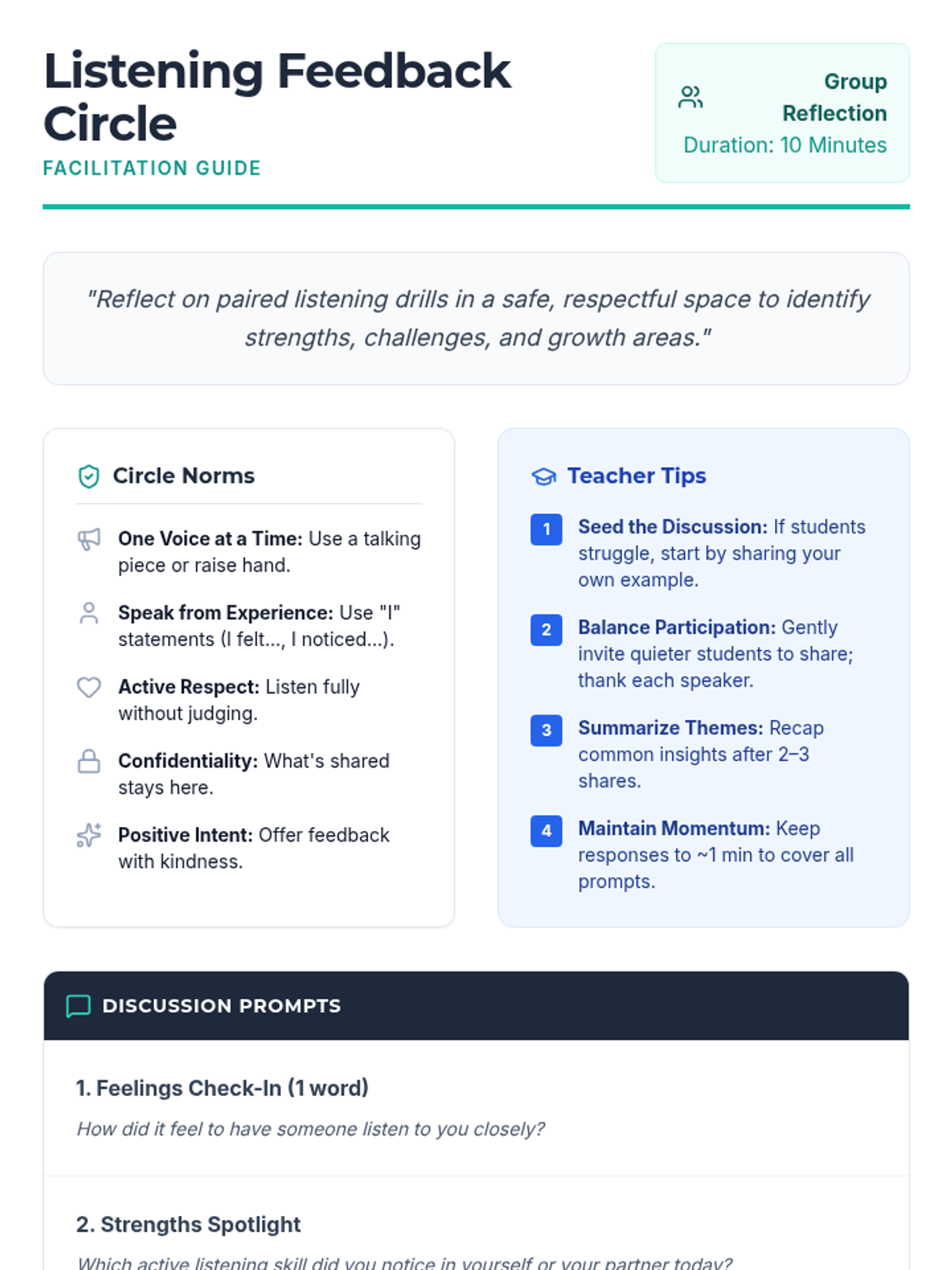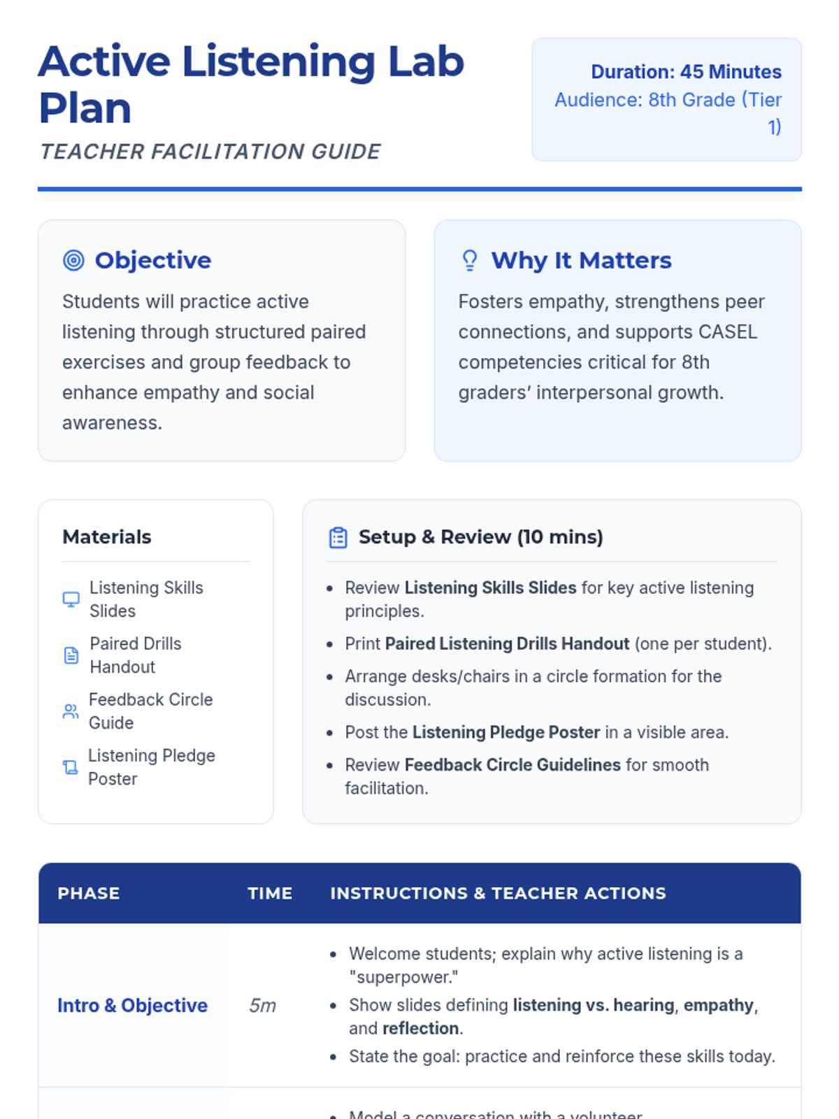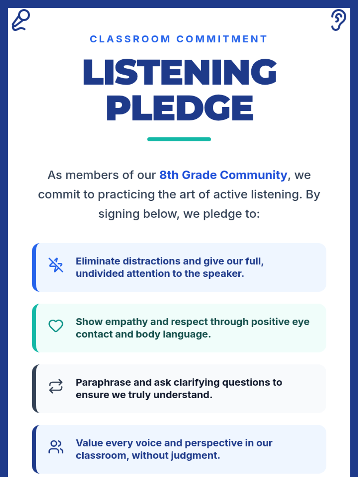 An interactive 45-minute lesson for 8th graders to practice active listening through structured drills, group discussion, and a community pledge. Focuses on empathy, nonverbal cues, and verbal techniques.