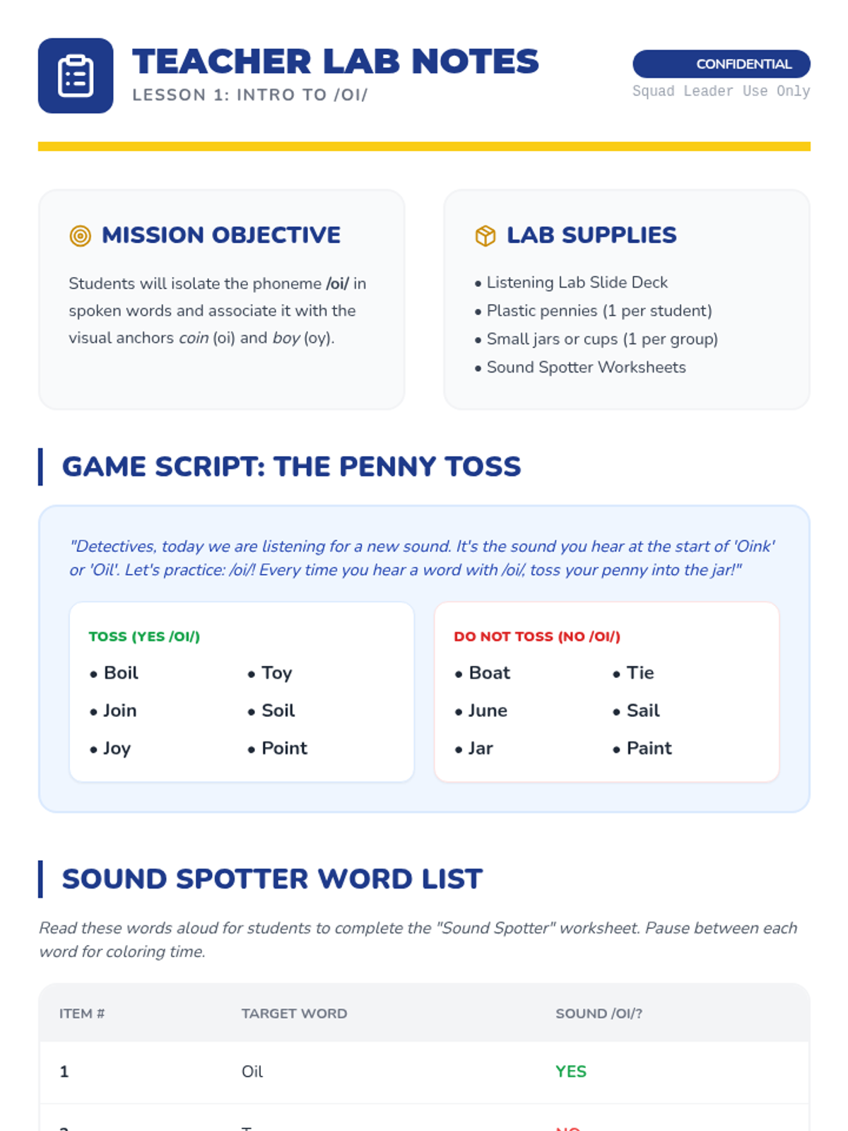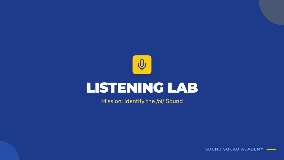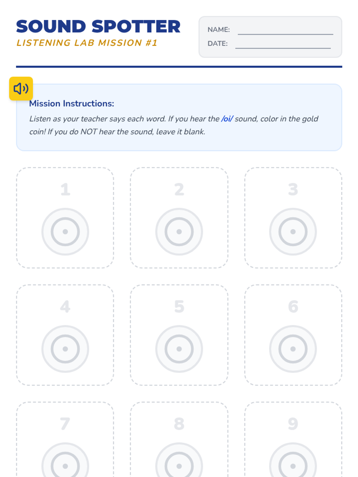 Students participate in a listening lab to identify the /oi/ sound in spoken words. They are introduced to the keywords 'coin' and 'boy' to anchor the 'oi' and 'oy' spelling patterns.
