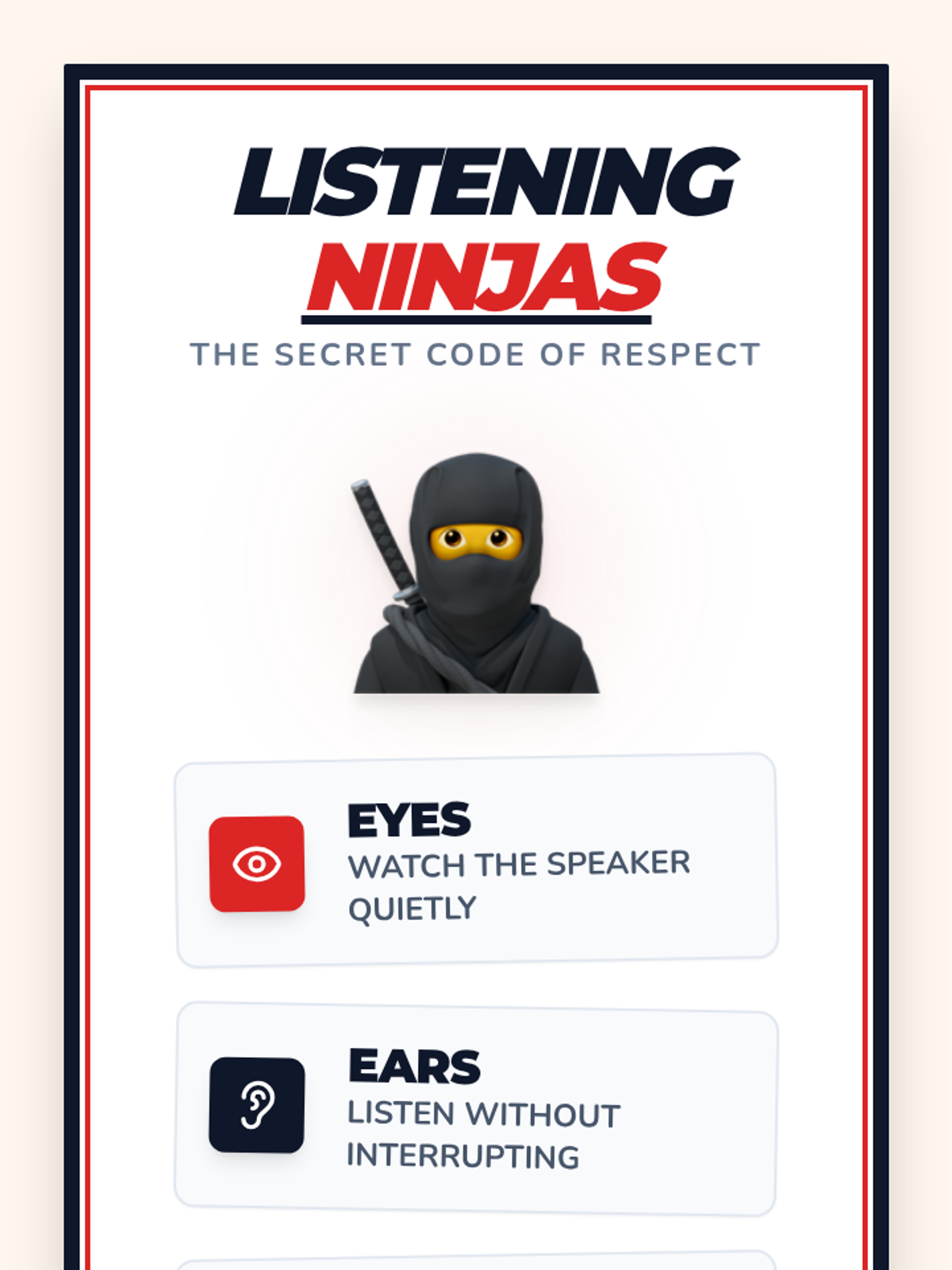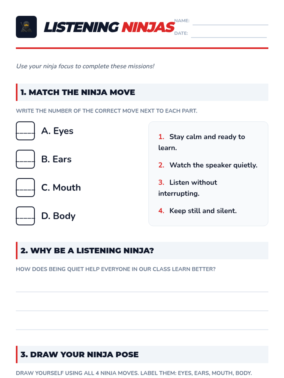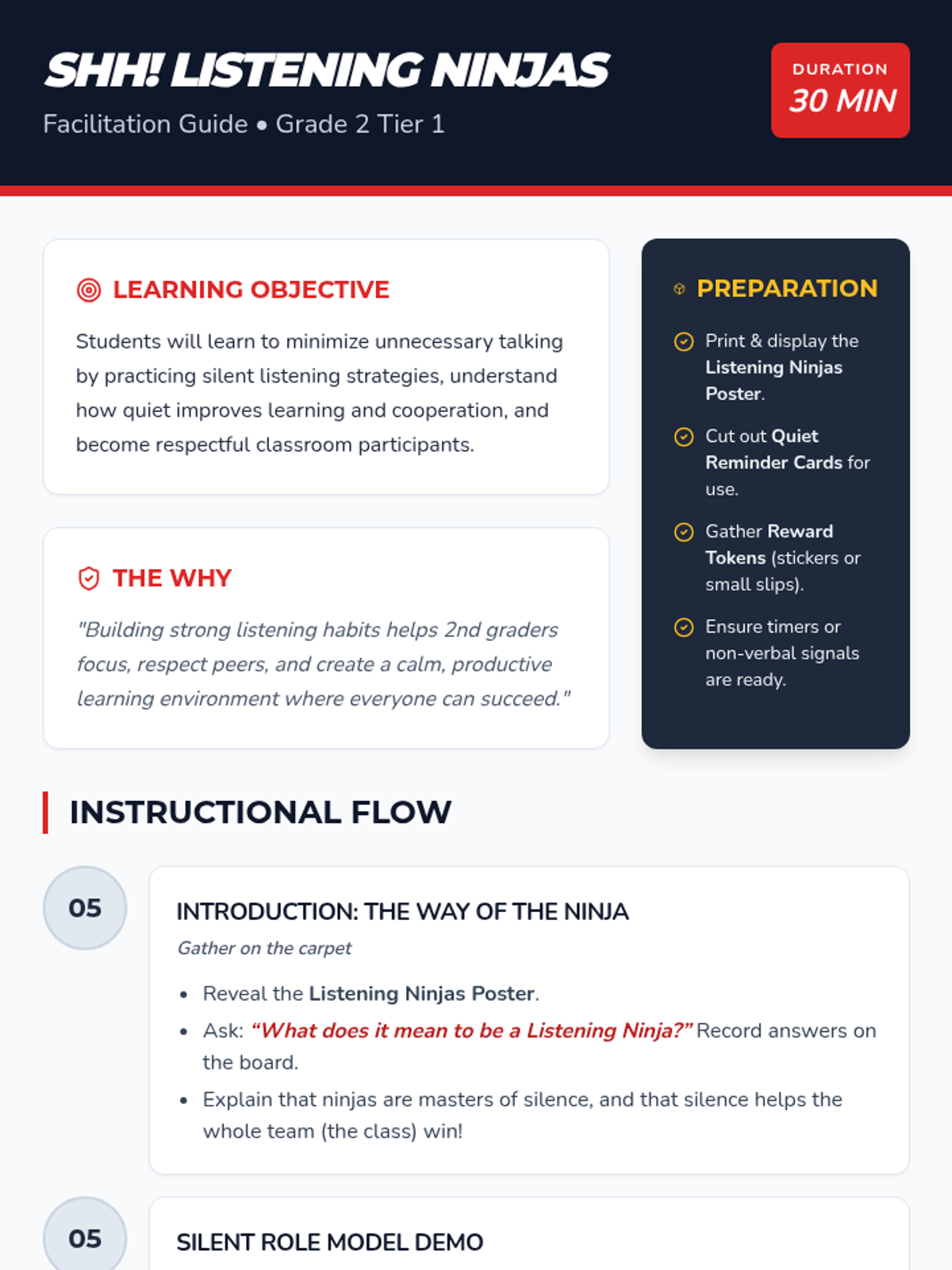 A 30-minute Tier 1 lesson for 2nd graders to improve focus and classroom community by practicing ninja-like quiet listening skills.