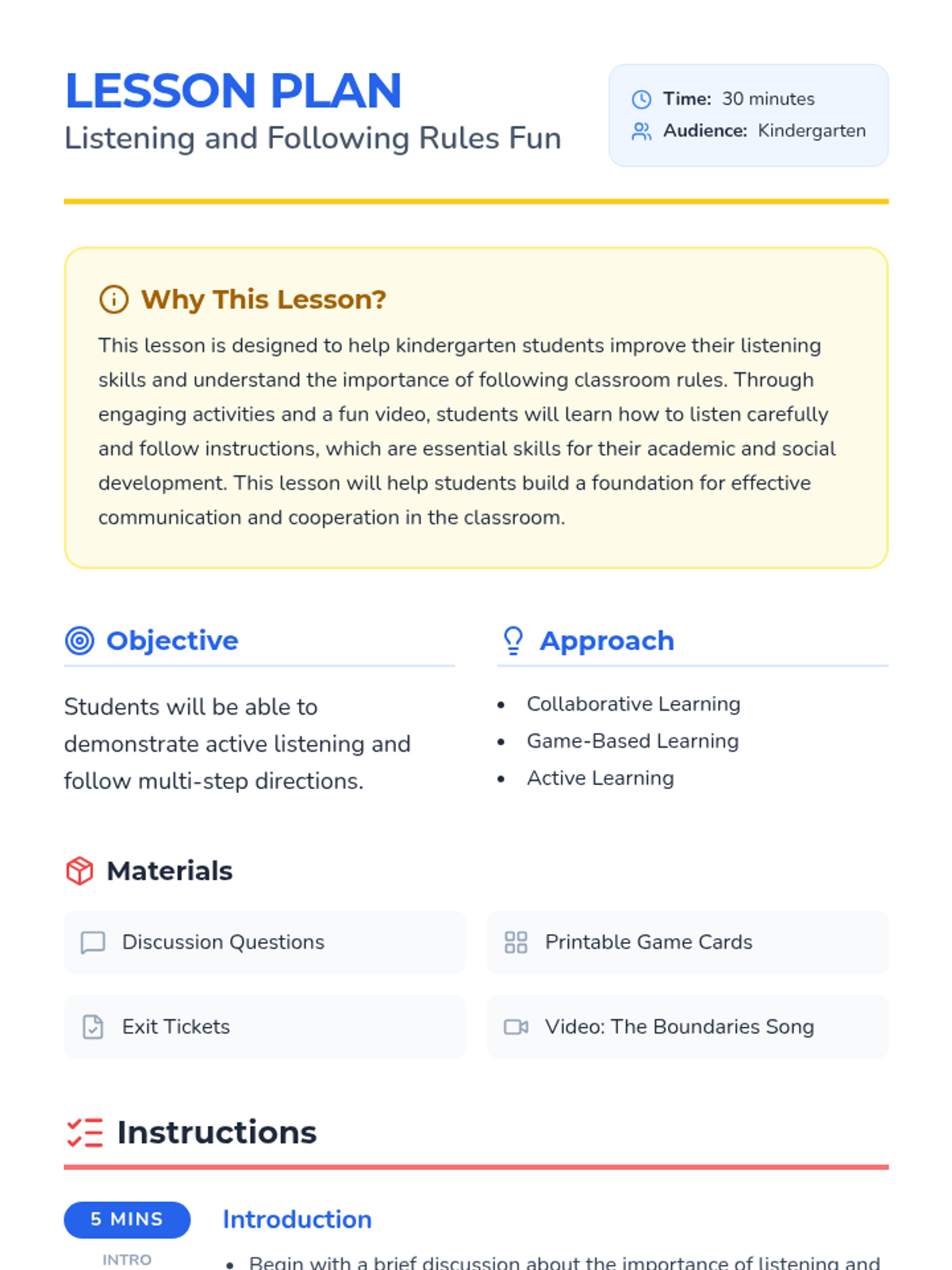 A fun, interactive lesson for Kindergarten students to develop listening skills and understand classroom boundaries and rules through games and discussion.