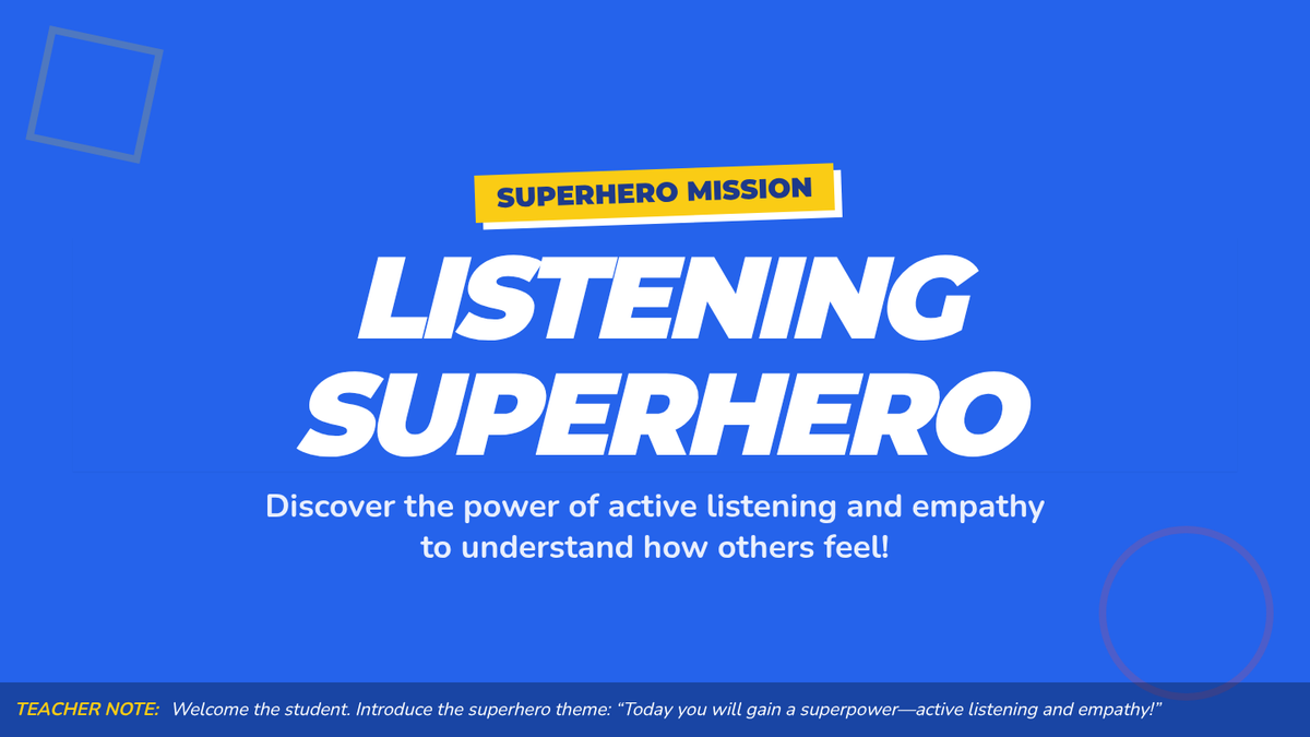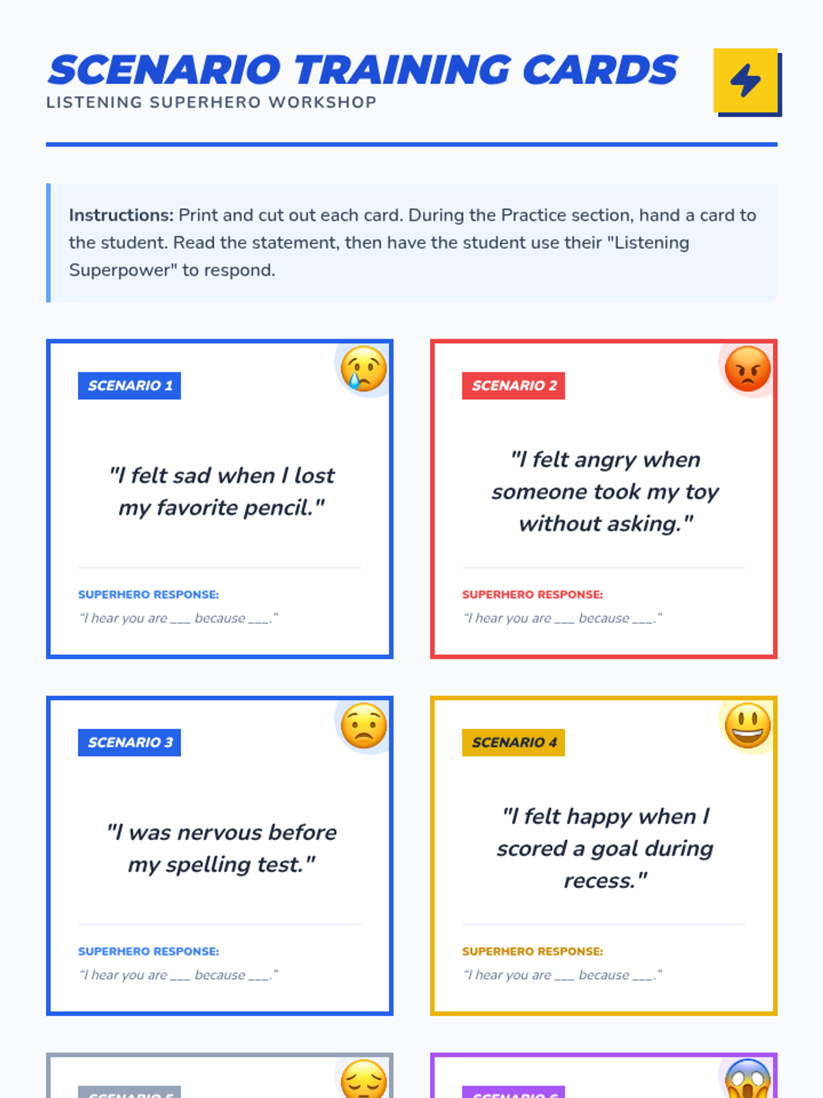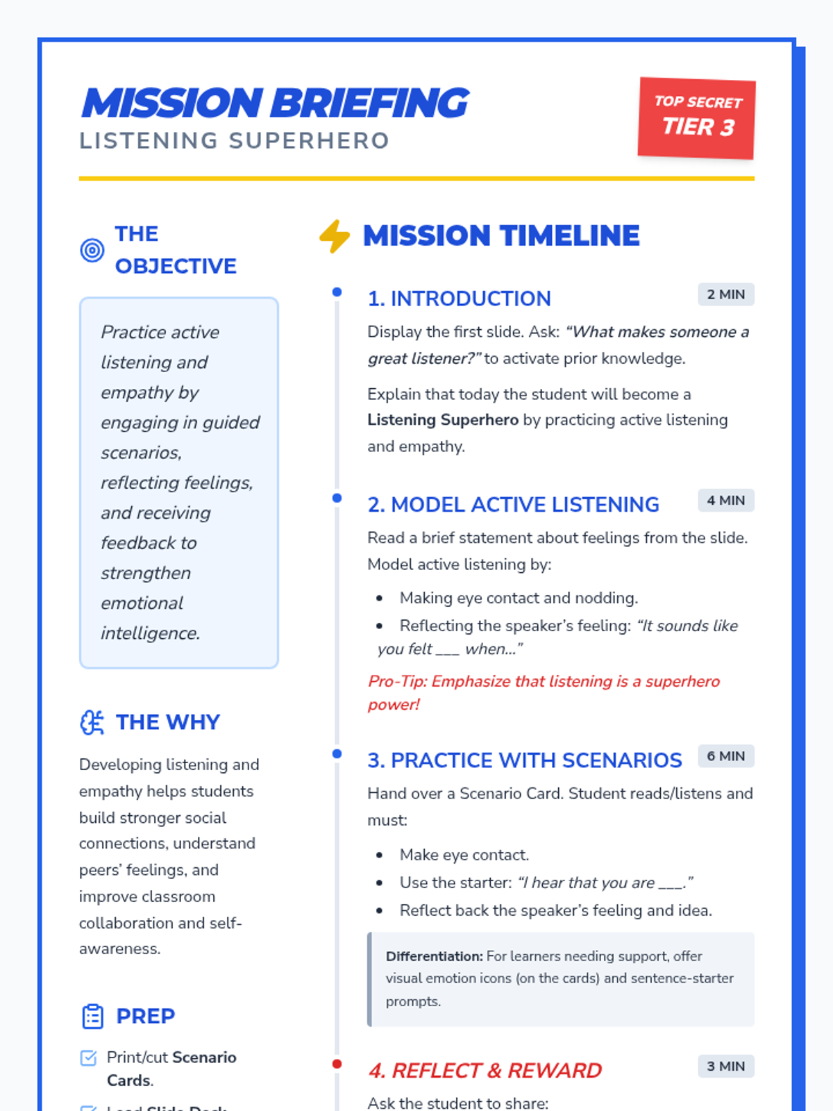 A 15-minute individualized mini-lesson for 3rd graders to develop active listening and empathy through modeling, practice scenarios, and reflection.