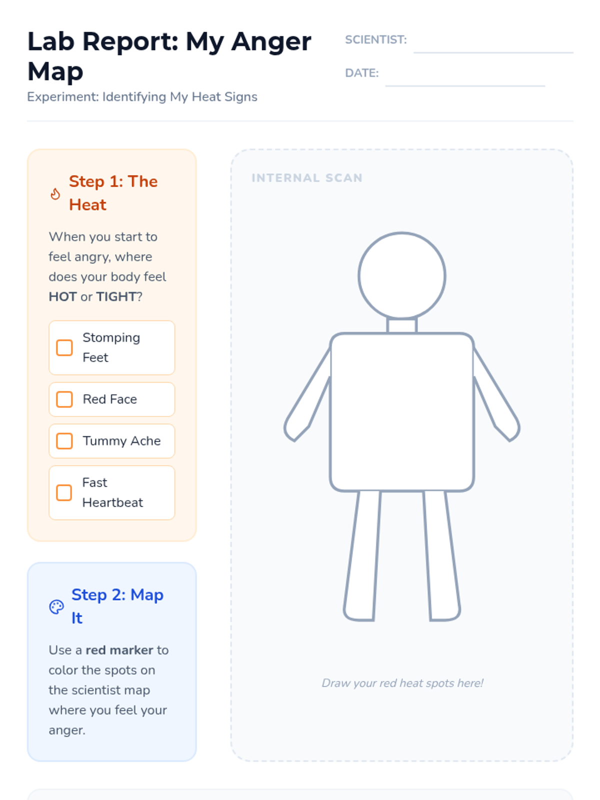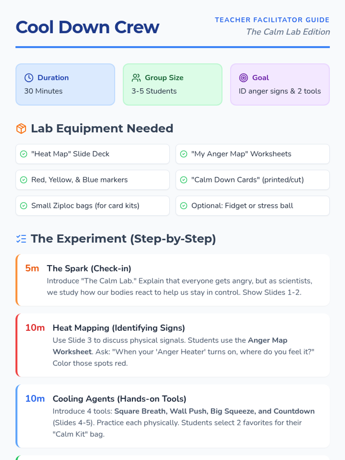 A 30-minute small group session focused on recognizing physical signs of anger and practicing concrete cooling strategies using visual and hands-on tools.