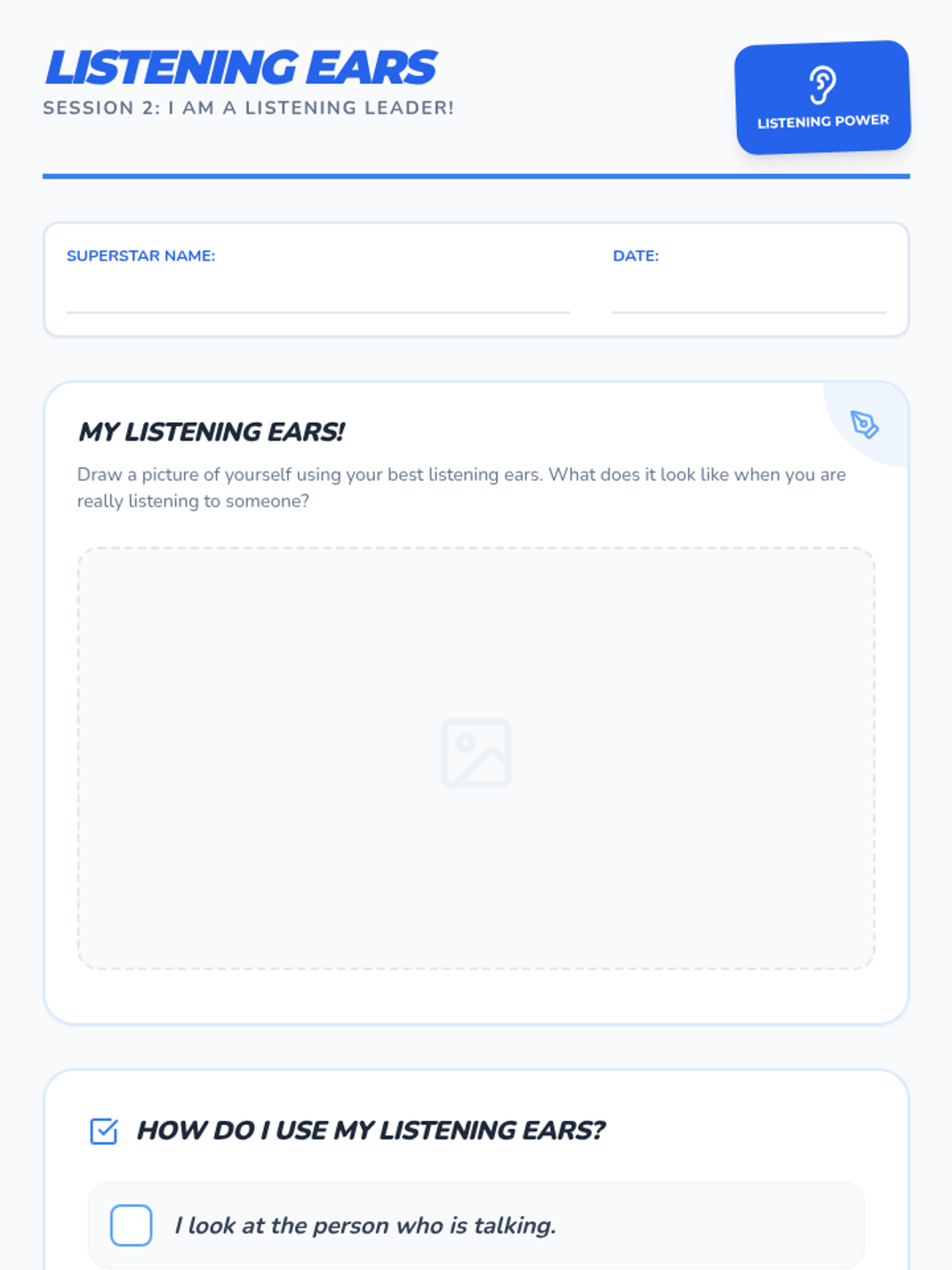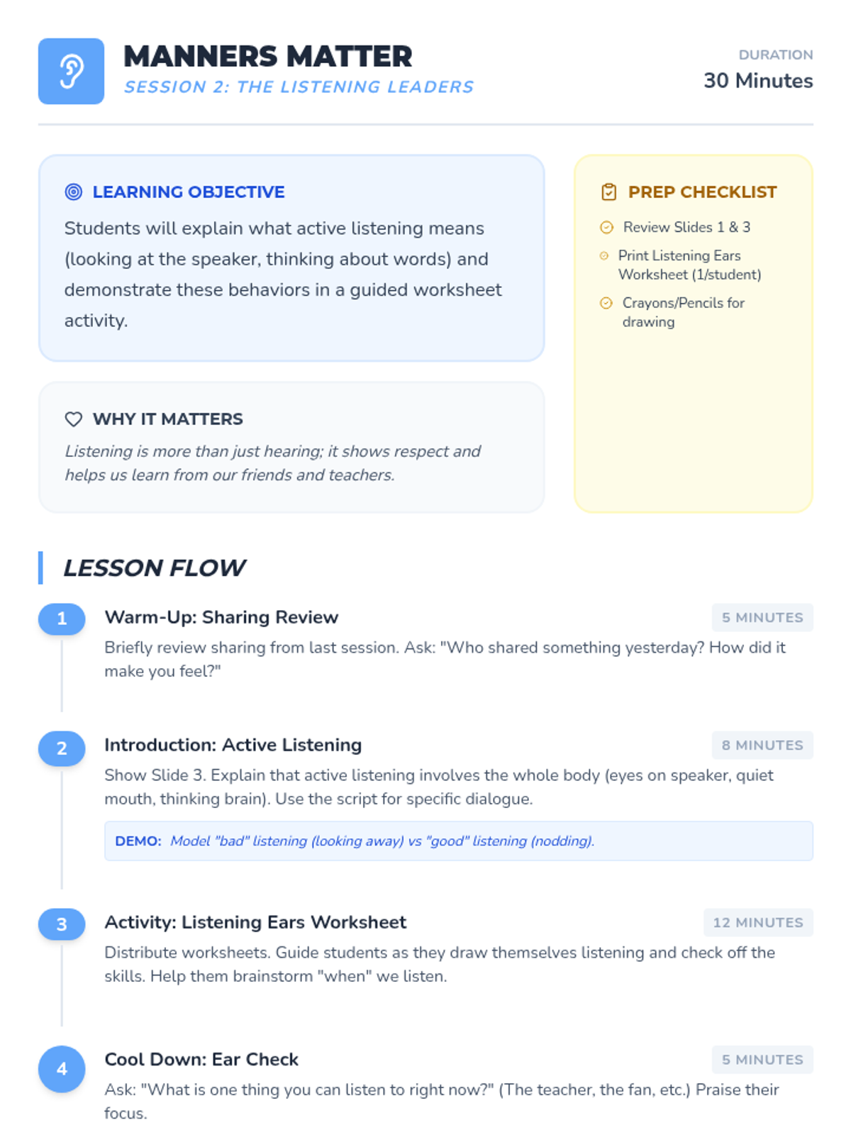 The second session focuses on active listening, teaching students how to use their 'listening ears' to show respect and understand others. Students will practice these skills through modeling and guided worksheets.