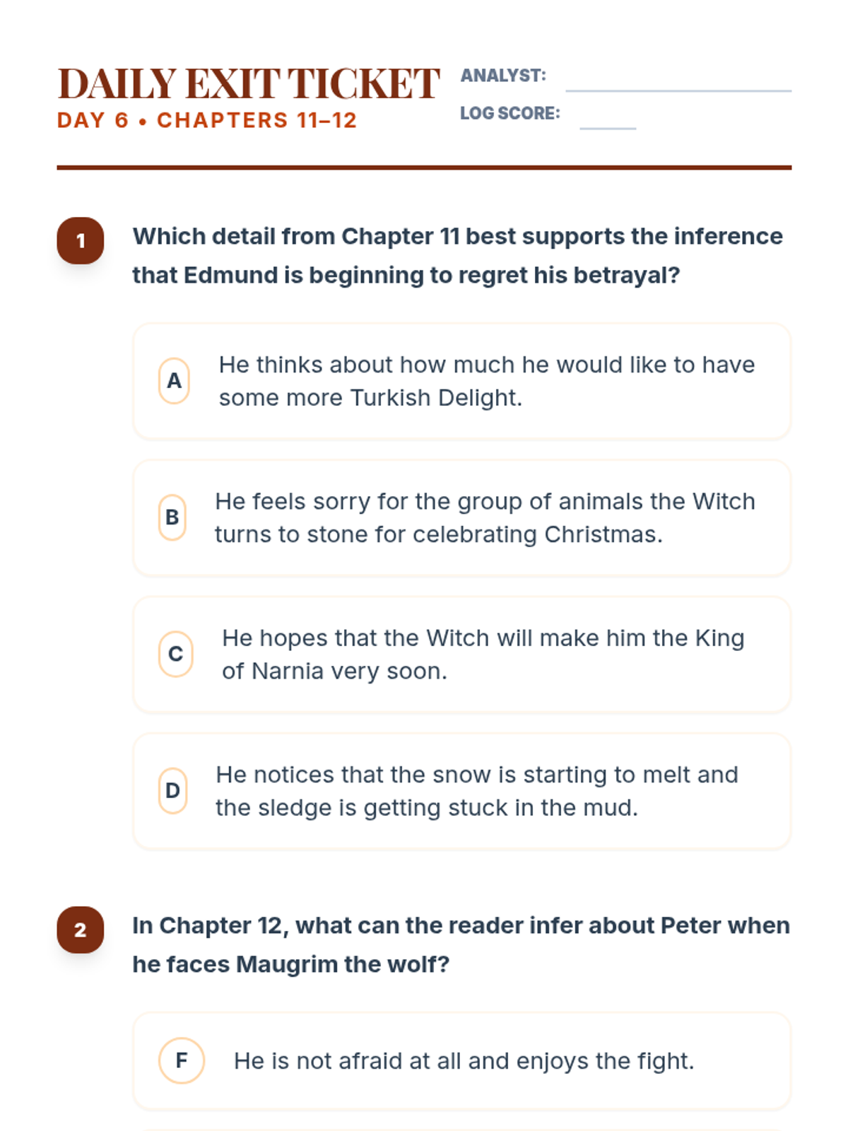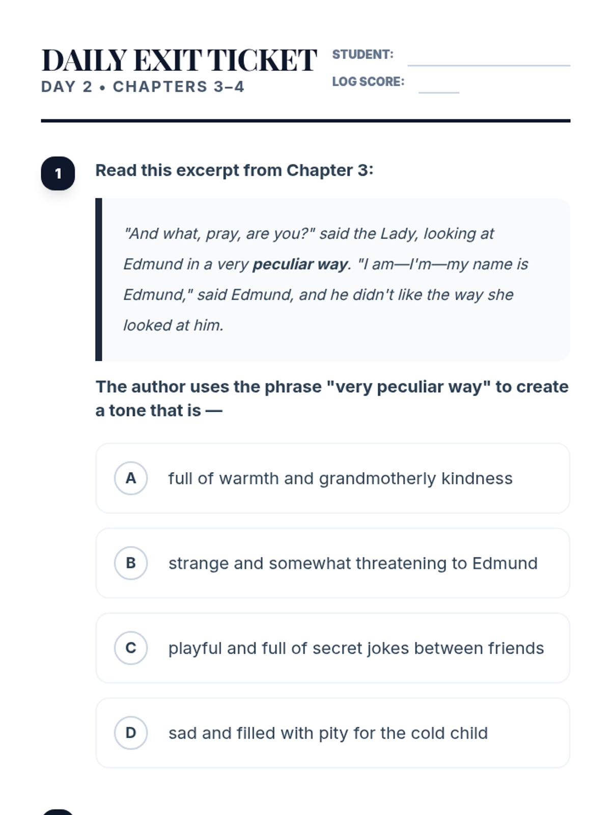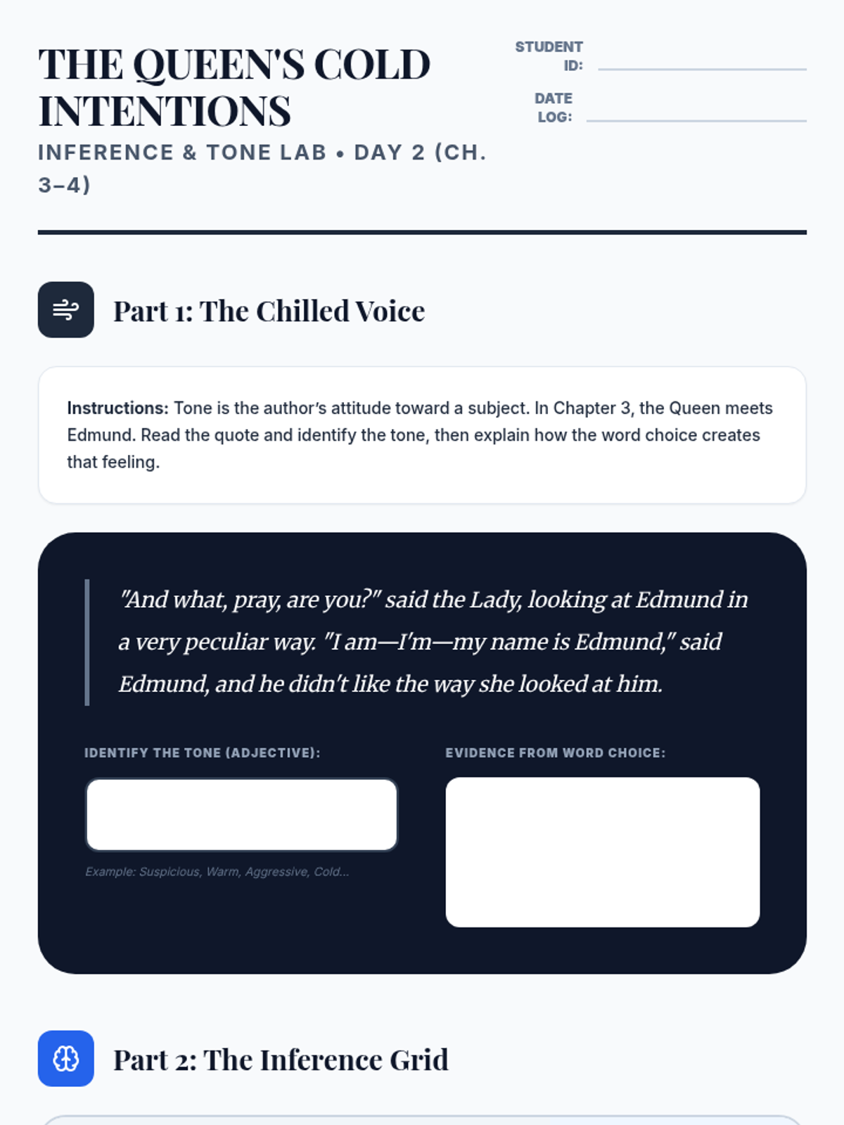 Day 2: Chapters 3-4. Edmund's entry into Narnia and his meeting with the White Witch, focusing on making inferences and identifying author's tone.