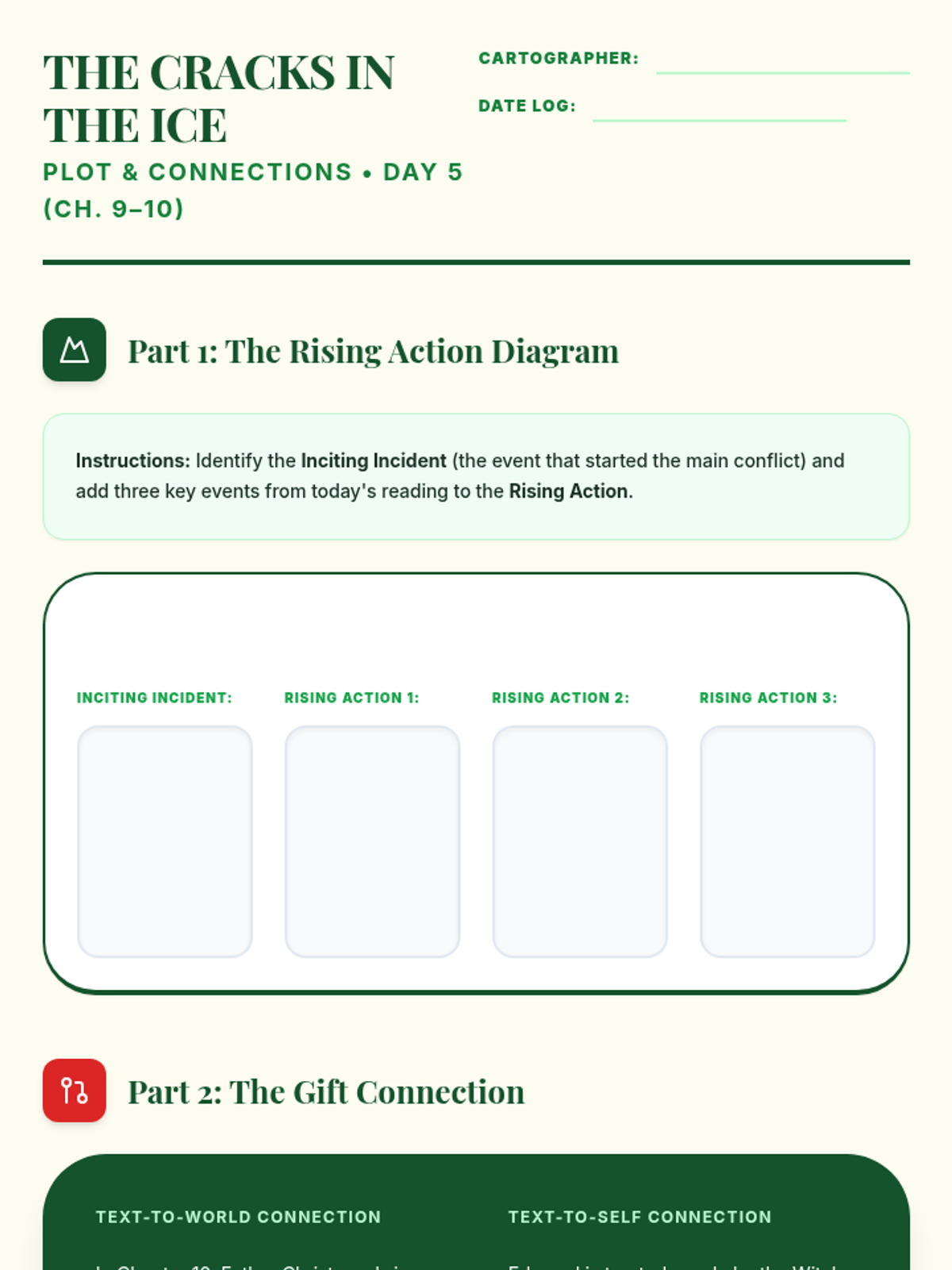 Day 5: Chapters 9-10. Edmund's journey to the Witch's castle and the arrival of Father Christmas, focusing on plot structure and making connections.