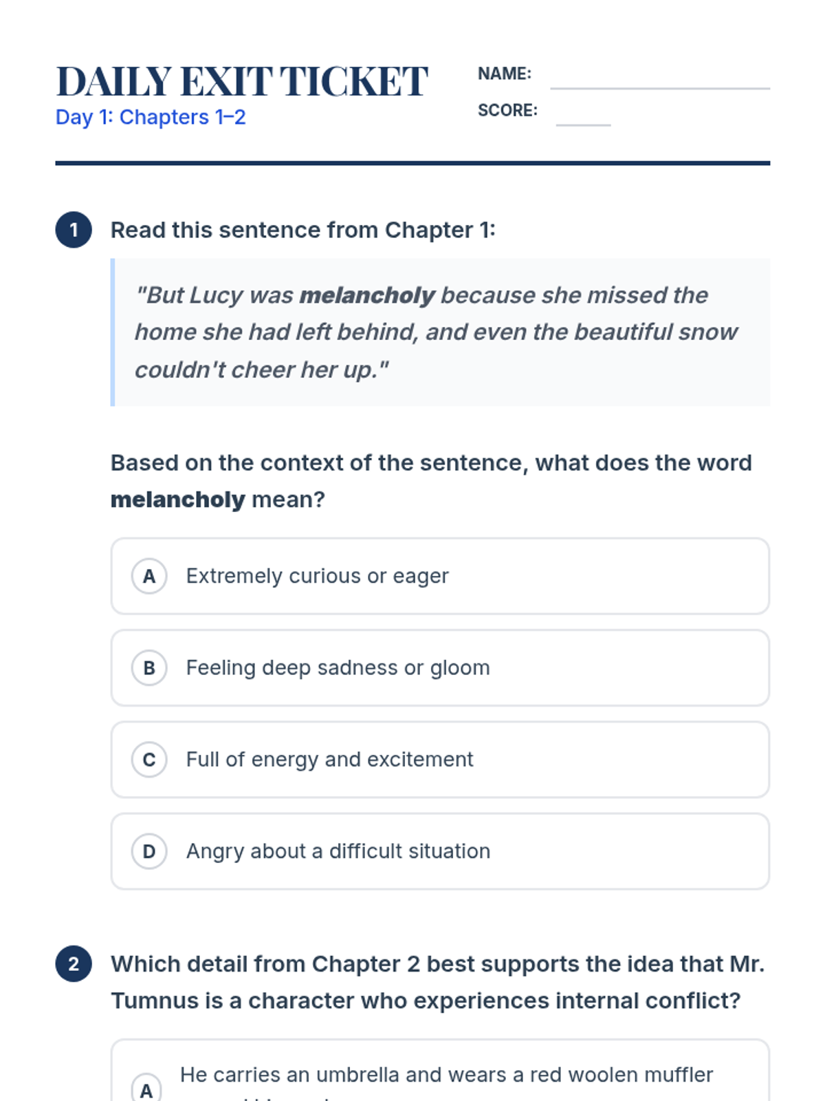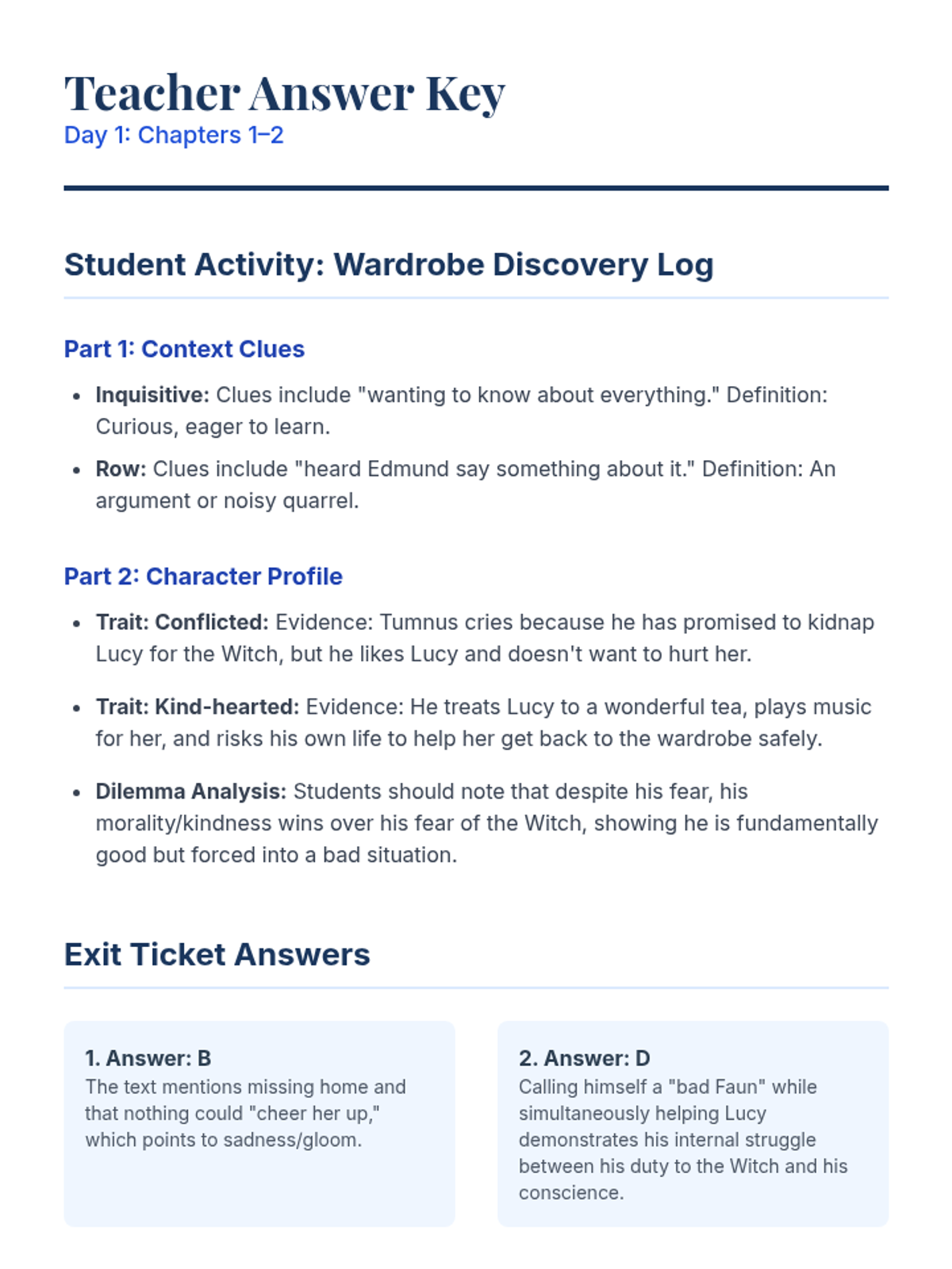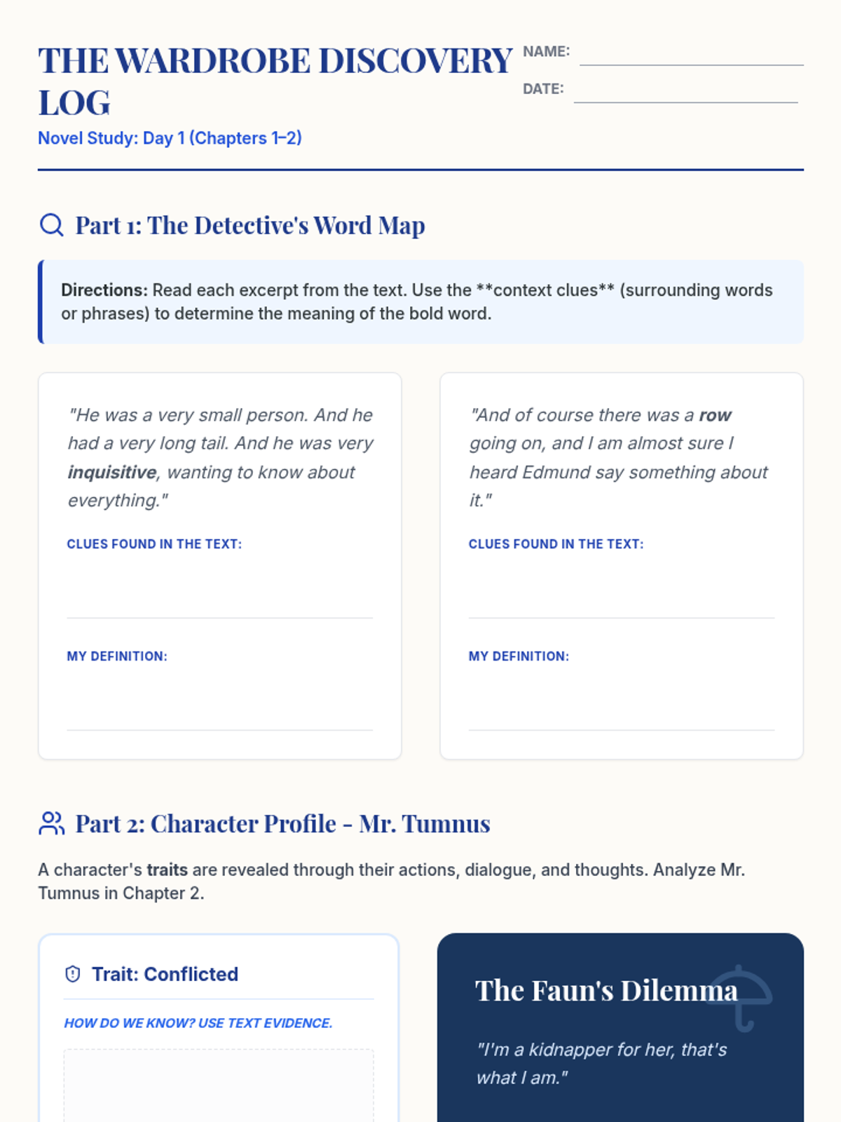 Day 1: Chapters 1-2. Exploring the arrival in Narnia and the first encounter with Mr. Tumnus, focusing on context clues and character traits.