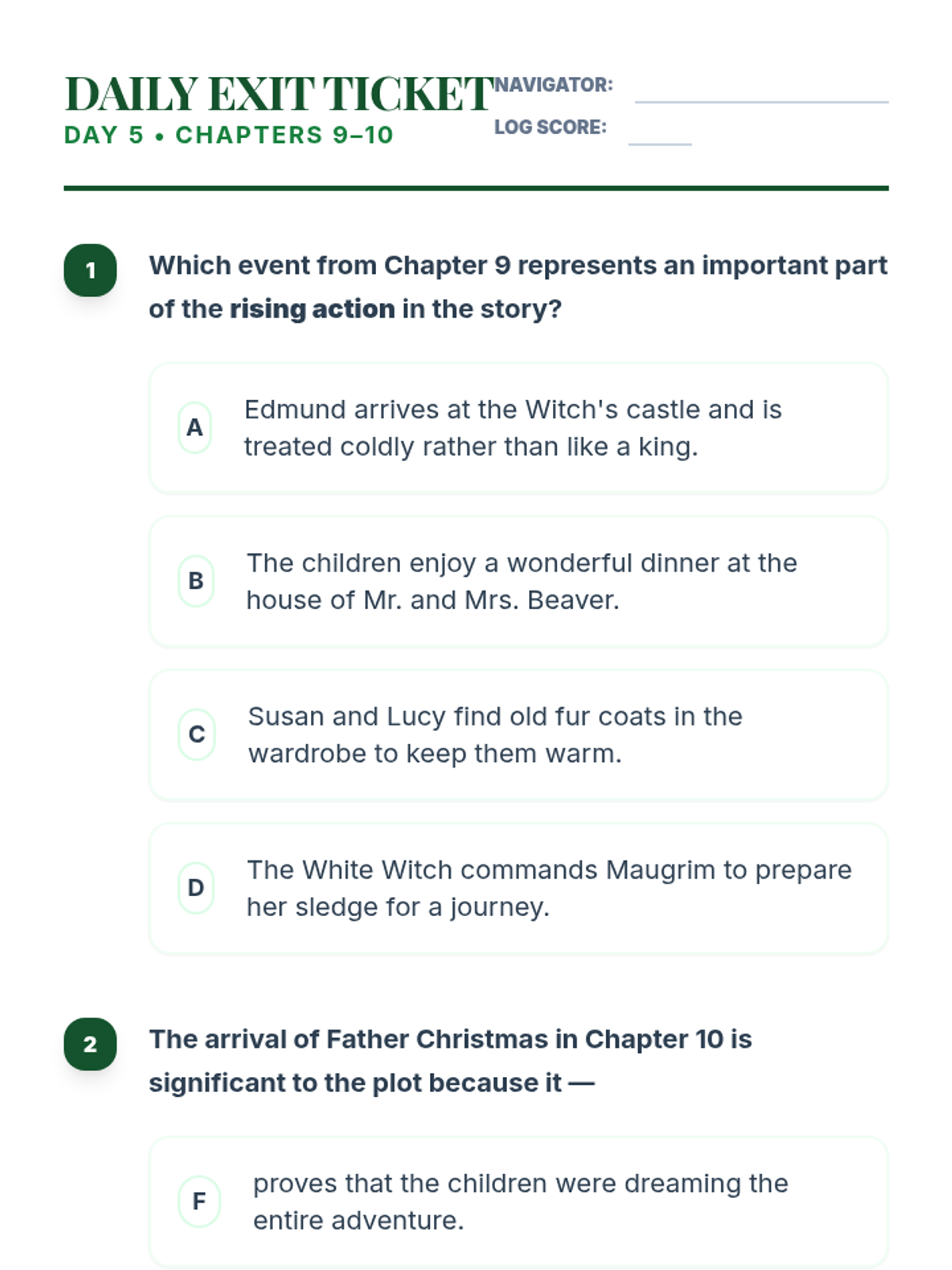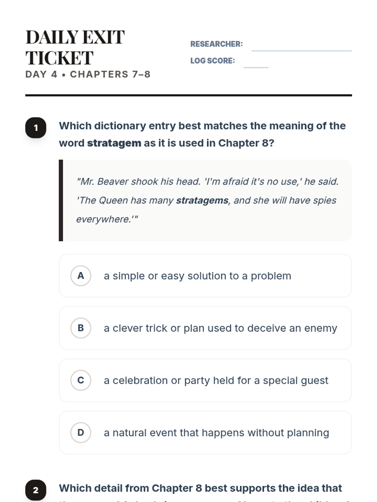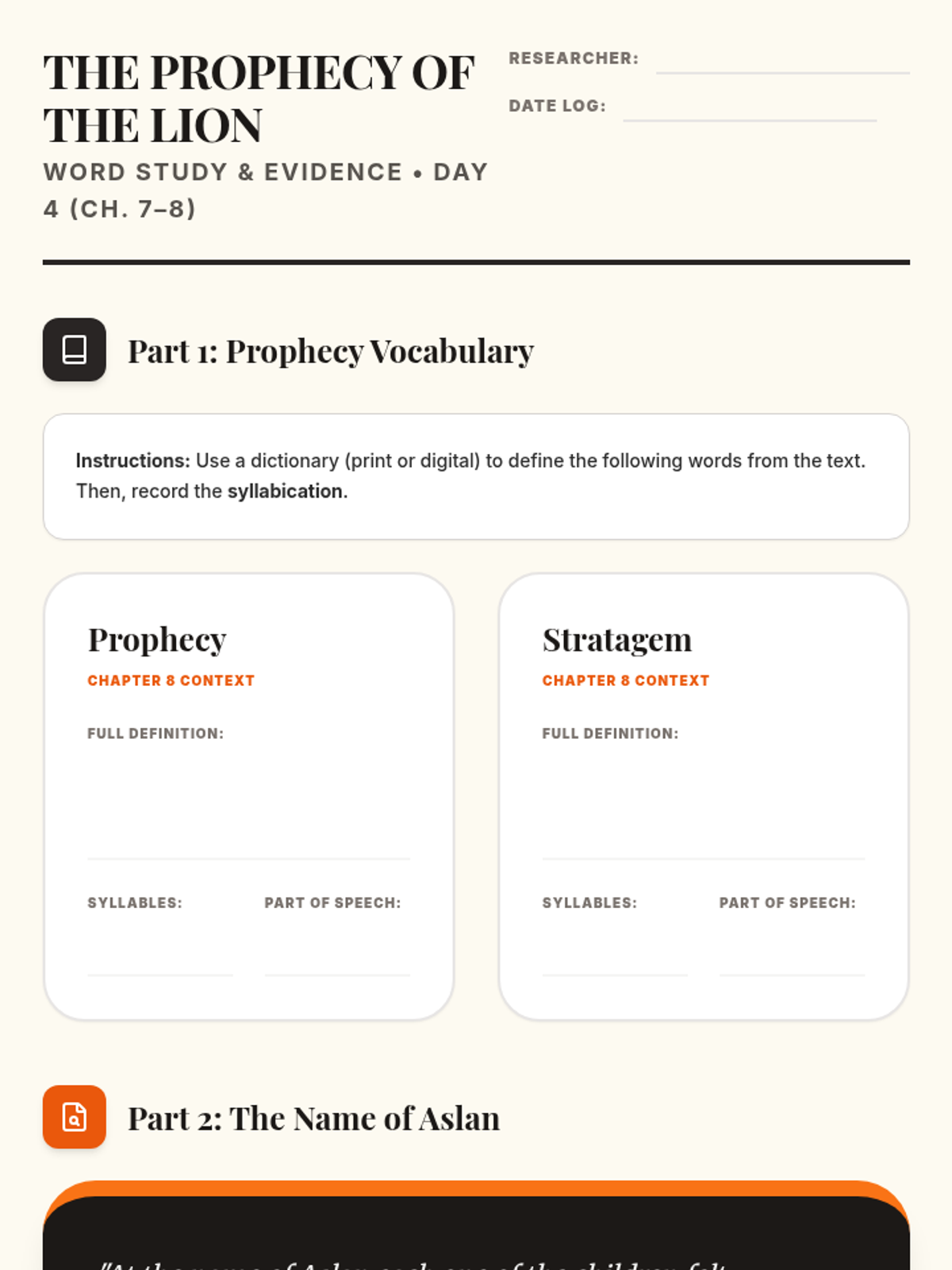 Day 4: Chapters 7-8. The children meet the Beavers and hear the prophecy of Aslan, focusing on word study and using text evidence.