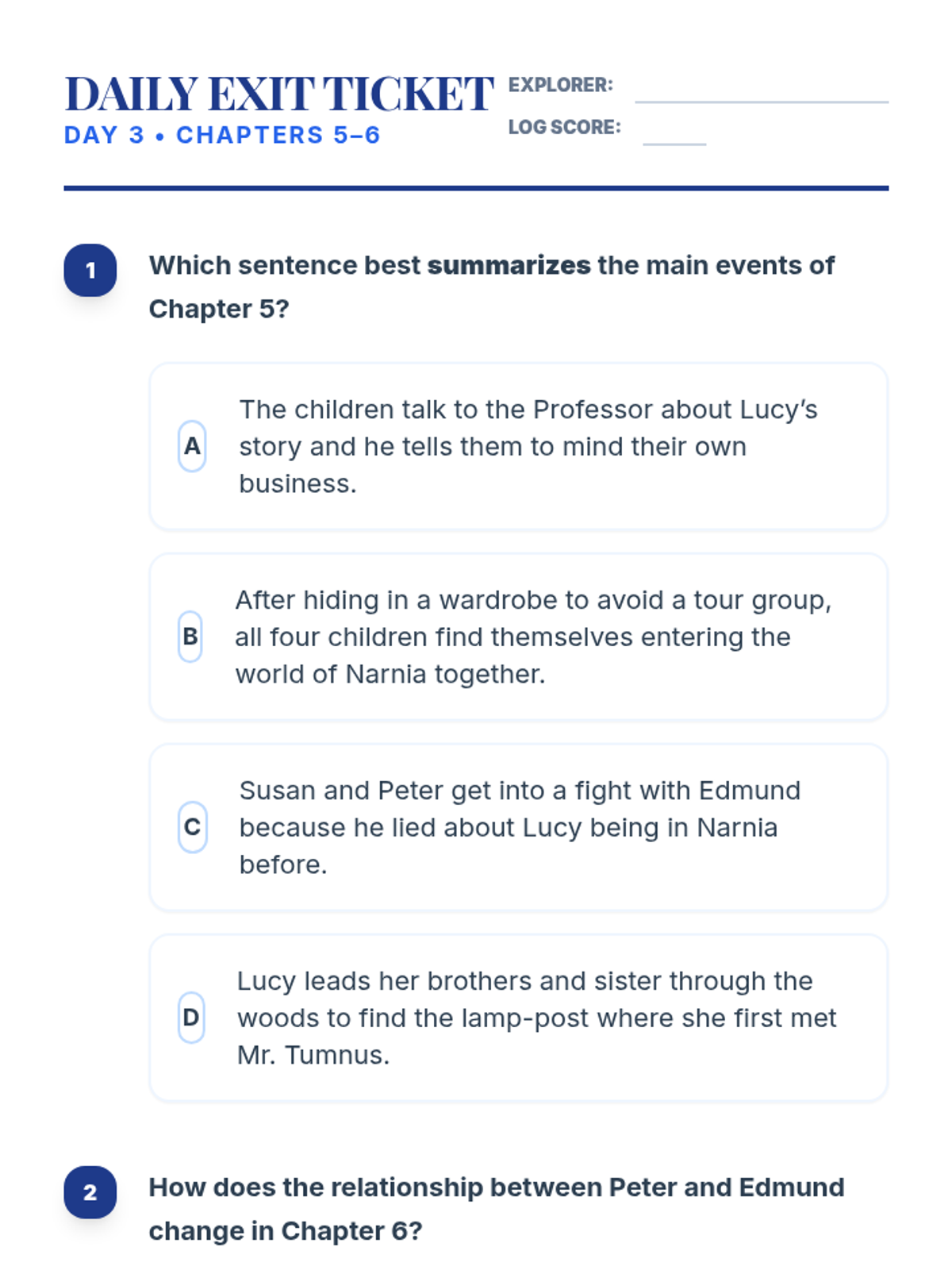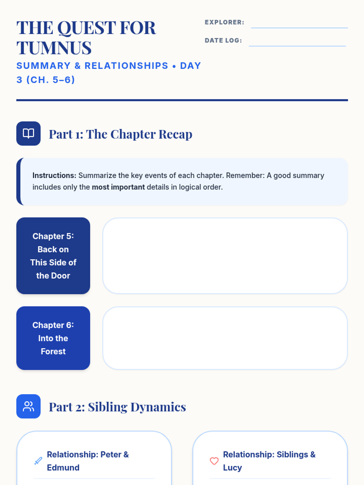 Day 3: Chapters 5-6. All four children enter Narnia and discover Mr. Tumnus's fate, focusing on summarizing and character relationships.