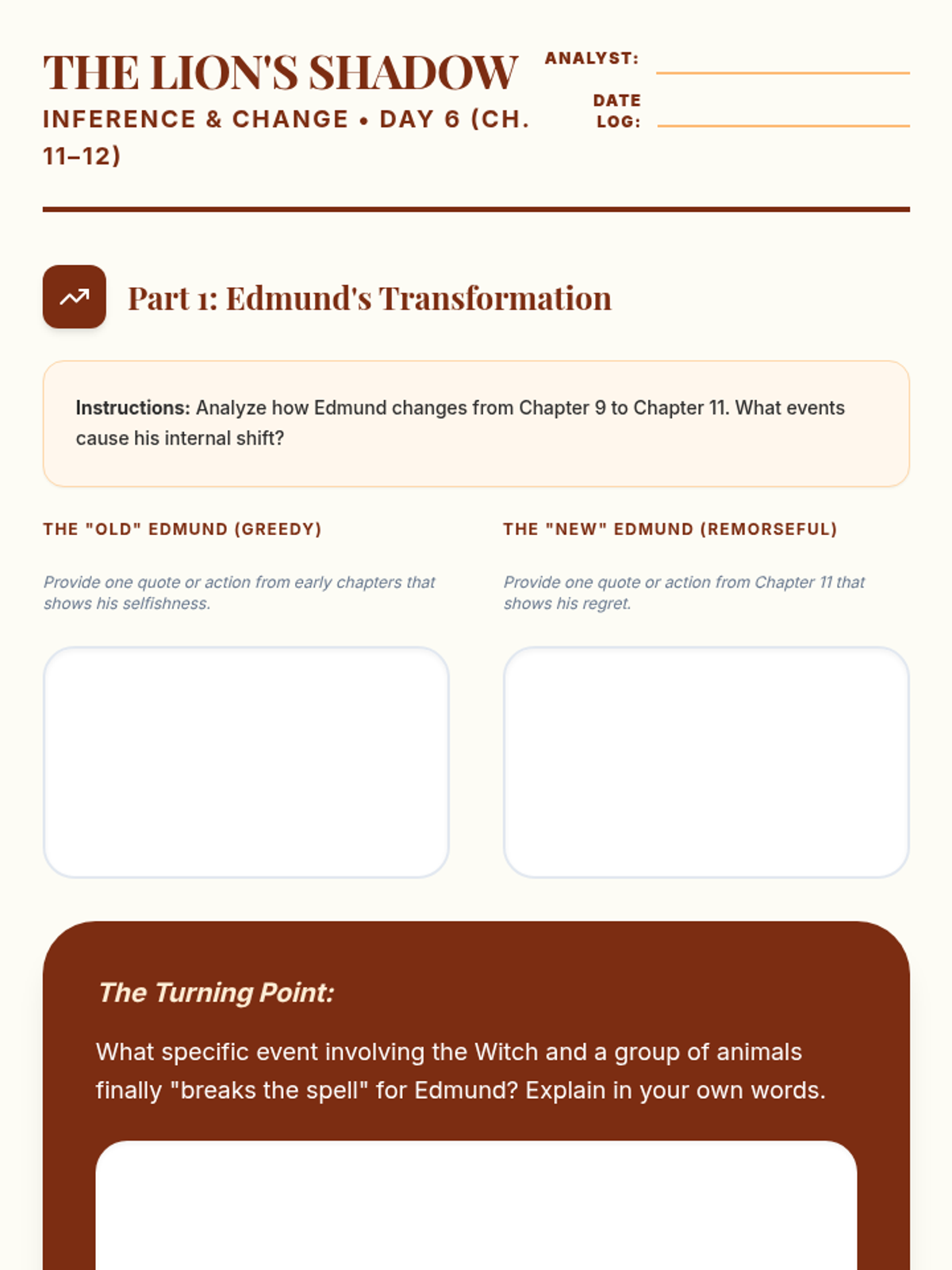 Day 6: Chapters 11-12. The melting of the snow and the first meeting with Aslan, focusing on character change and inference.