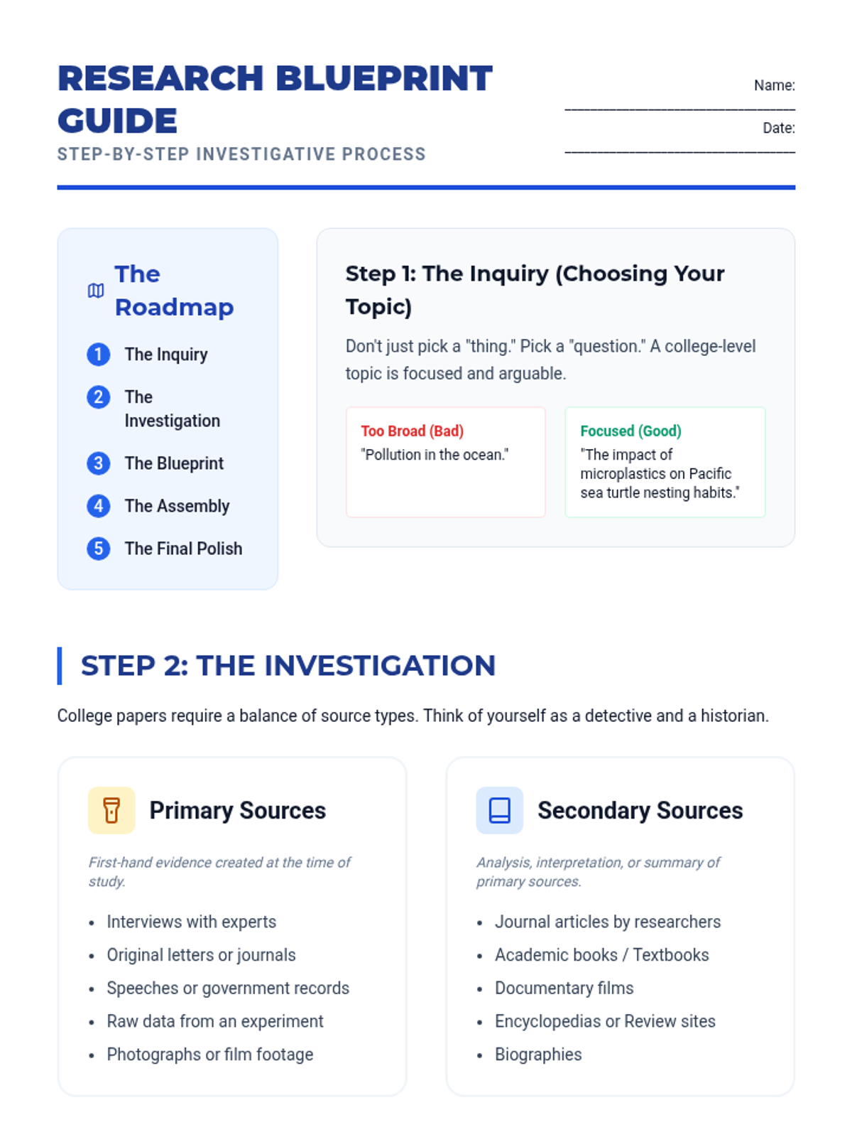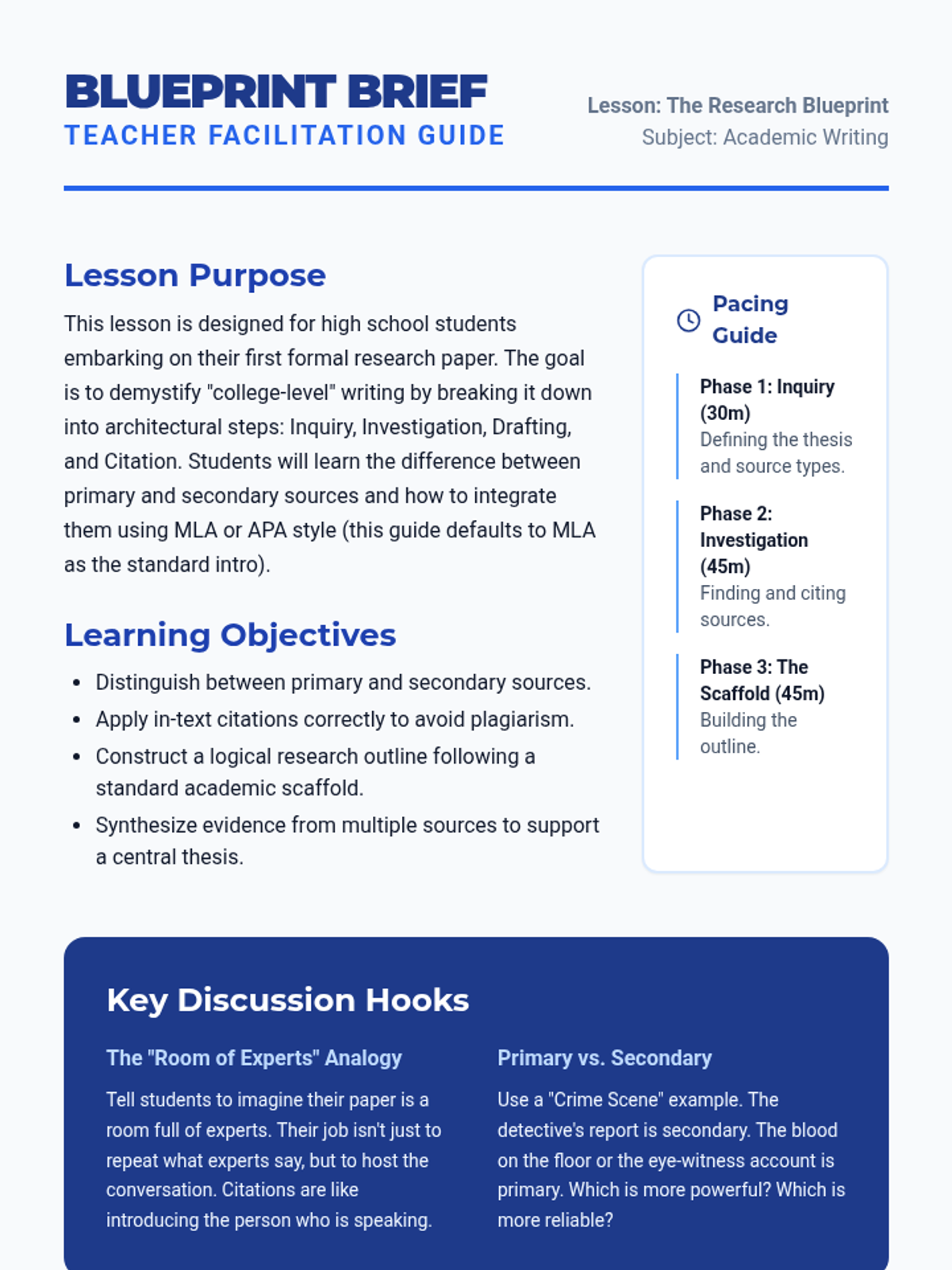 A foundational lesson designed to guide high school students through the complex process of writing their first academic research paper. It covers source evaluation, citation mechanics, and structural outlining with a focus on transitioning toward college-level standards.