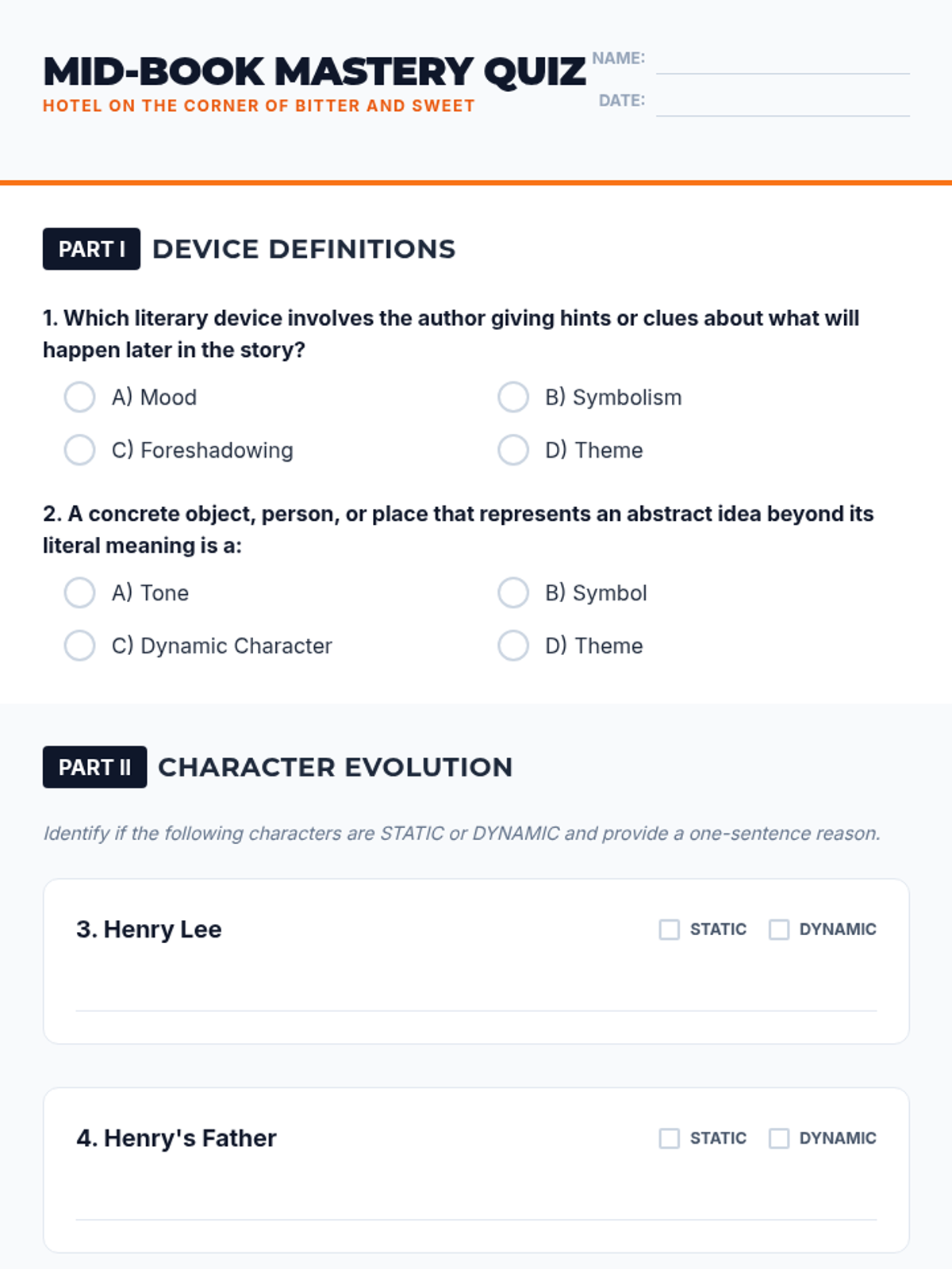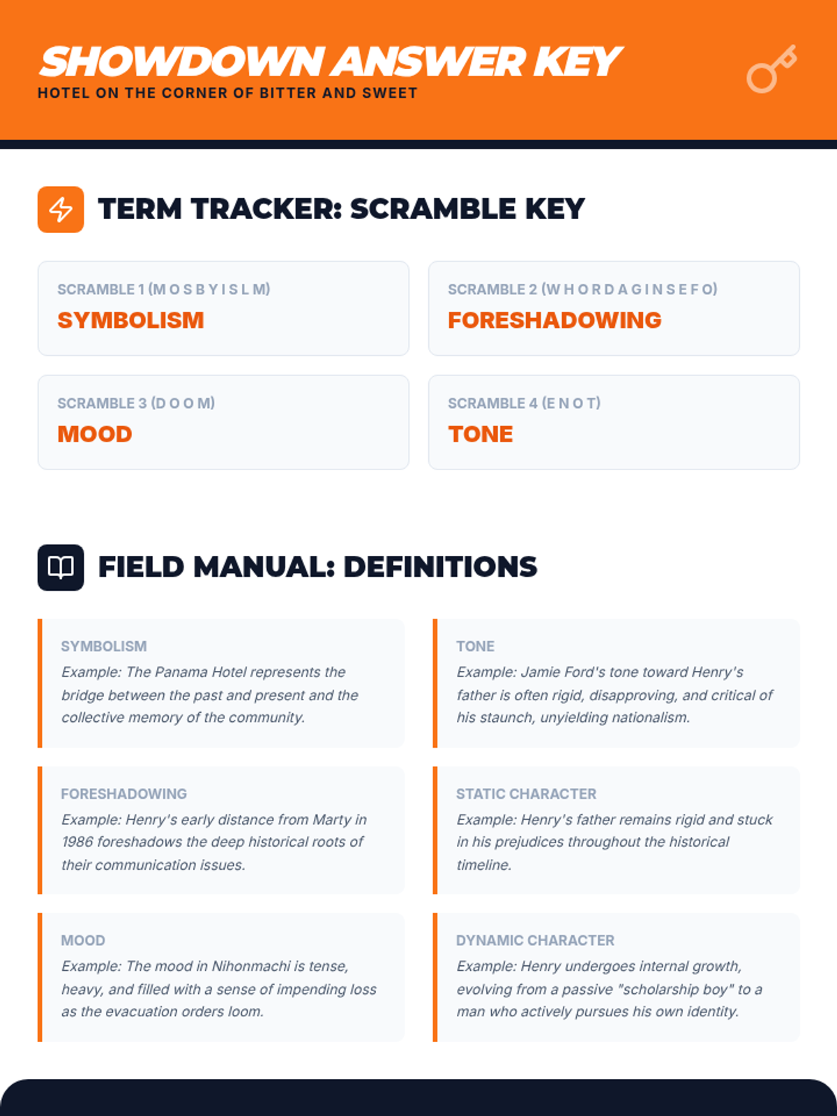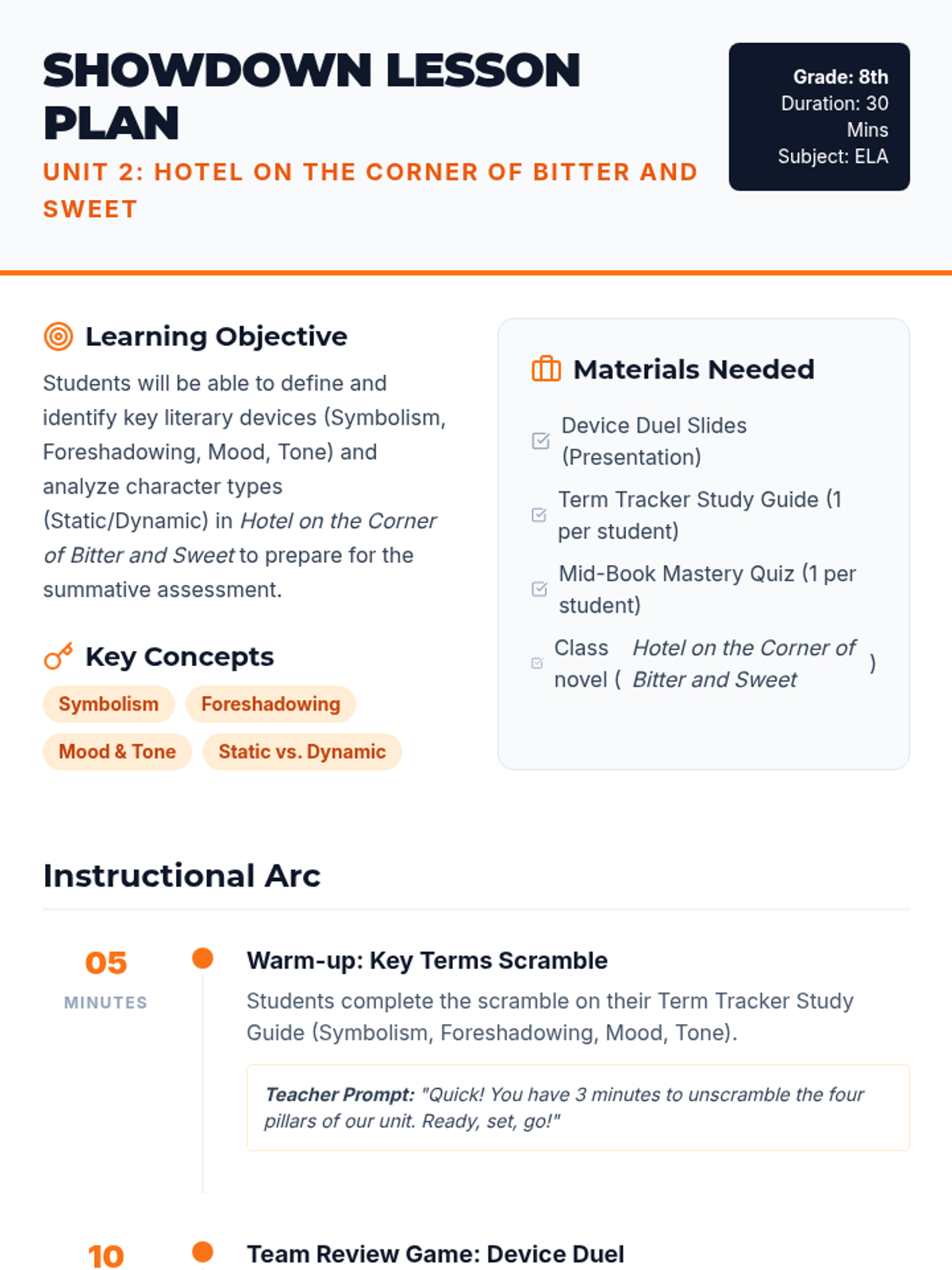 A fast-paced, high-energy review lesson designed to prepare 8th-grade students for their summative assessment on literary devices and themes. Students engage in a competitive "showdown" to identify flashback, symbolism, foreshadowing, and theme within their current novel study.