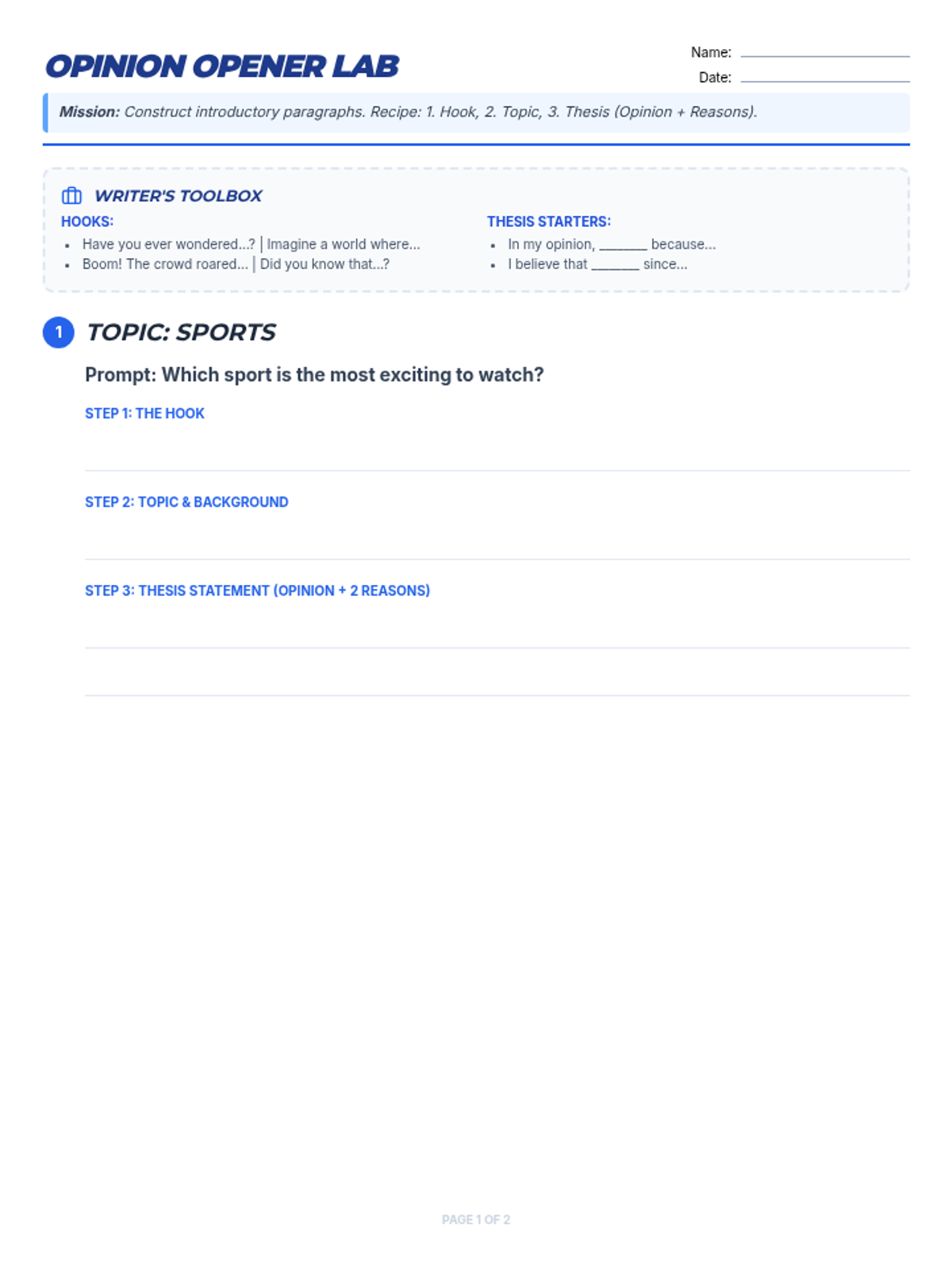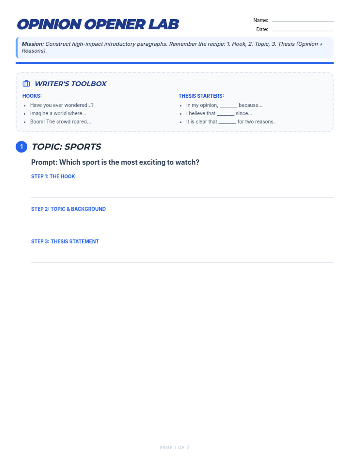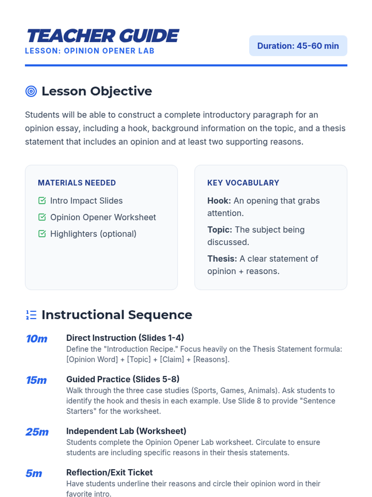 A lesson focused on mastering the art of the introductory paragraph in opinion writing, specifically focusing on hooks, topic introduction, and thesis statements.