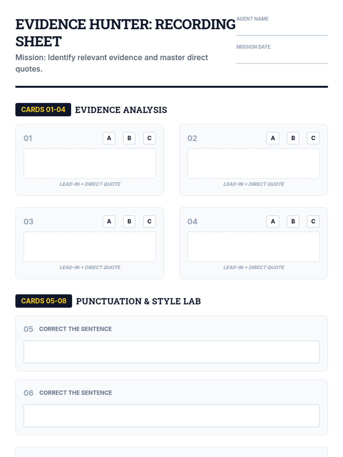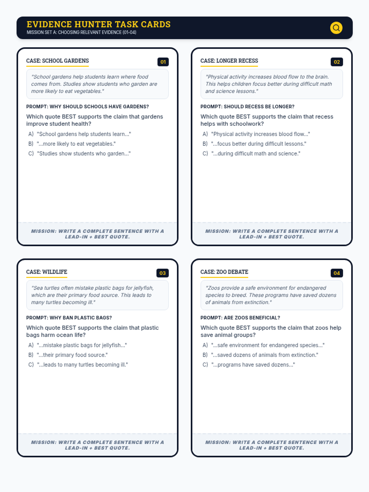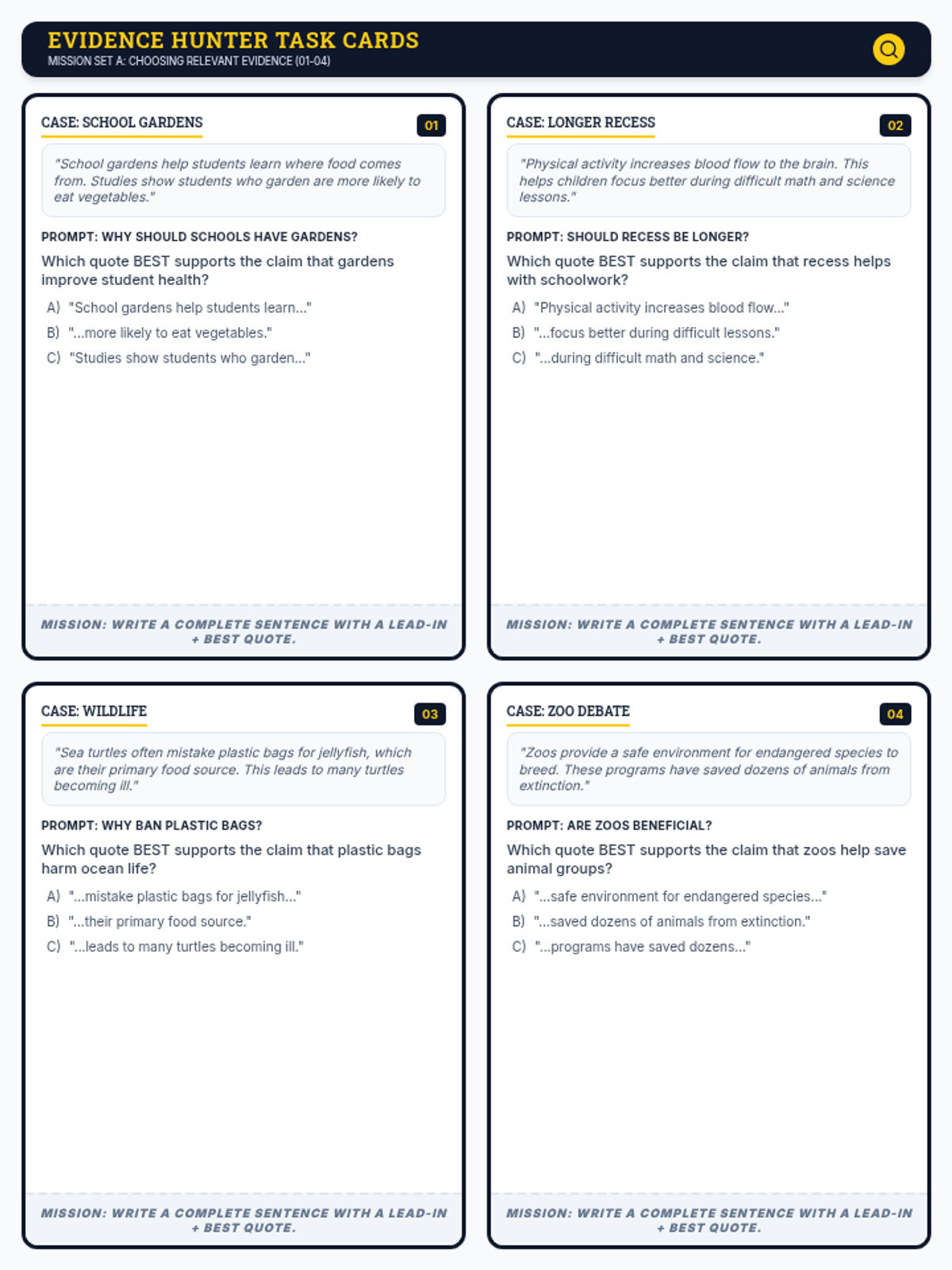 A focused practice session on identifying relevant textual evidence and correctly formatting direct quotes using lead-ins and punctuation within an opinion essay context.