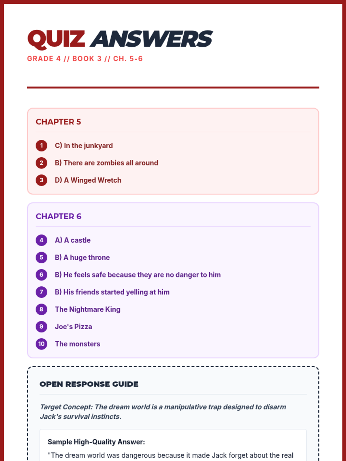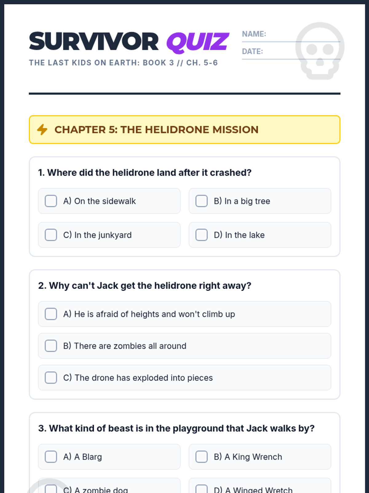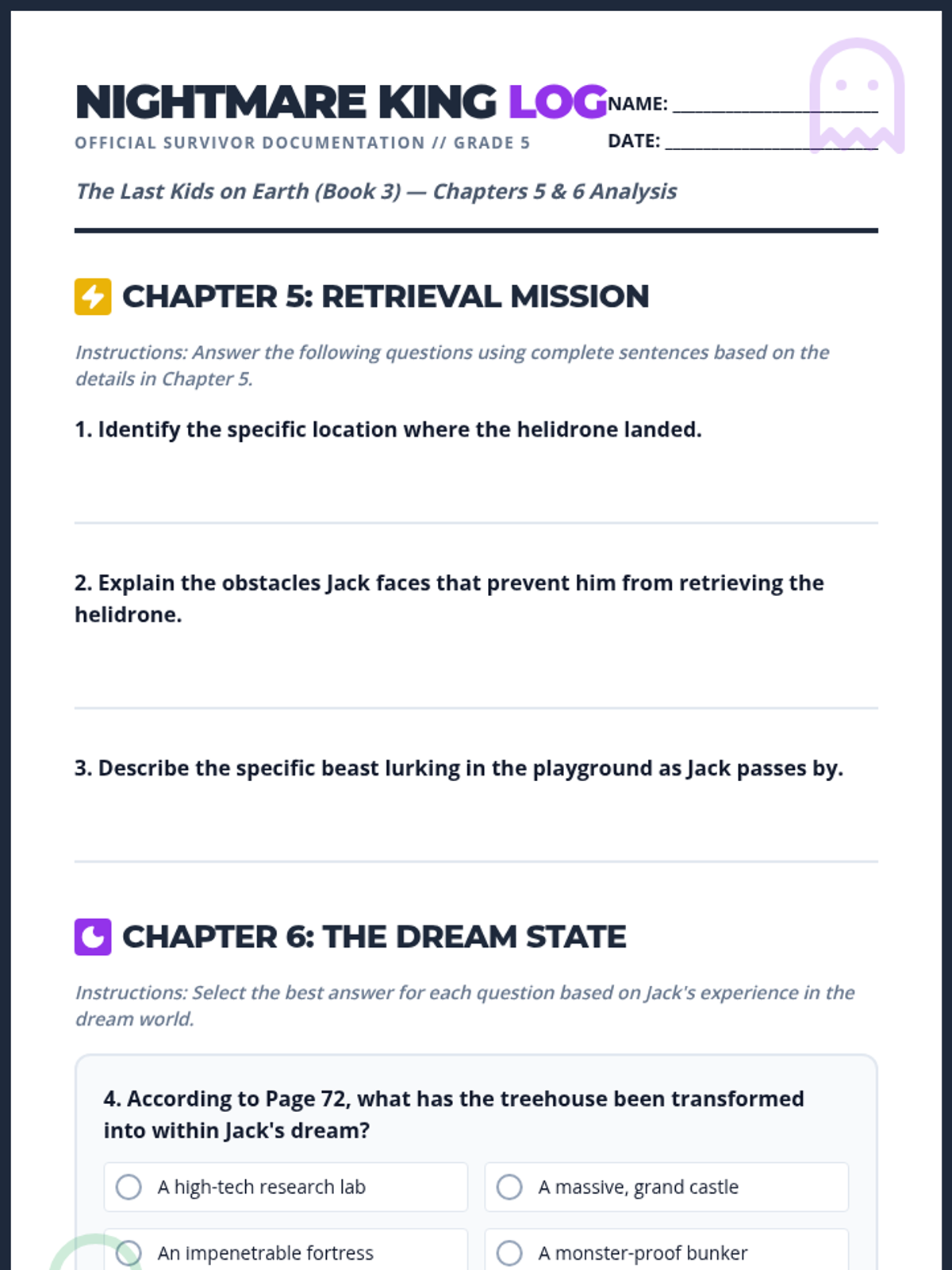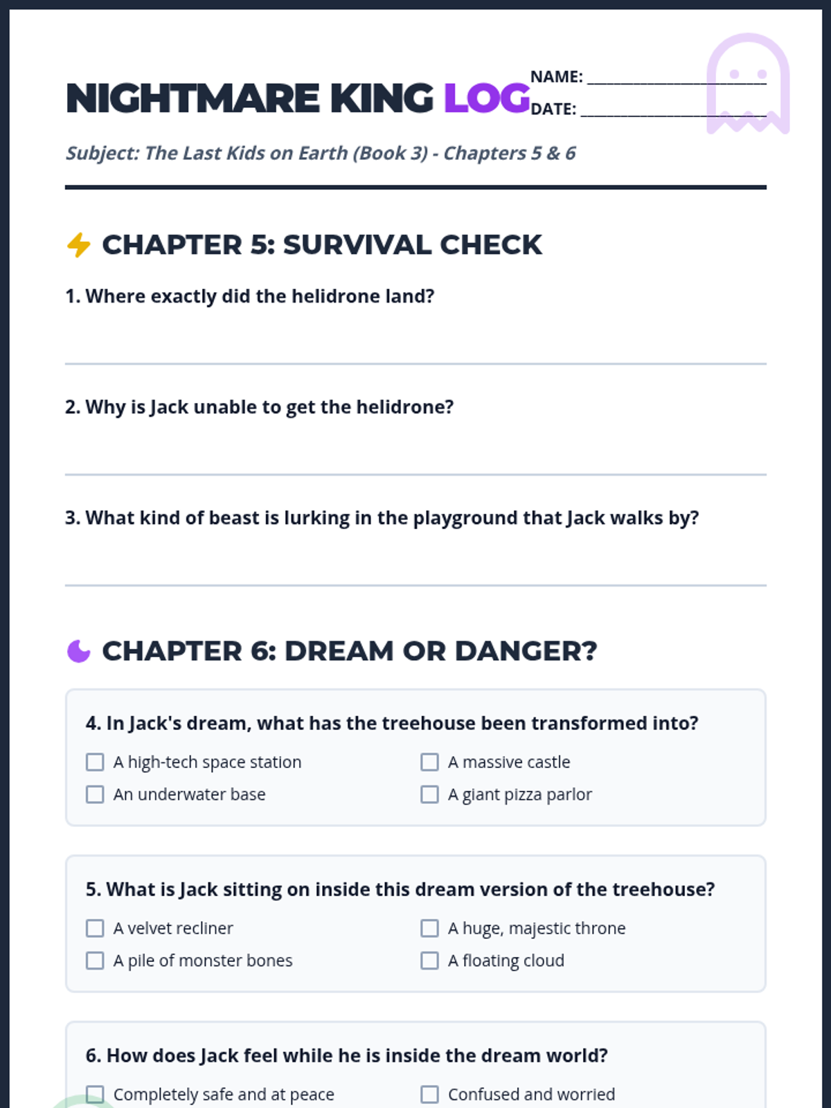 A reading comprehension set for Chapters 5 and 6 of 'The Last Kids on Earth and the Nightmare King' (Book 3), featuring short answer and multiple choice questions.