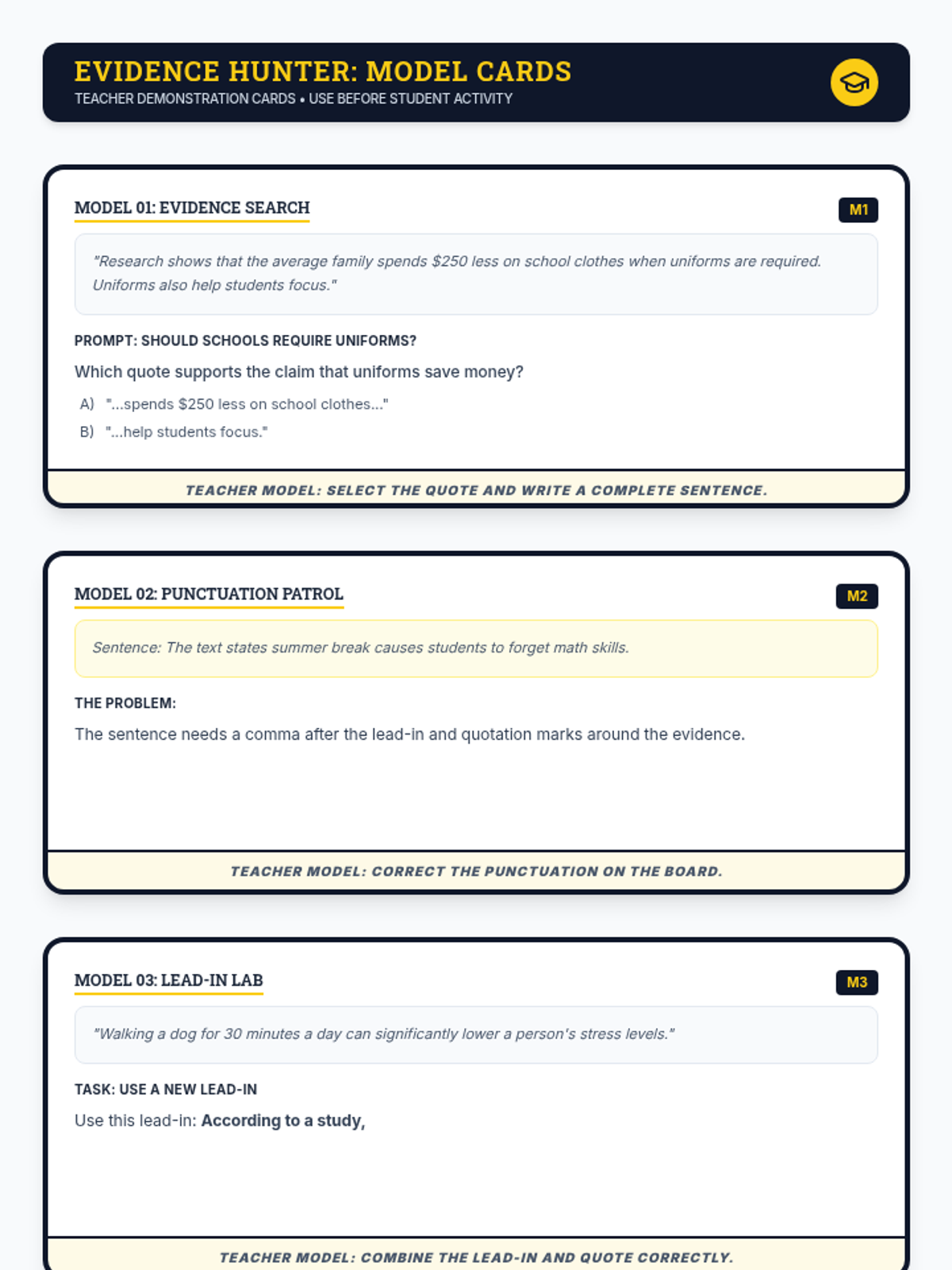 Focuses on punctuation (commas, quotation marks), identifying the main idea, and finding evidence to support an author's claim.