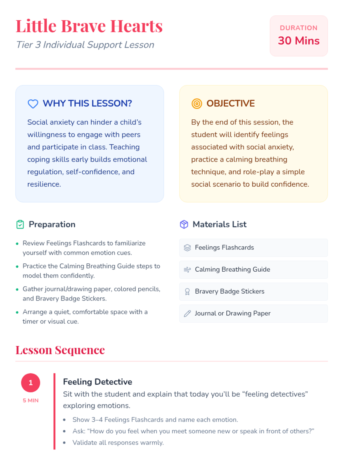 An individual 30-minute Tier 3 lesson for 2nd graders to understand and manage social anxiety through interactive discussions, calming activities, and role-play.