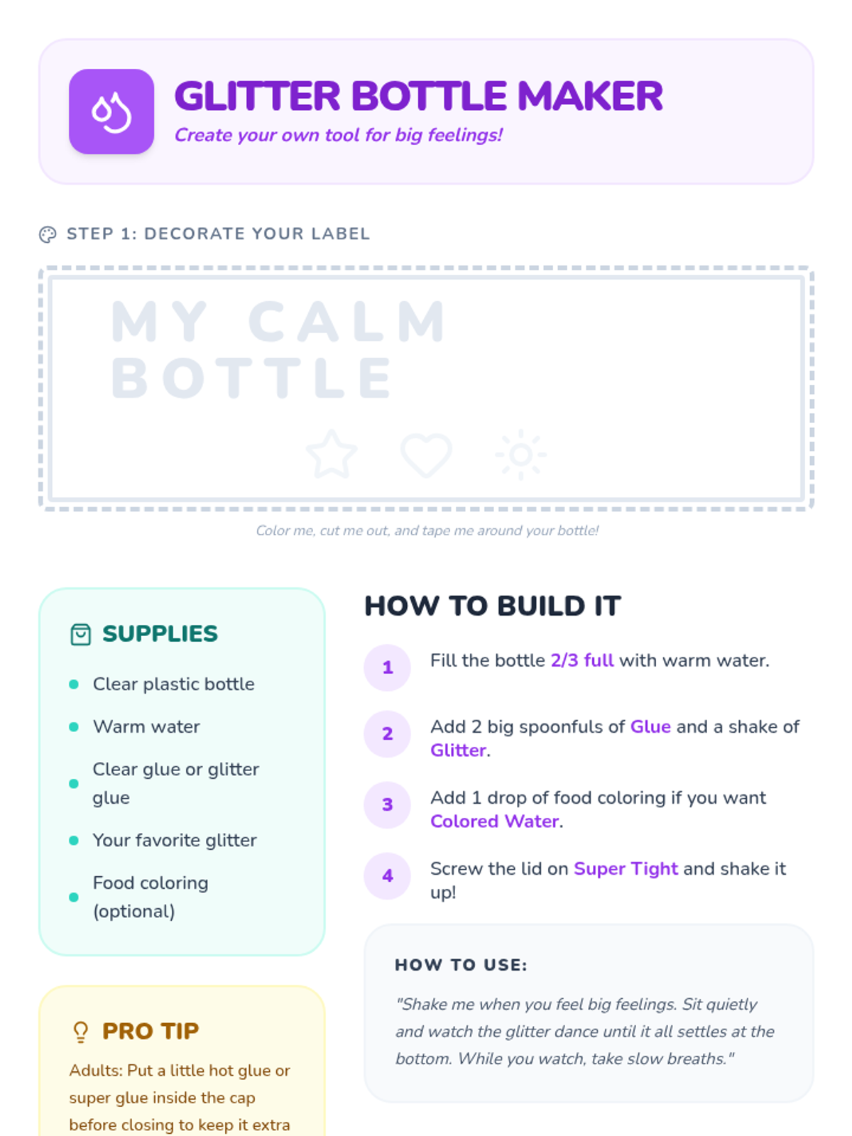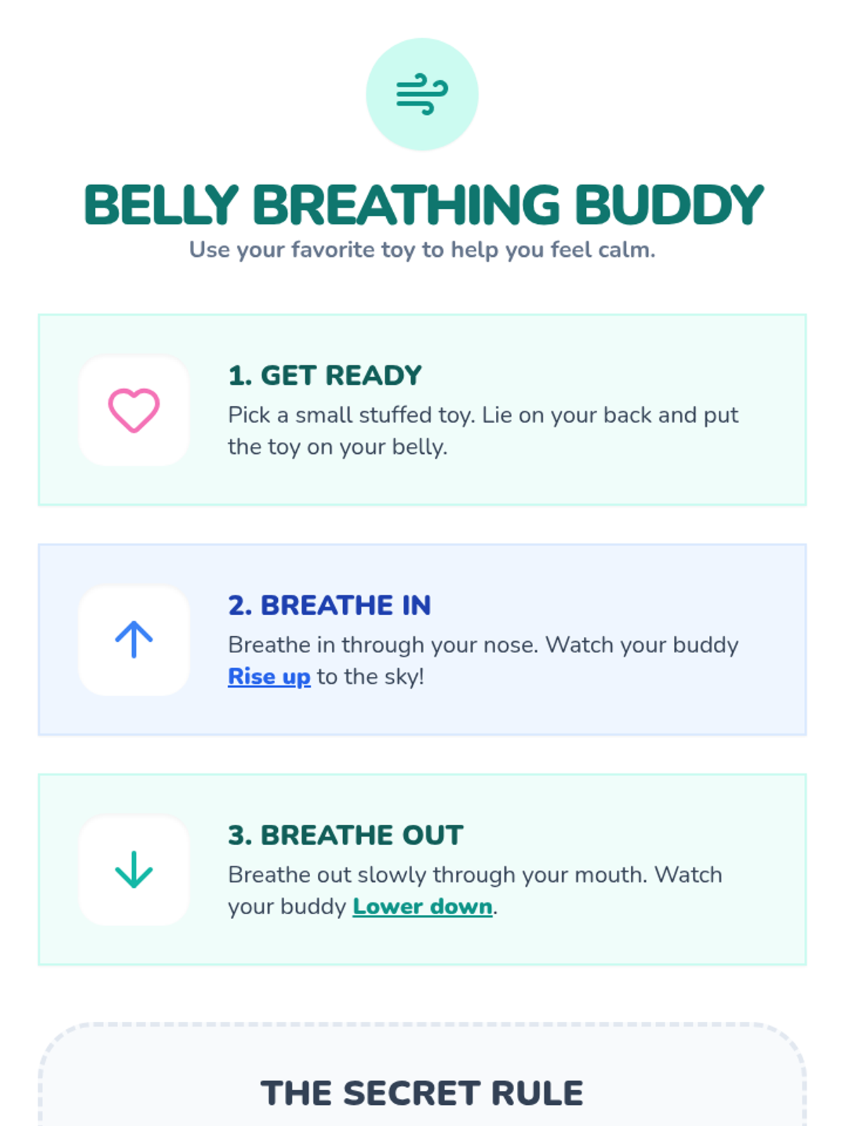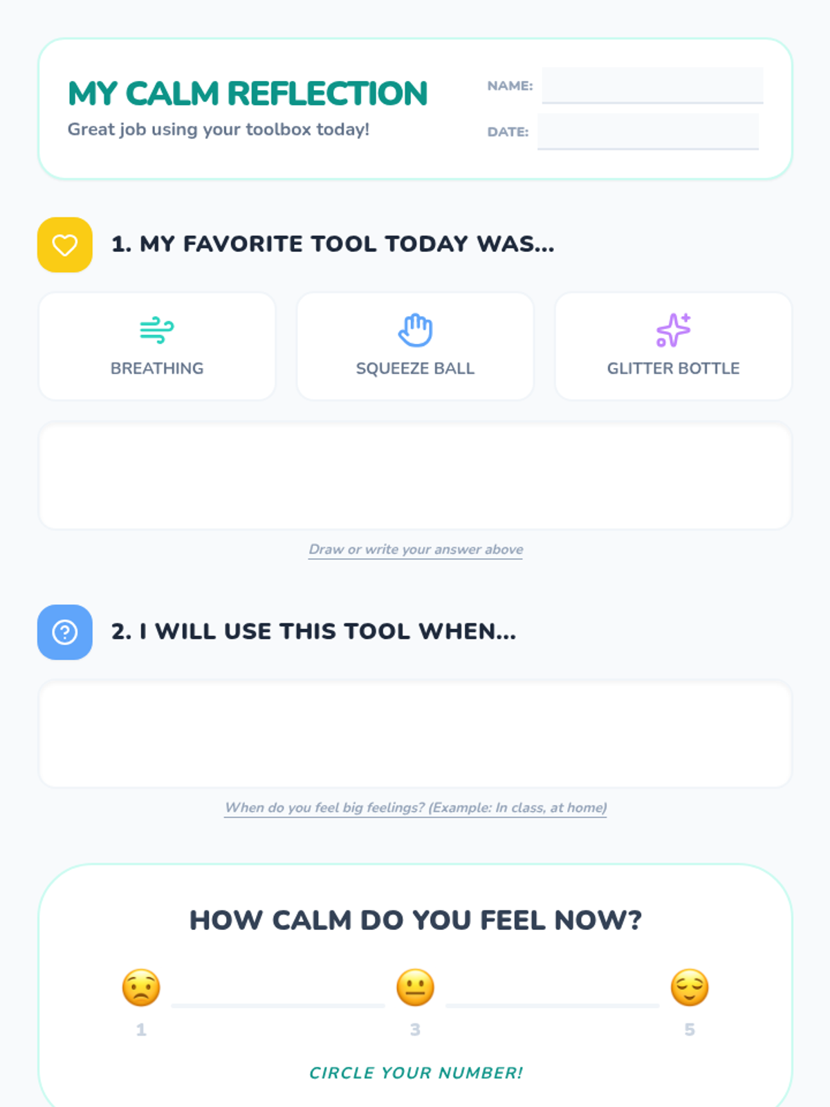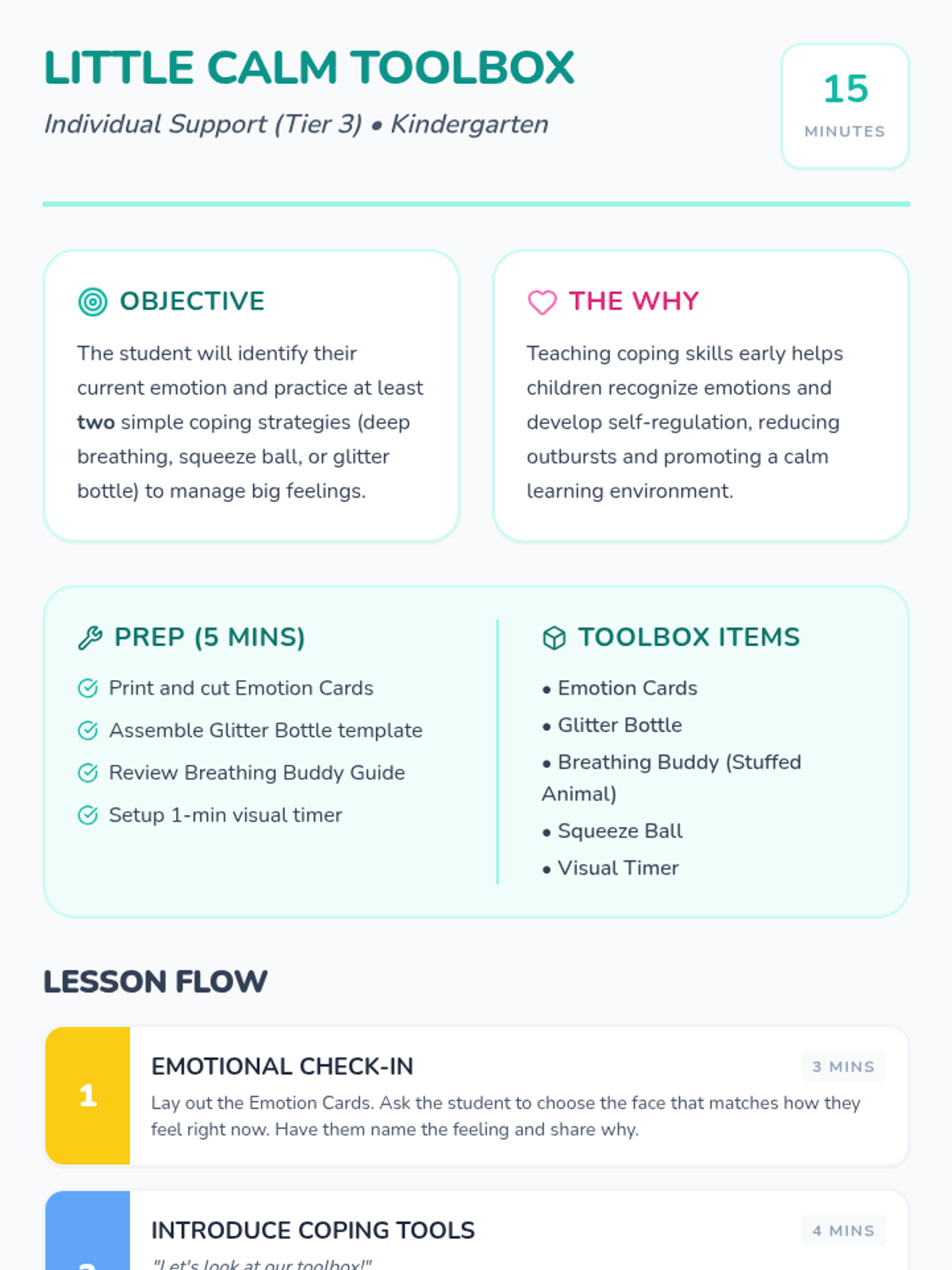 A 15-minute Tier 3 individual lesson for kindergarteners to learn and practice simple self-regulation strategies like deep breathing and sensory tools.