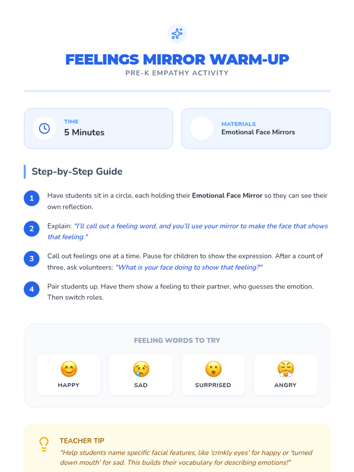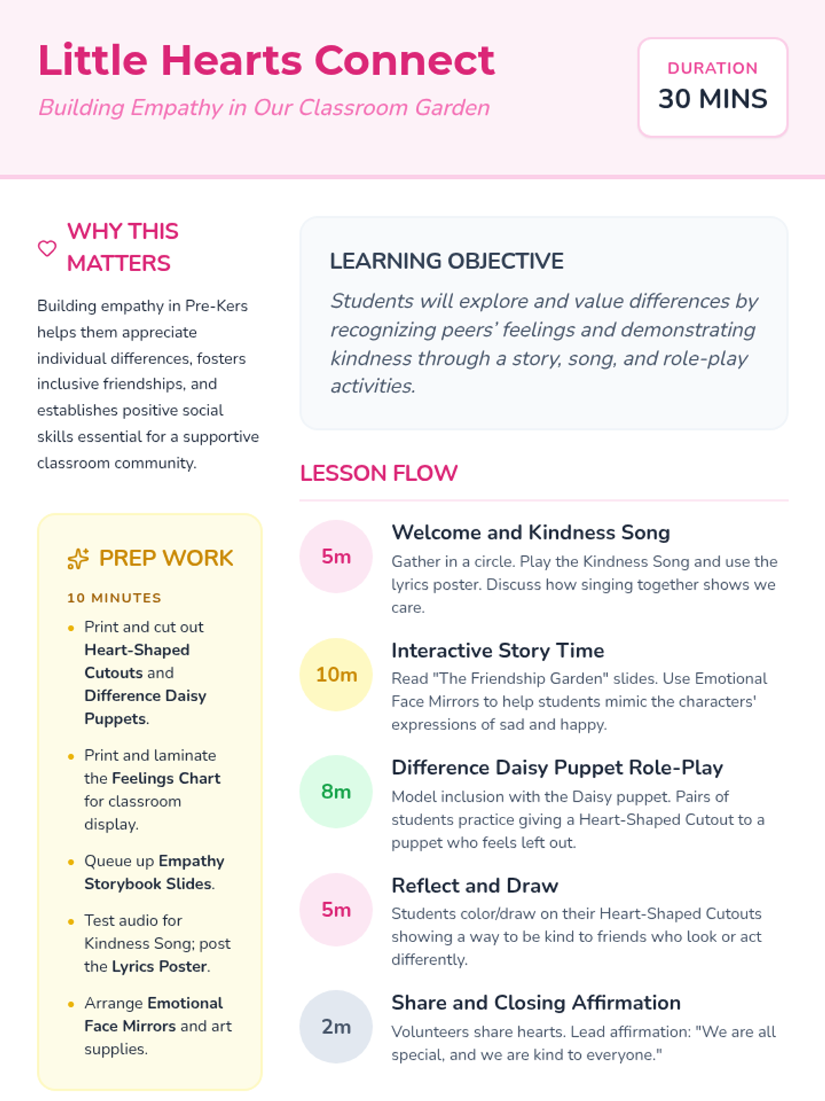 A 30-minute Pre-K lesson focused on building empathy by recognizing and valuing differences through storytelling, music, and role-play.