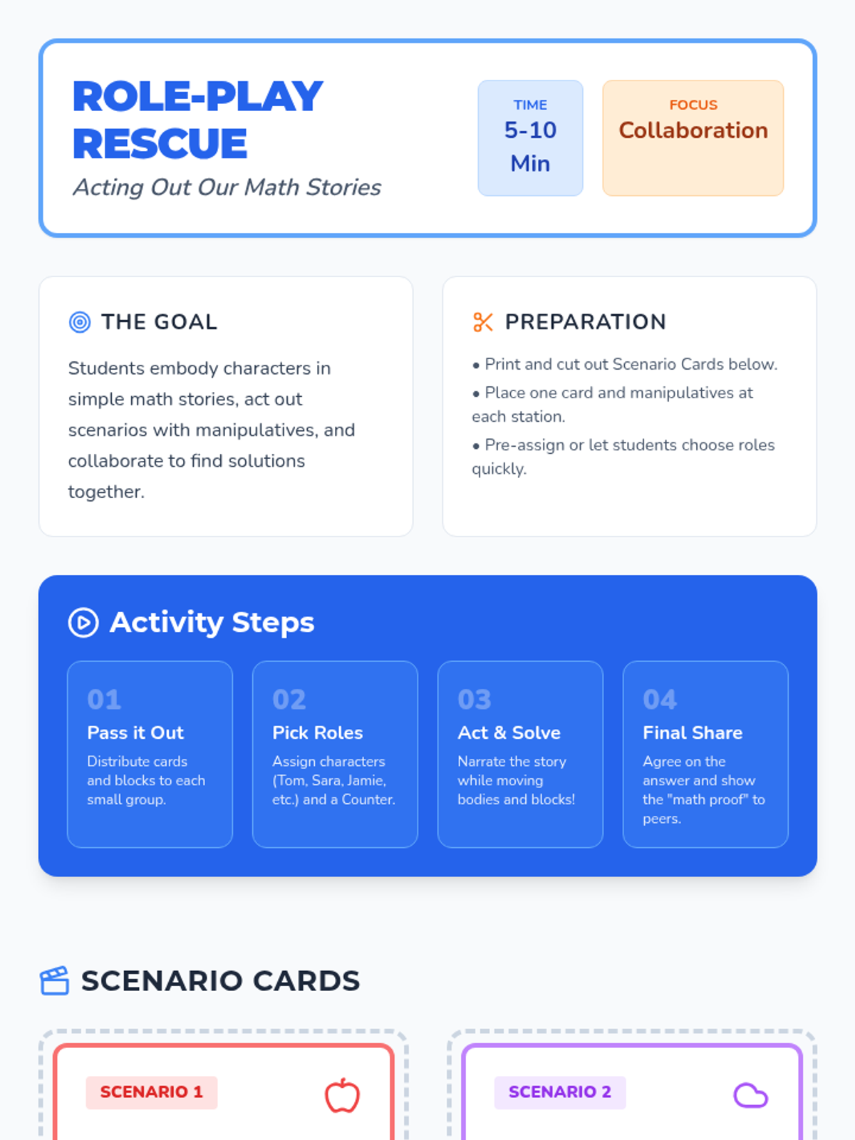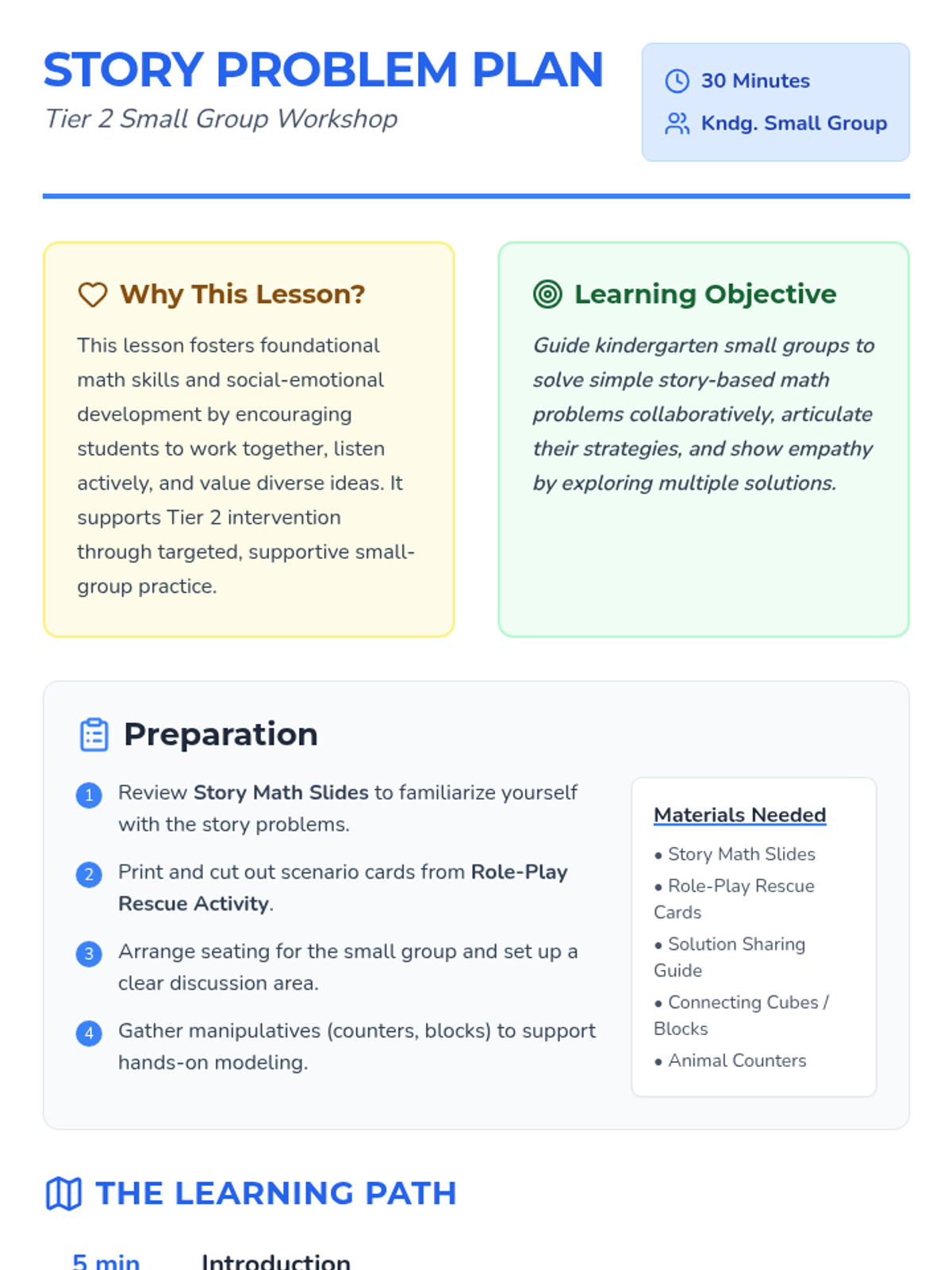 A 30-minute Tier 2 small-group workshop where kindergarteners solve story-based math problems through role-play and collaboration, building empathy and foundational skills.