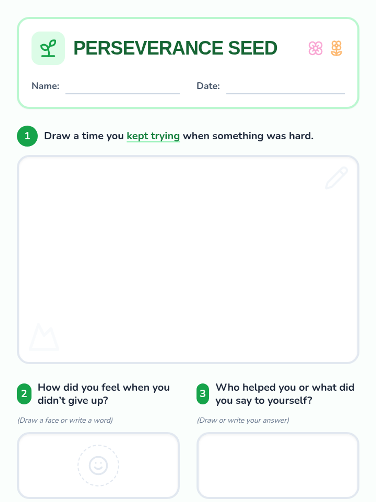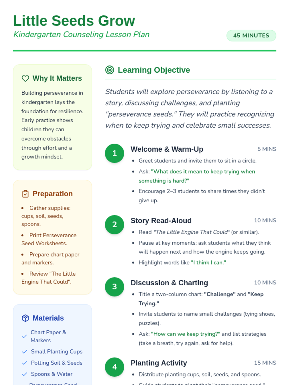 A 45-minute kindergarten counseling lesson on perseverance using the metaphor of growing seeds to teach resilience and a growth mindset.