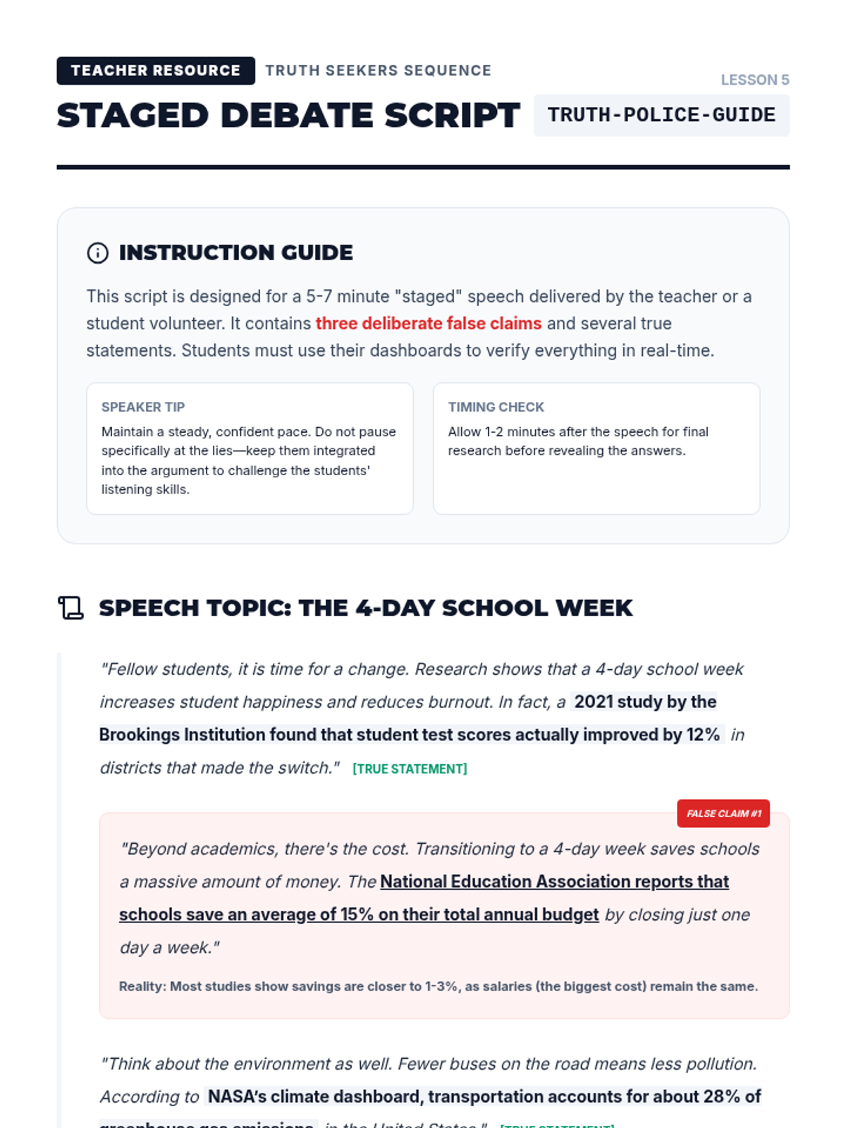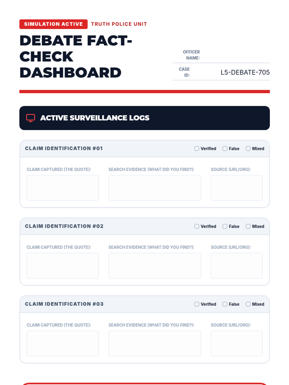 Students watch a pre-recorded debate or listen to live student speeches. They actively research claims made in real-time and flag inaccuracies using a digital dashboard.