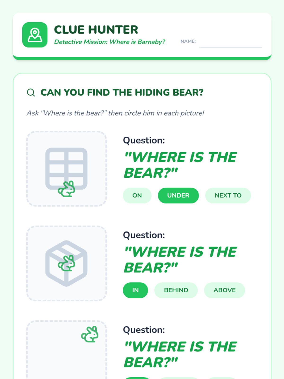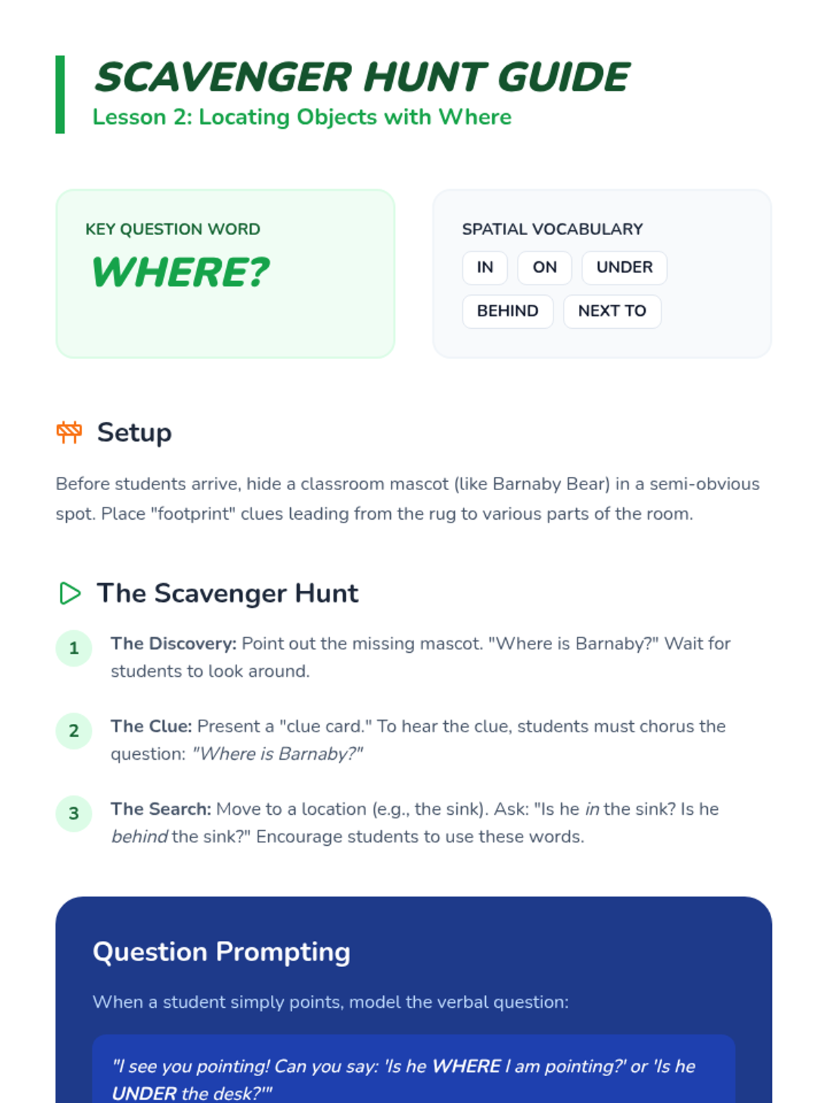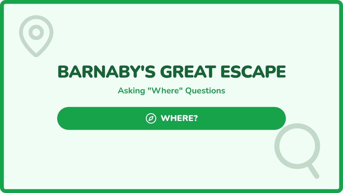 Students use 'where' questions to locate a missing classroom mascot, reinforcing spatial vocabulary and the purpose of location-based inquiry.