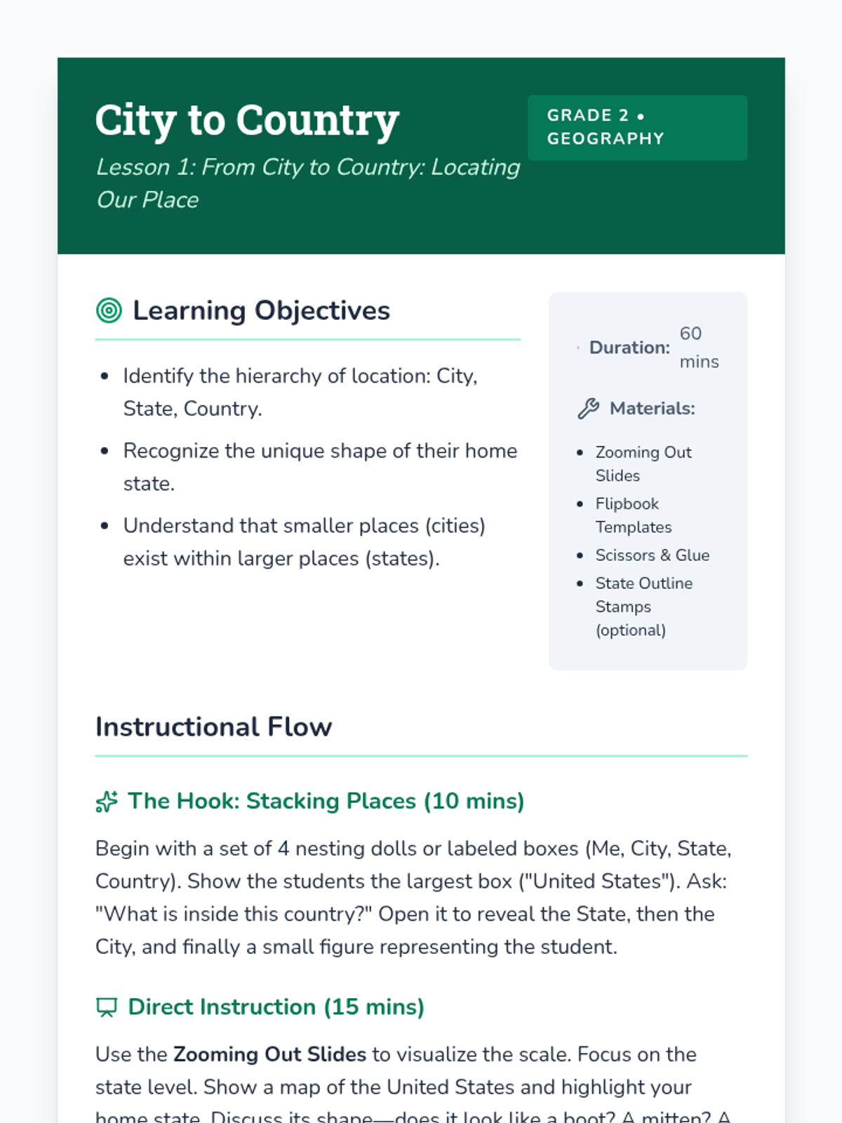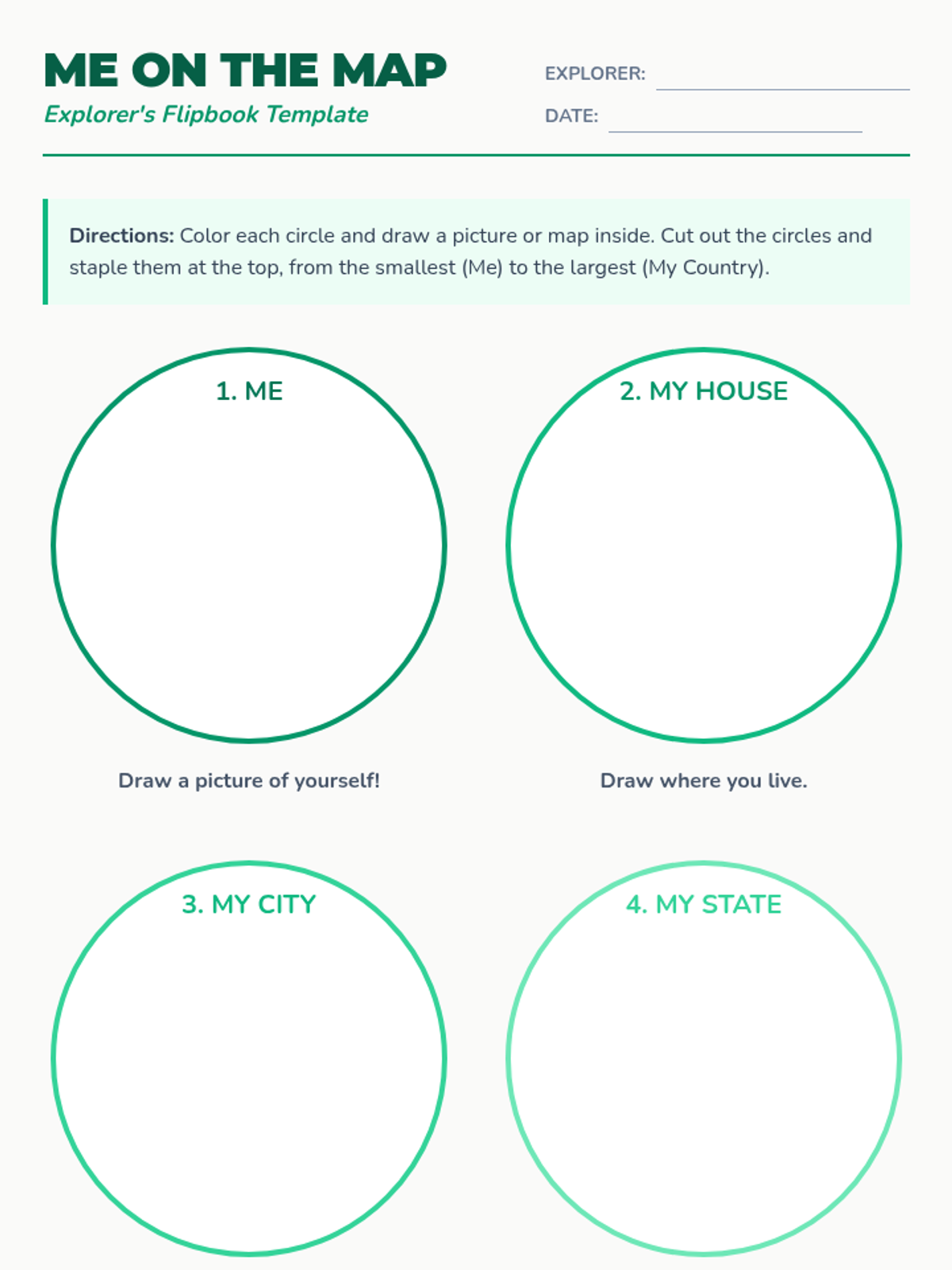Students explore the hierarchy of location by creating a 'Me on the Map' flipbook that visualizes their city, state, and country relationships. They visually distinguish the shape of their specific state compared to the whole country.