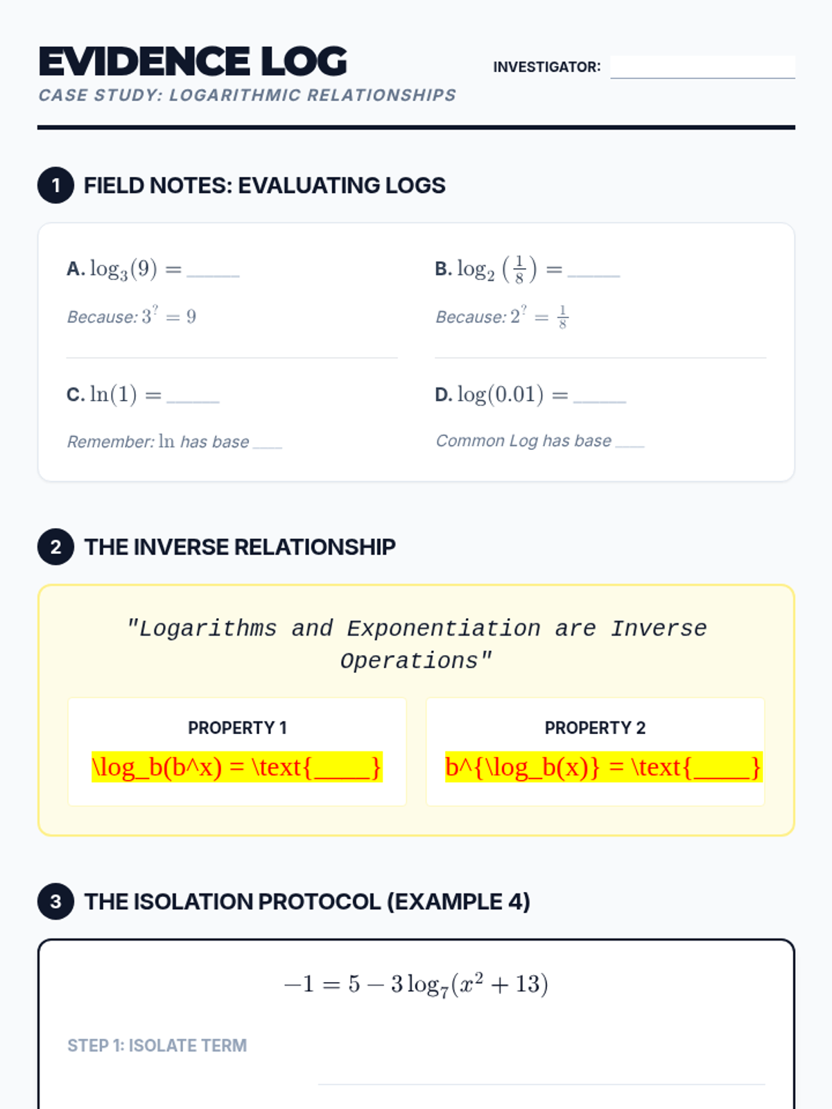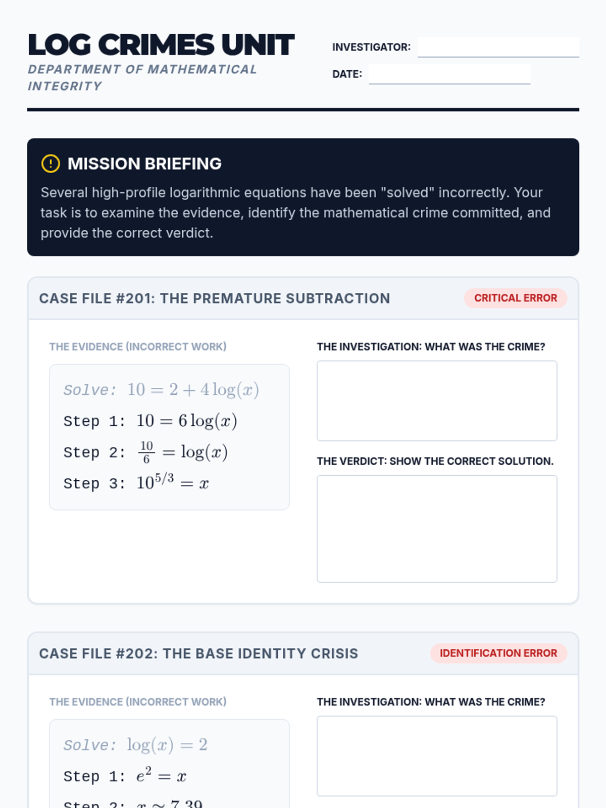 A lesson focused on solving complex logarithmic equations by isolating the log term first. Includes a warm-up on order of operations, a video analysis of a complex problem, guided practice on extraneous solutions, and a 'Log Crimes' error analysis activity.