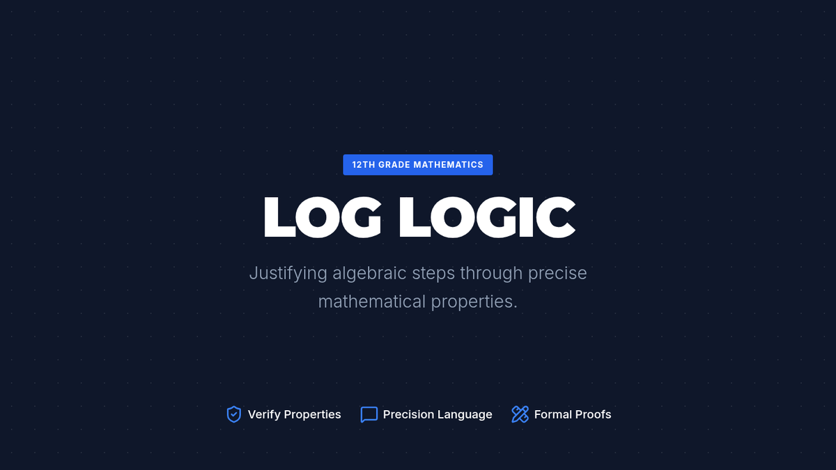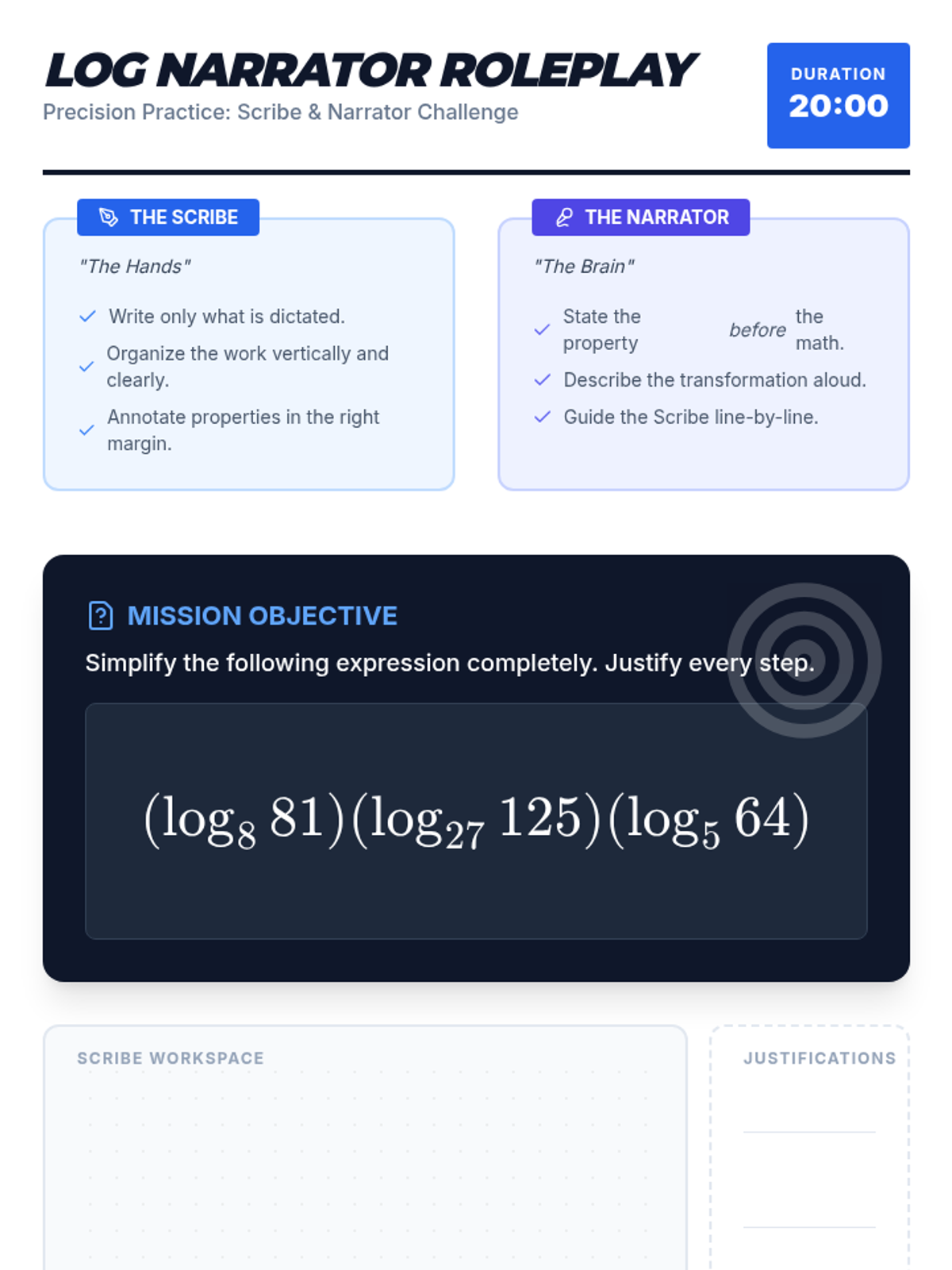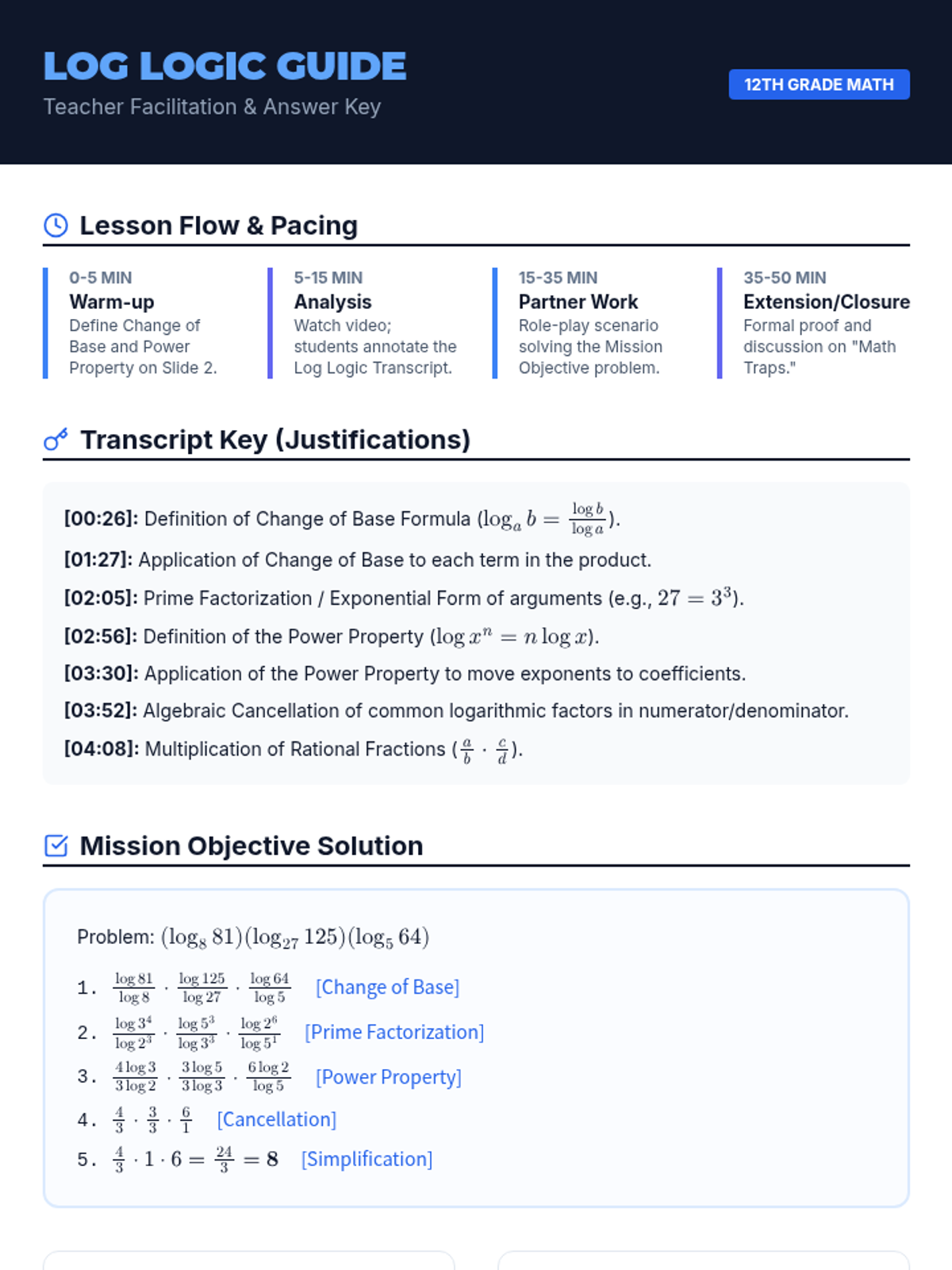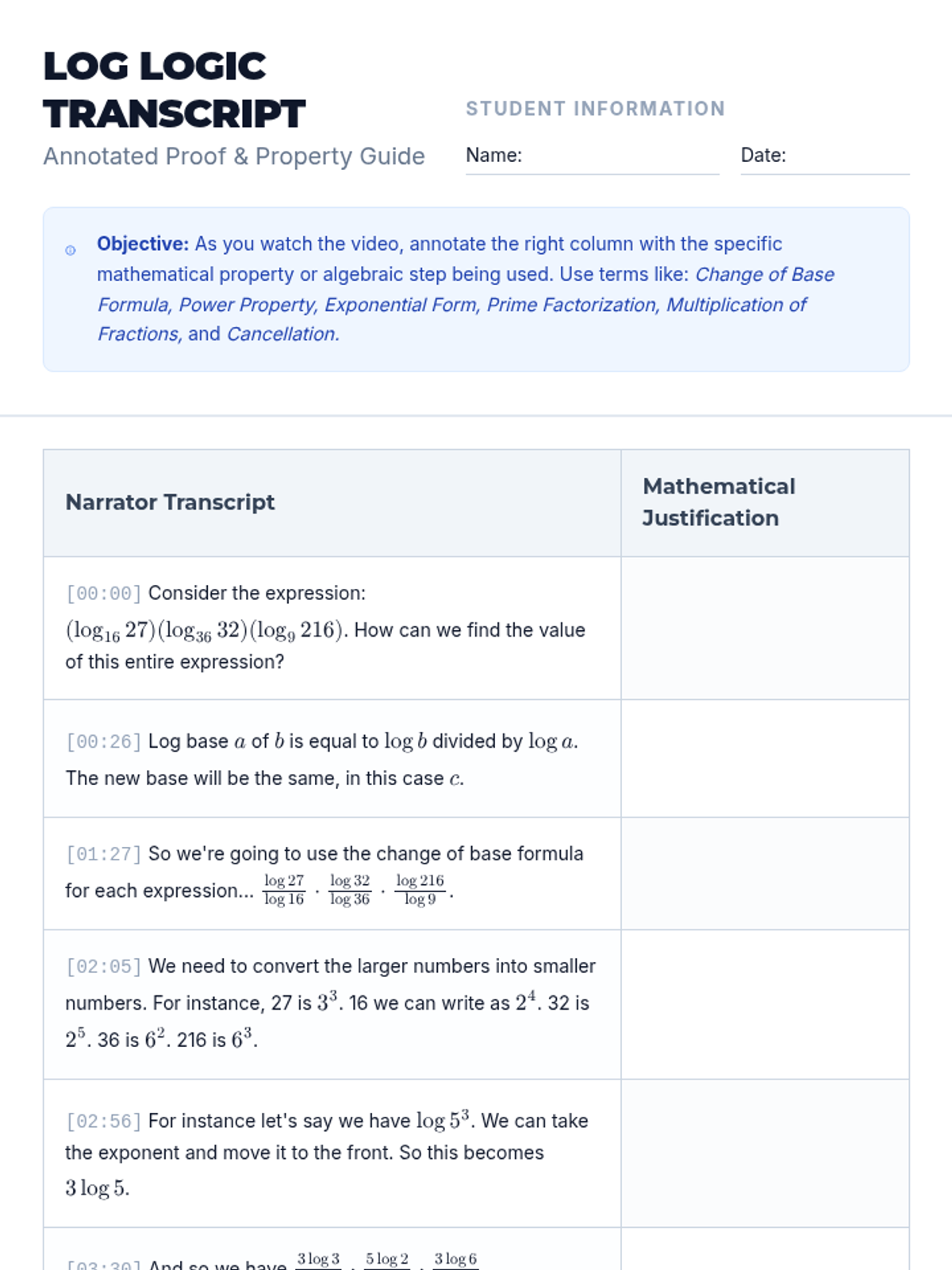 A high-school level math lesson focused on justifying logarithmic transformations using the Change of Base Formula and the Power Property. Students analyze a video demonstration, collaborate in Scribe/Narrator roles, and prove fundamental logarithmic identities.