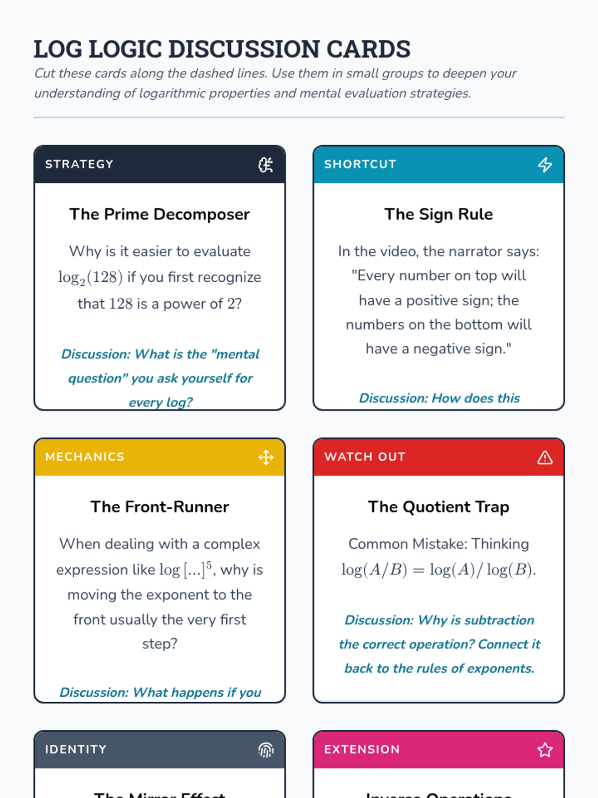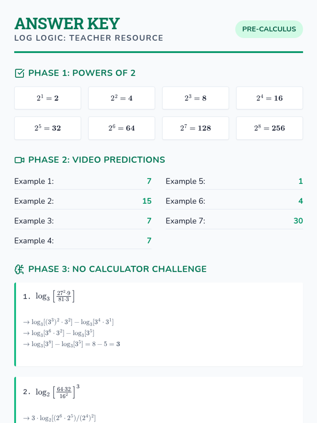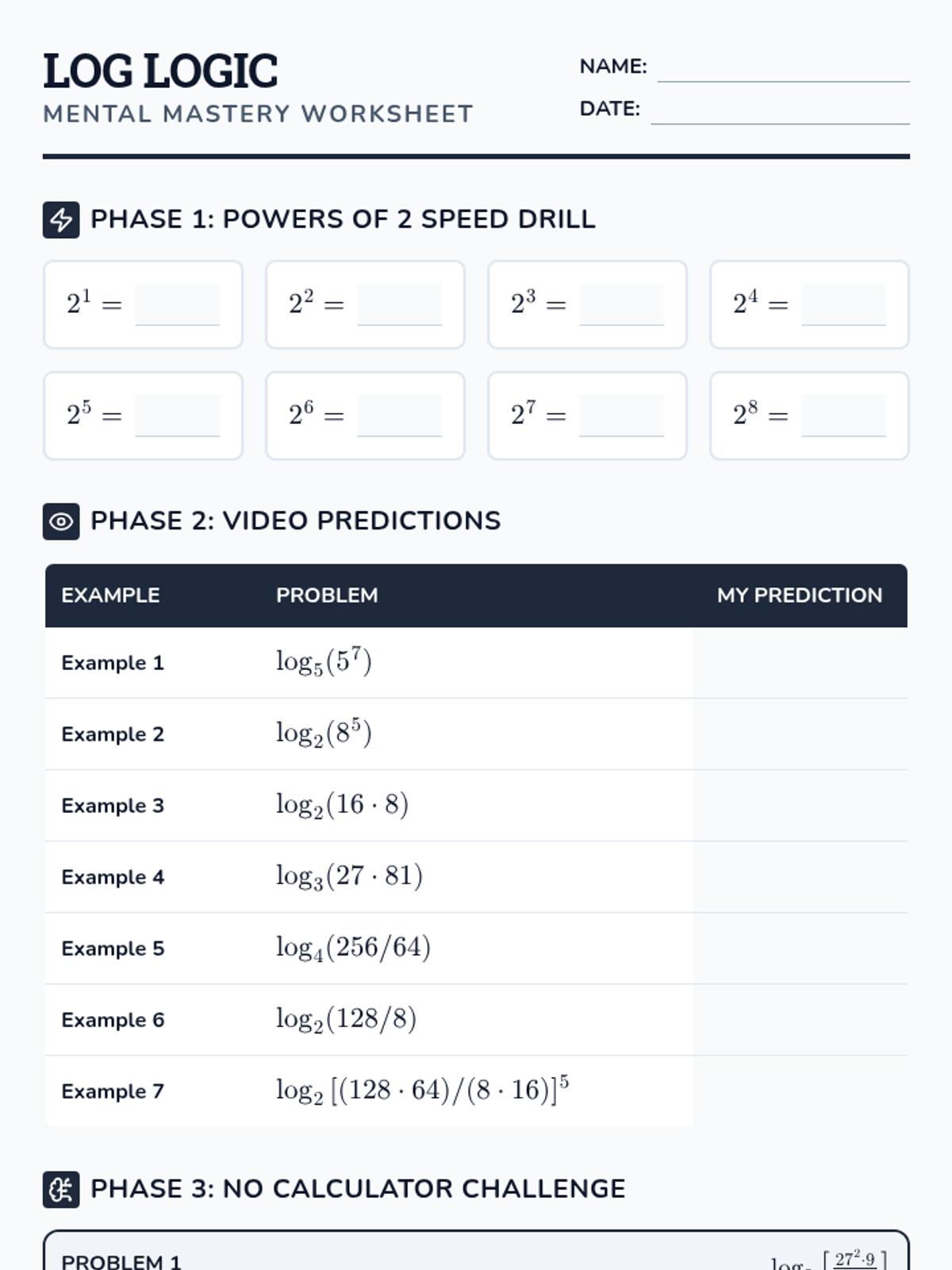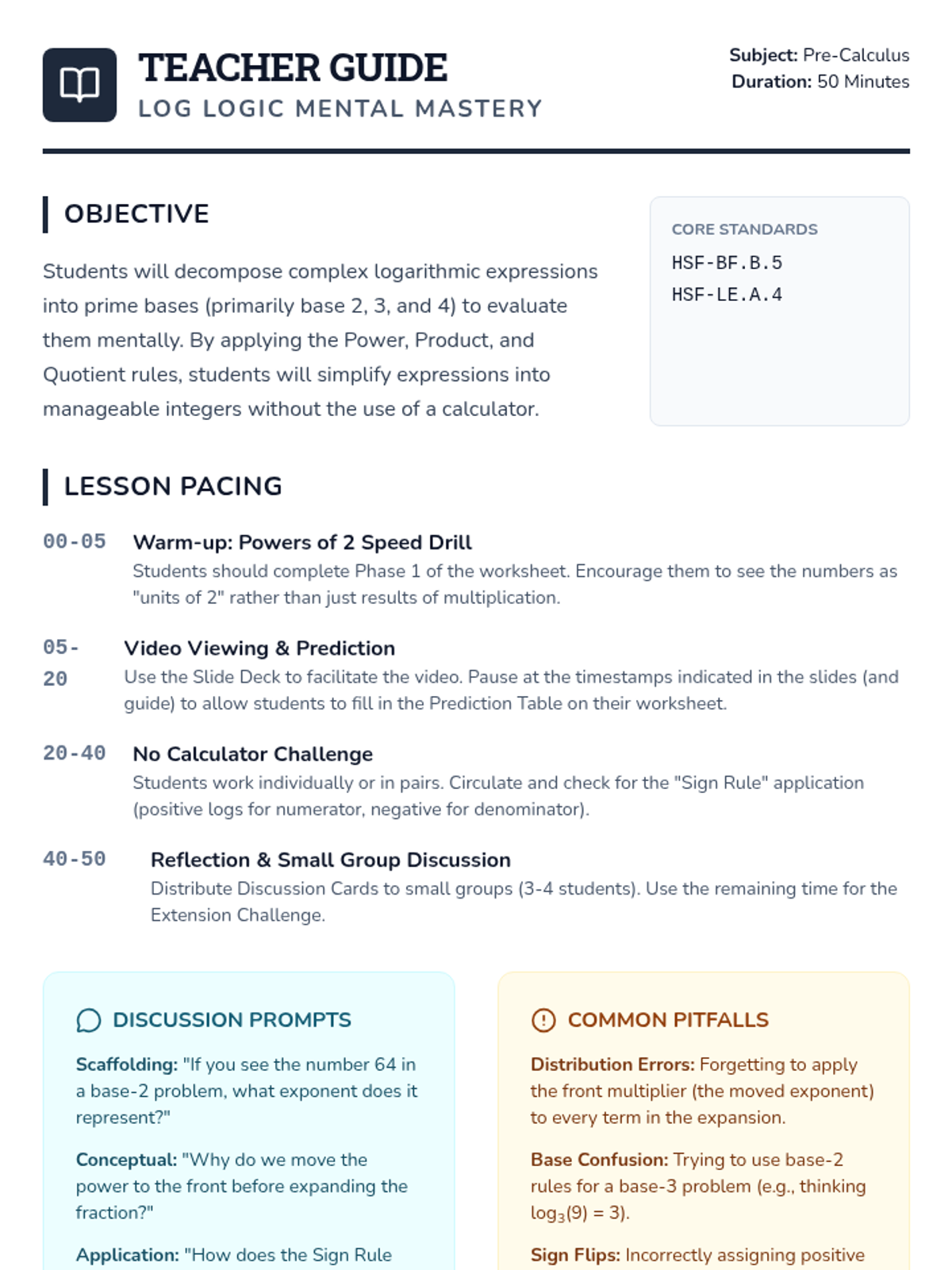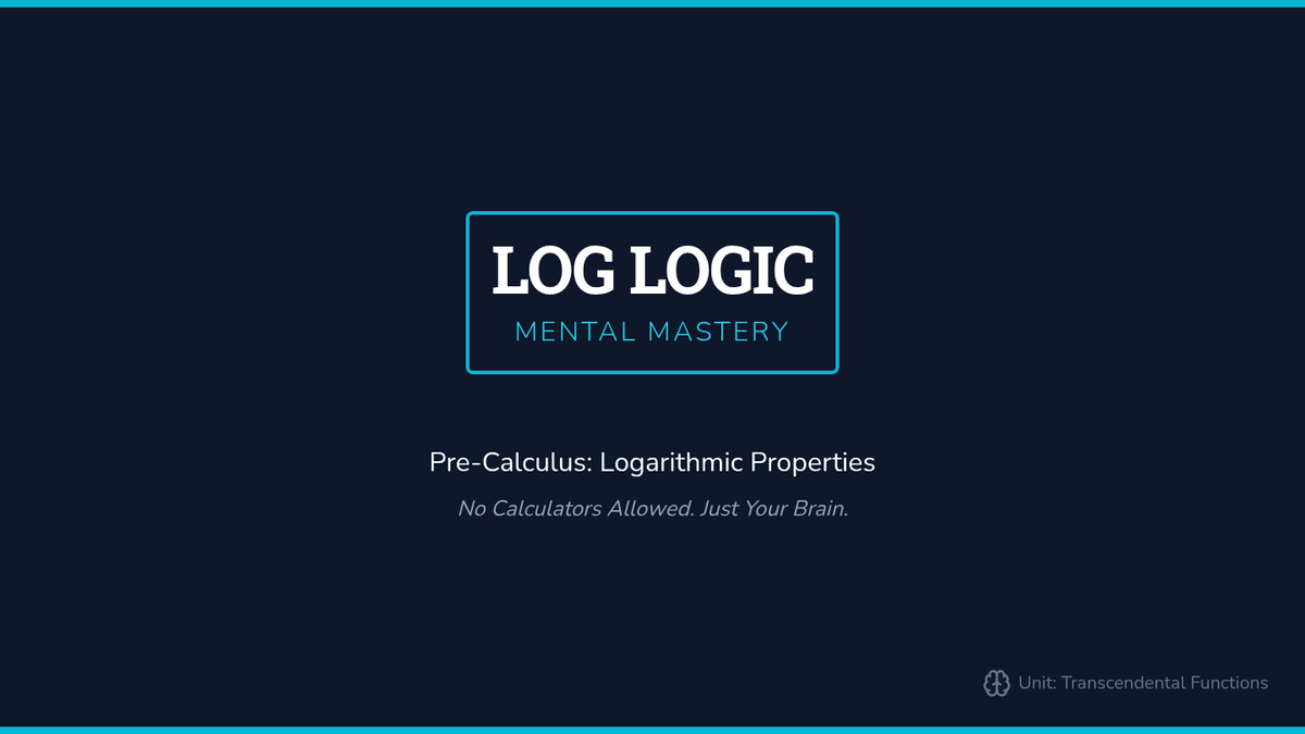A high-energy Pre-Calculus lesson focused on mental math strategies for simplifying complex logarithms using prime bases and core log properties. Students move from a speed-drilled warm-up to a high-level 'No Calculator Challenge.'