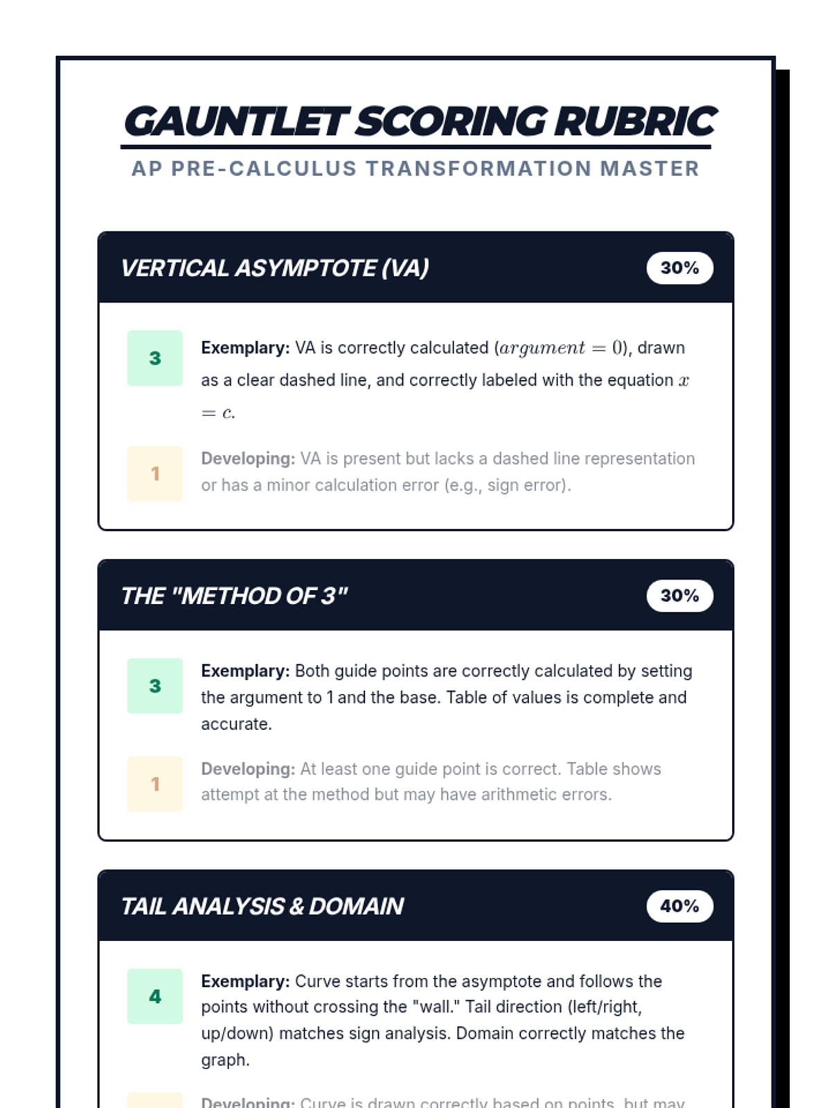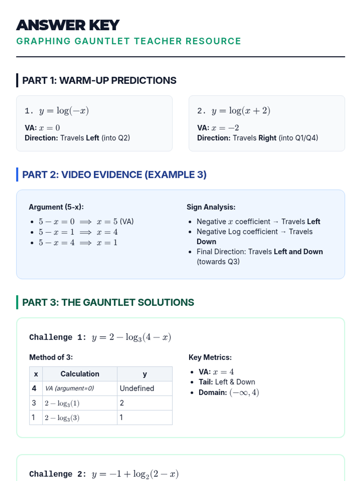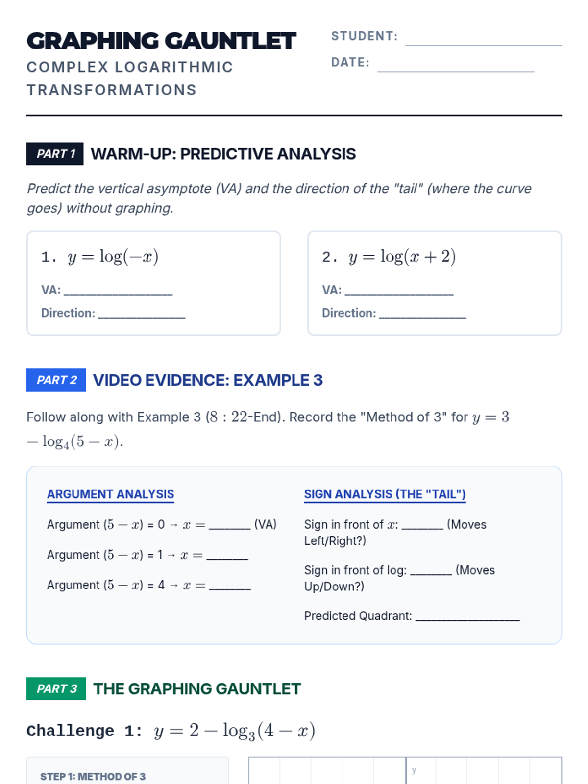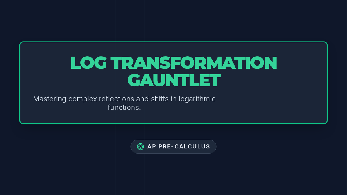 A high-level AP Pre-Calculus lesson focusing on complex logarithmic transformations, including simultaneous reflections and shifts, using the 'Method of 3' and sign analysis to predict graph behavior.