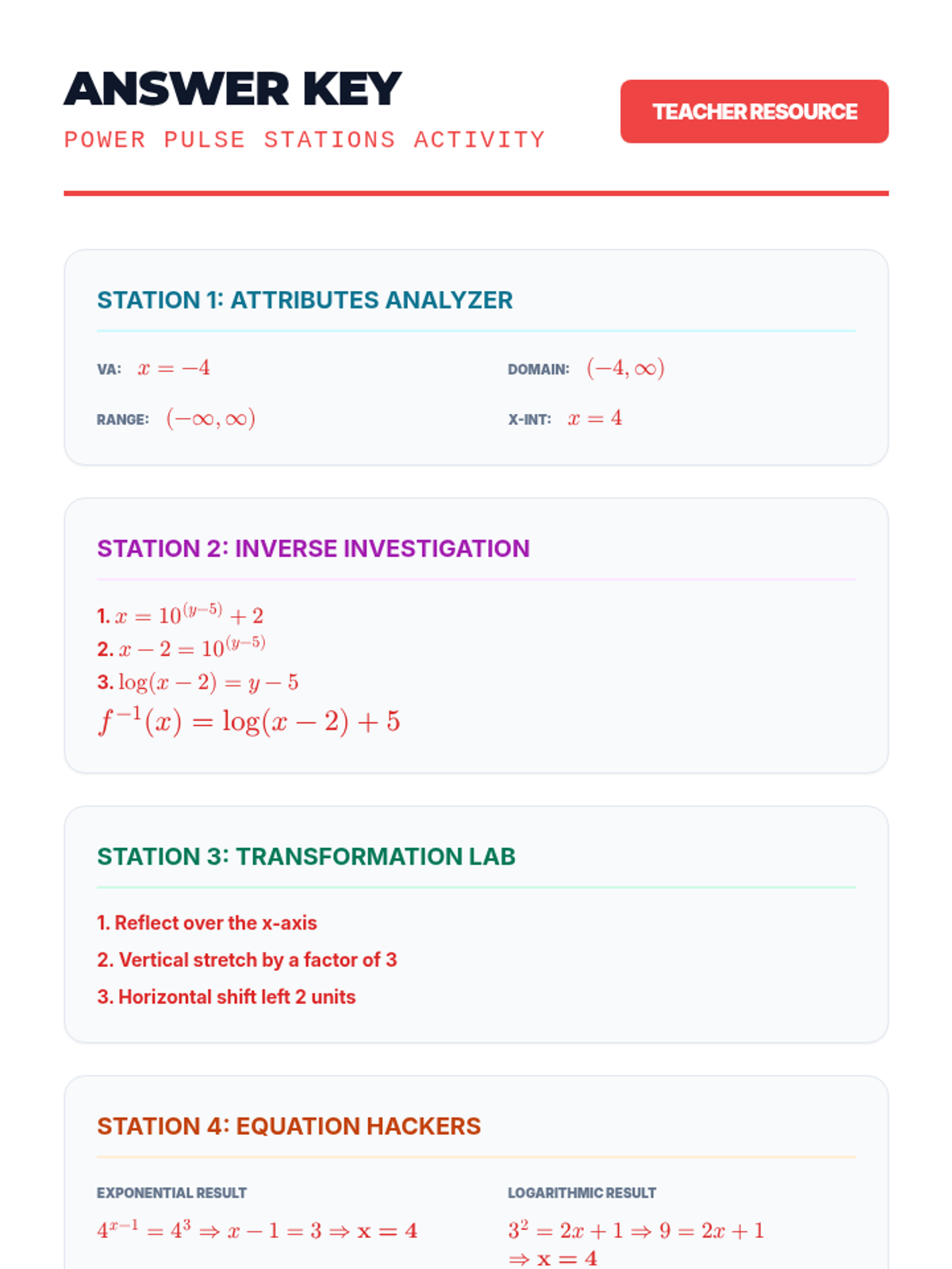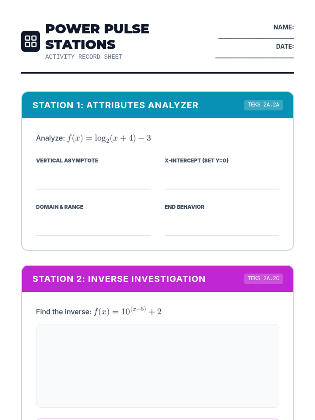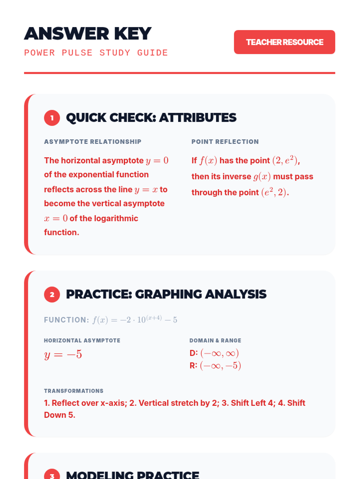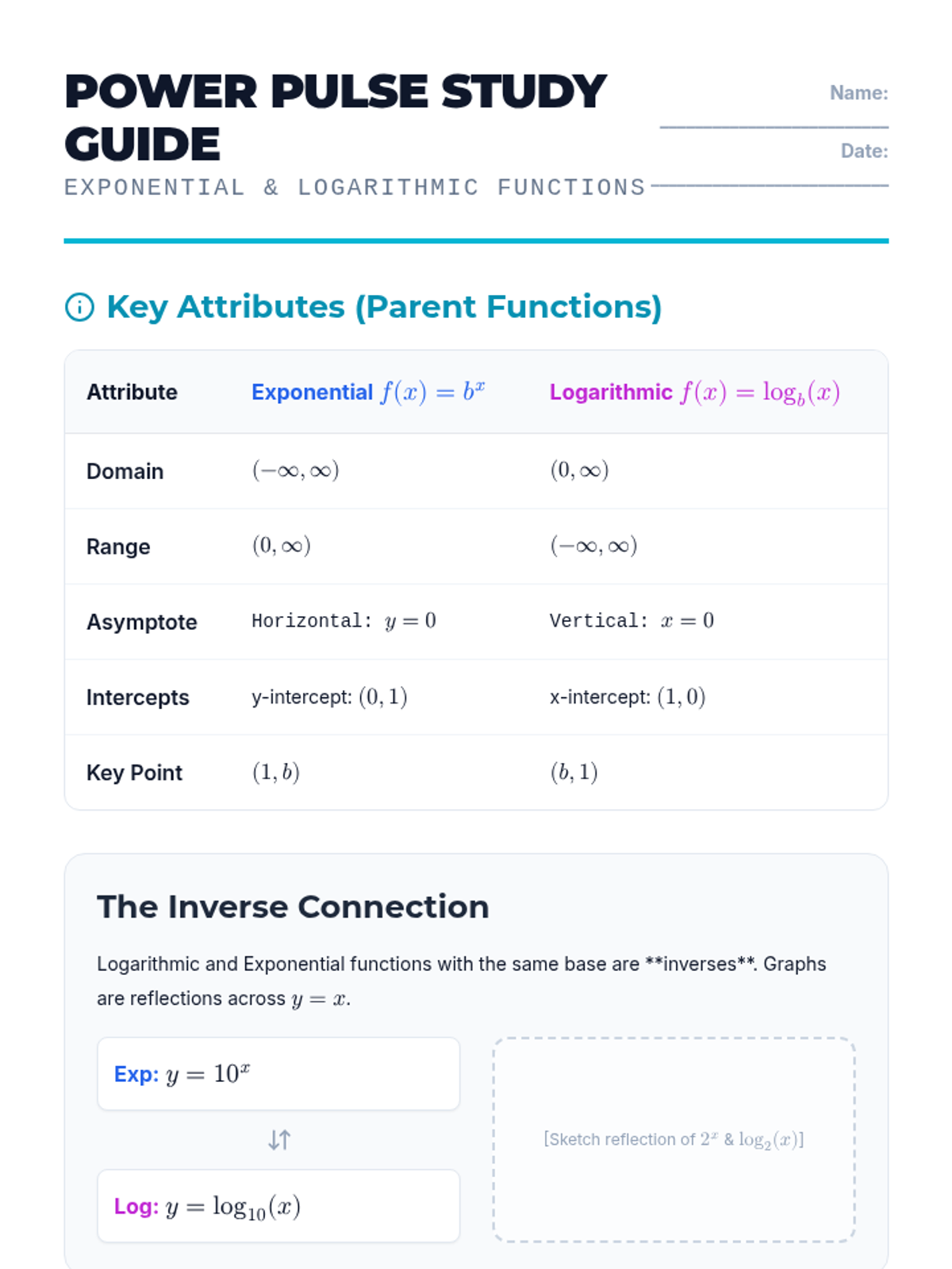 A comprehensive review of exponential and logarithmic functions, focusing on graphing attributes, transformations, inverse relationships, solving equations, and data modeling based on Texas Algebra 2 standards.
