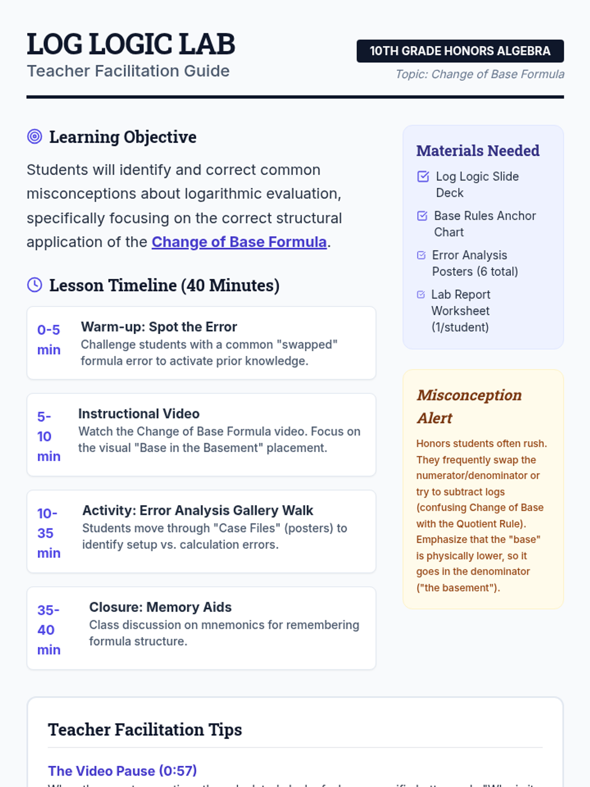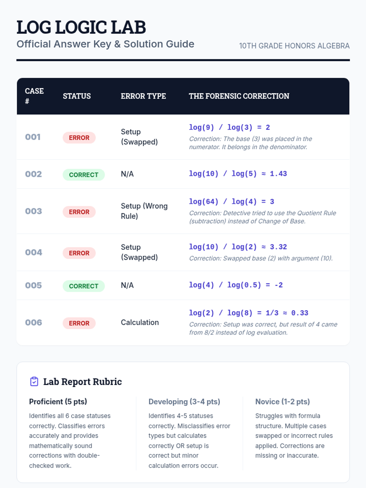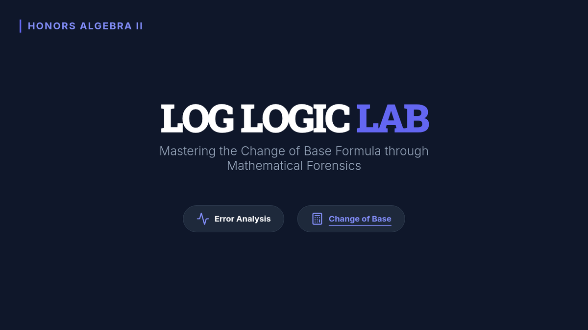 A 10th-grade honors algebra lesson focused on mastering the Change of Base Formula and identifying common evaluation misconceptions through a 'Mathematical Forensics' error analysis activity.
