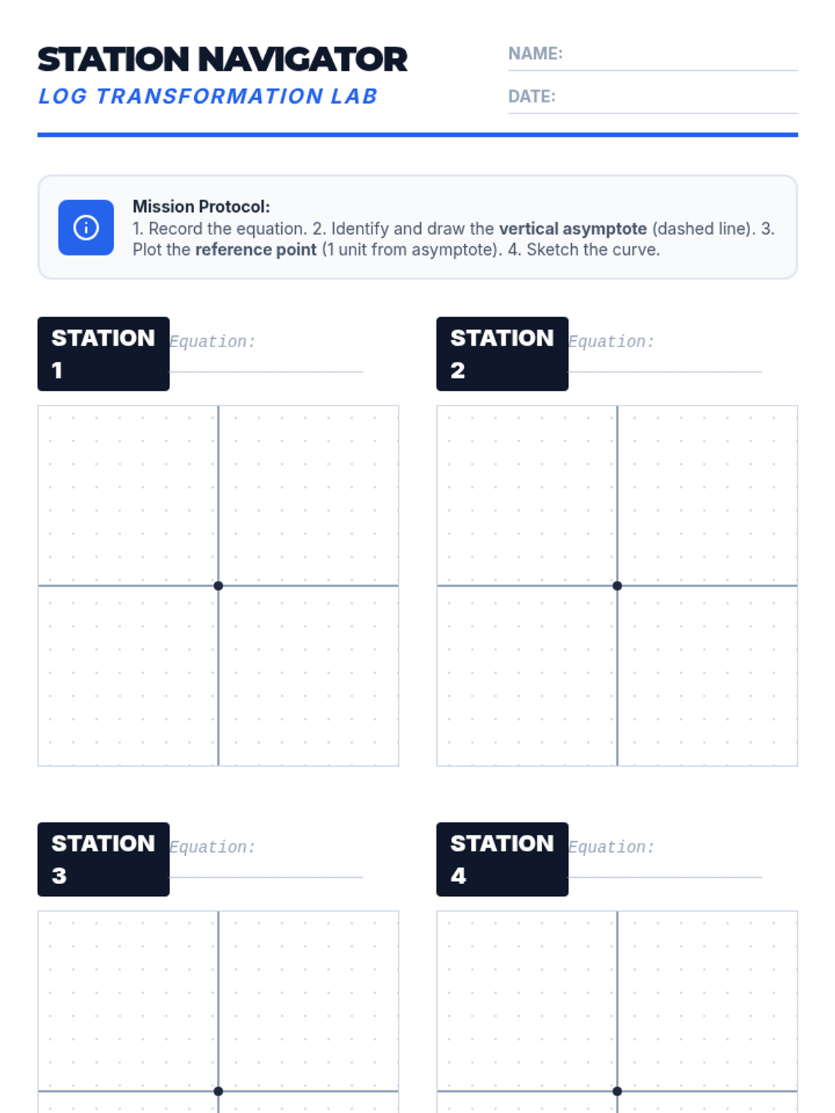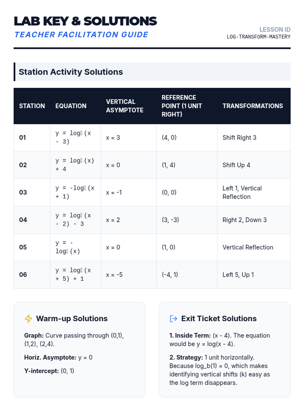 Students master the graphing of logarithmic functions by identifying horizontal and vertical shifts, reflections, and the critical 'reference point' strategy. The lesson transitions from exponential review to active transformation mapping using stations.