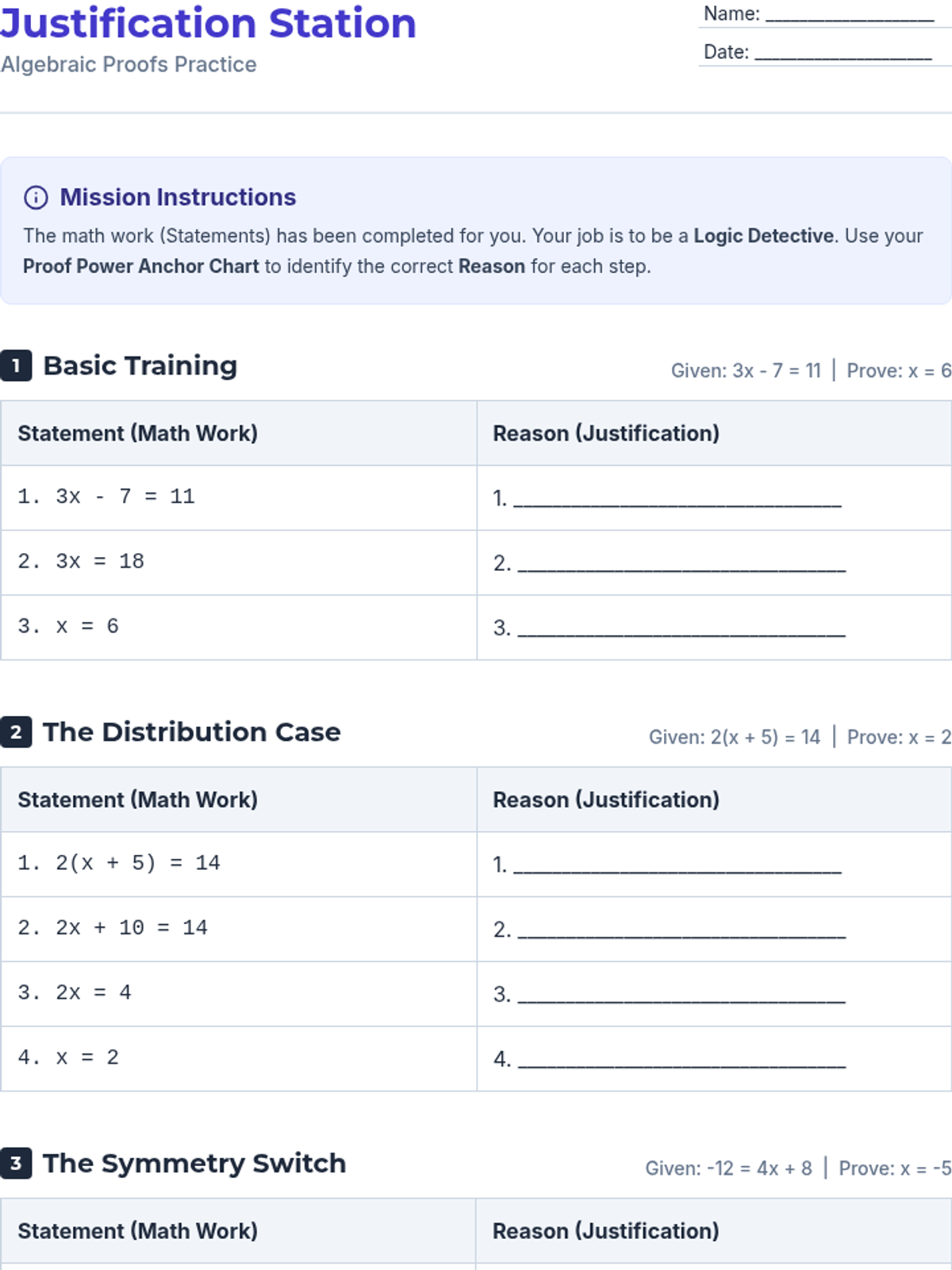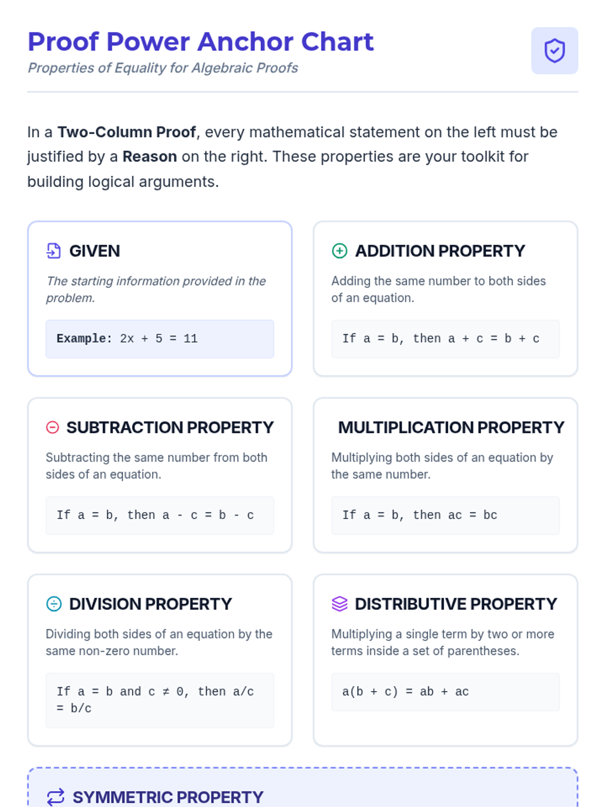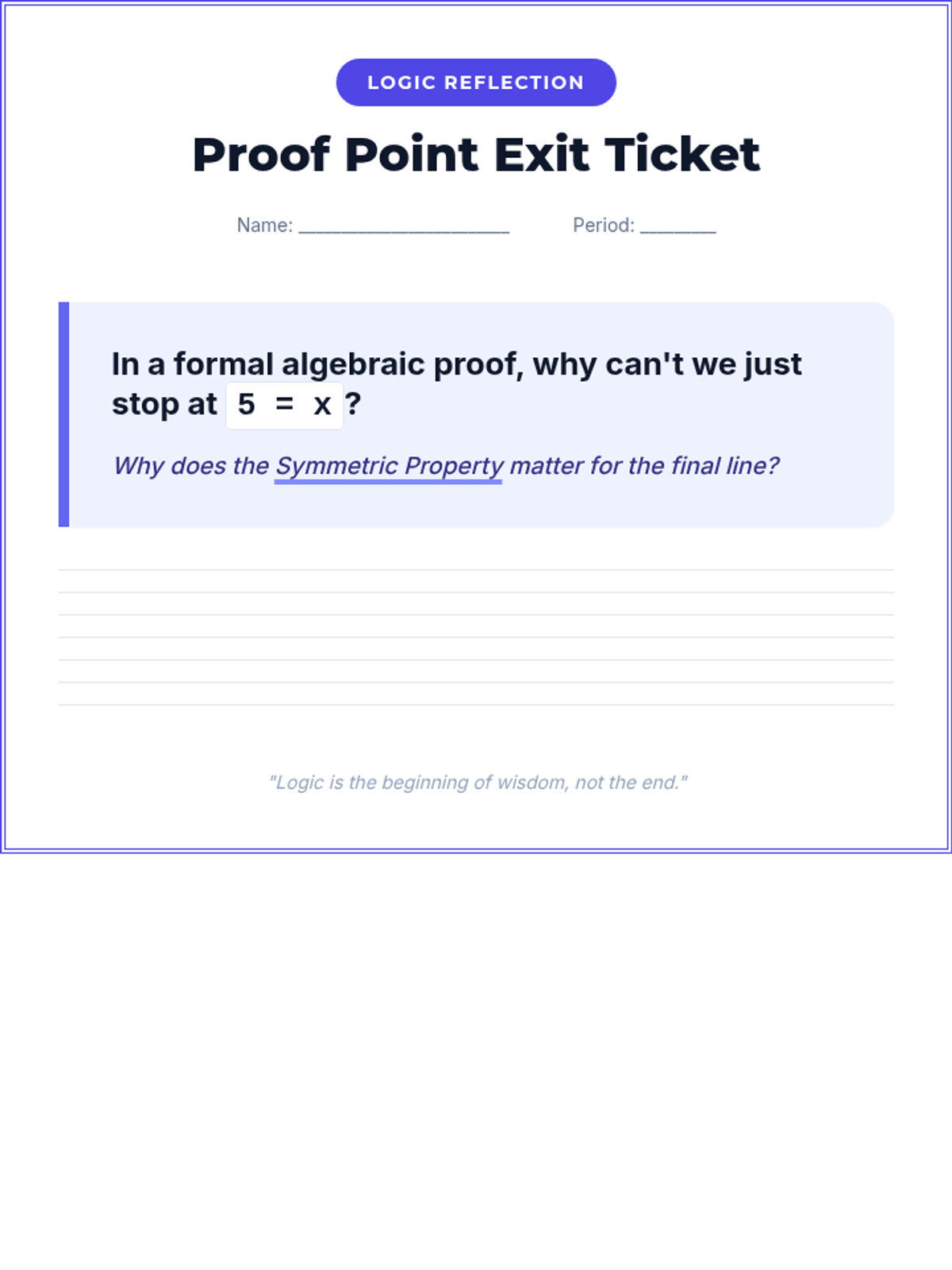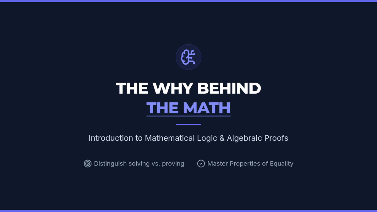 Students transition from simply solving equations to proving their solutions using a two-column proof format and properties of equality. The lesson emphasizes mathematical logic, precision, and the 'why' behind algebraic operations.