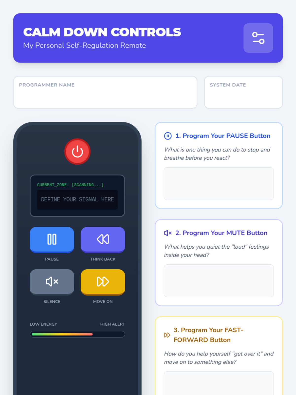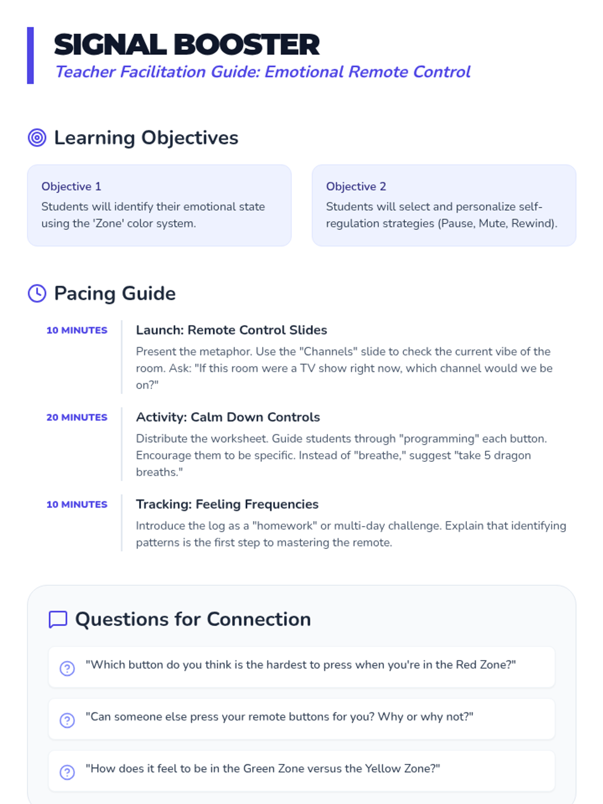 A lesson focused on self-regulation and managing emotions using the metaphor of a 'Remote Control' to help students navigate their feelings. Students will learn to identify their current 'channel' and use strategies to switch to a more comfortable state.