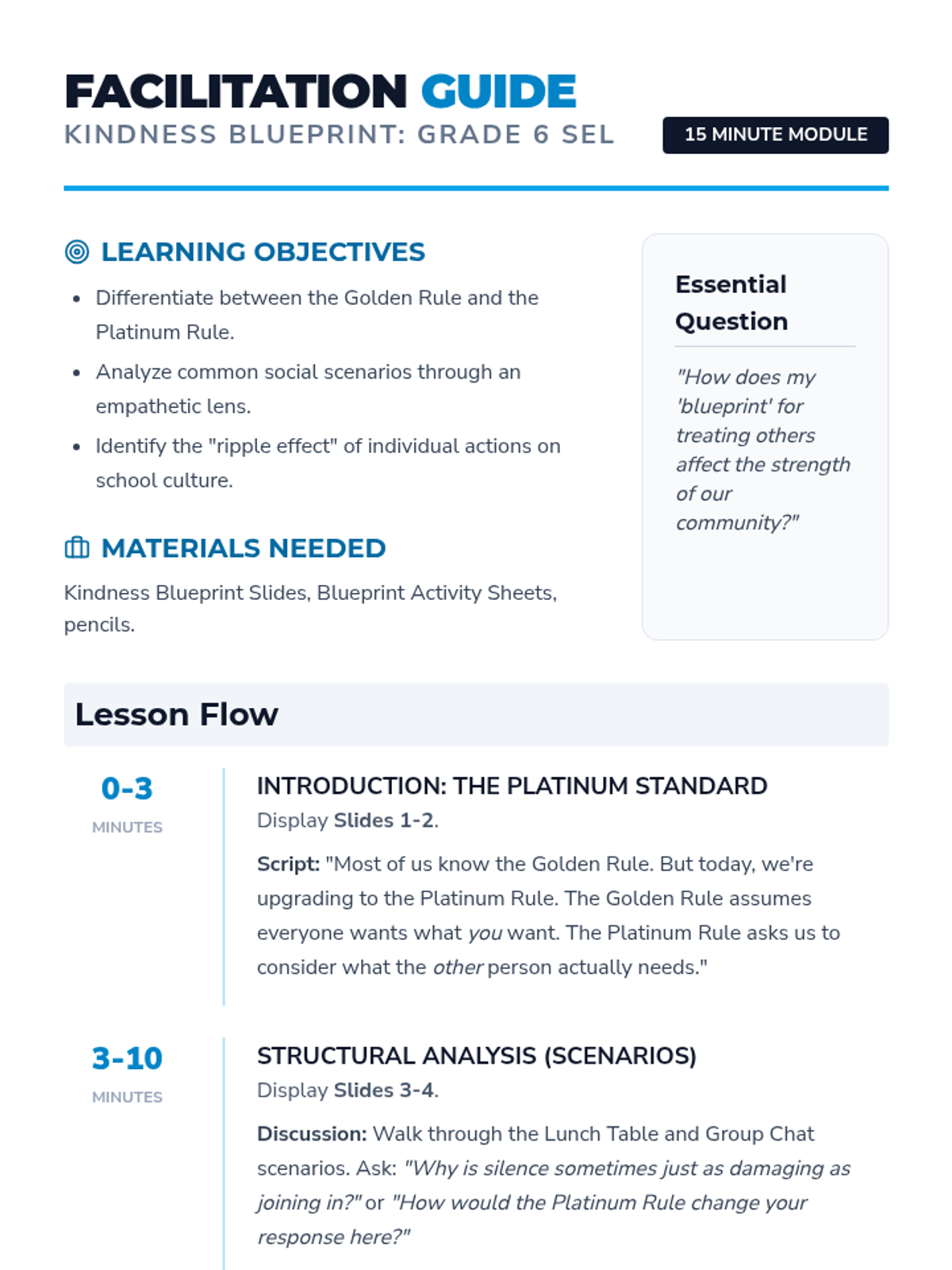 A high-impact 15-minute social-emotional learning lesson focused on empathy, the Platinum Rule, and the tangible impact of treating others with respect in a middle school environment.