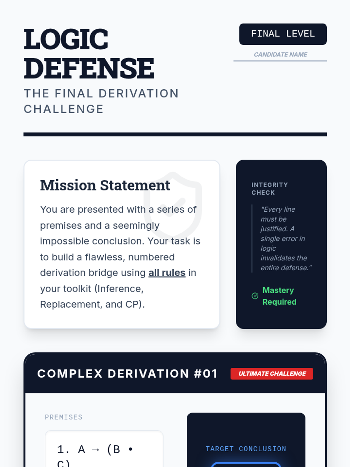 A mastery-based finale where students apply all rules (inference, replacement, and conditional proof) to construct complex derivations and peer-review their peers' logic for rigor.