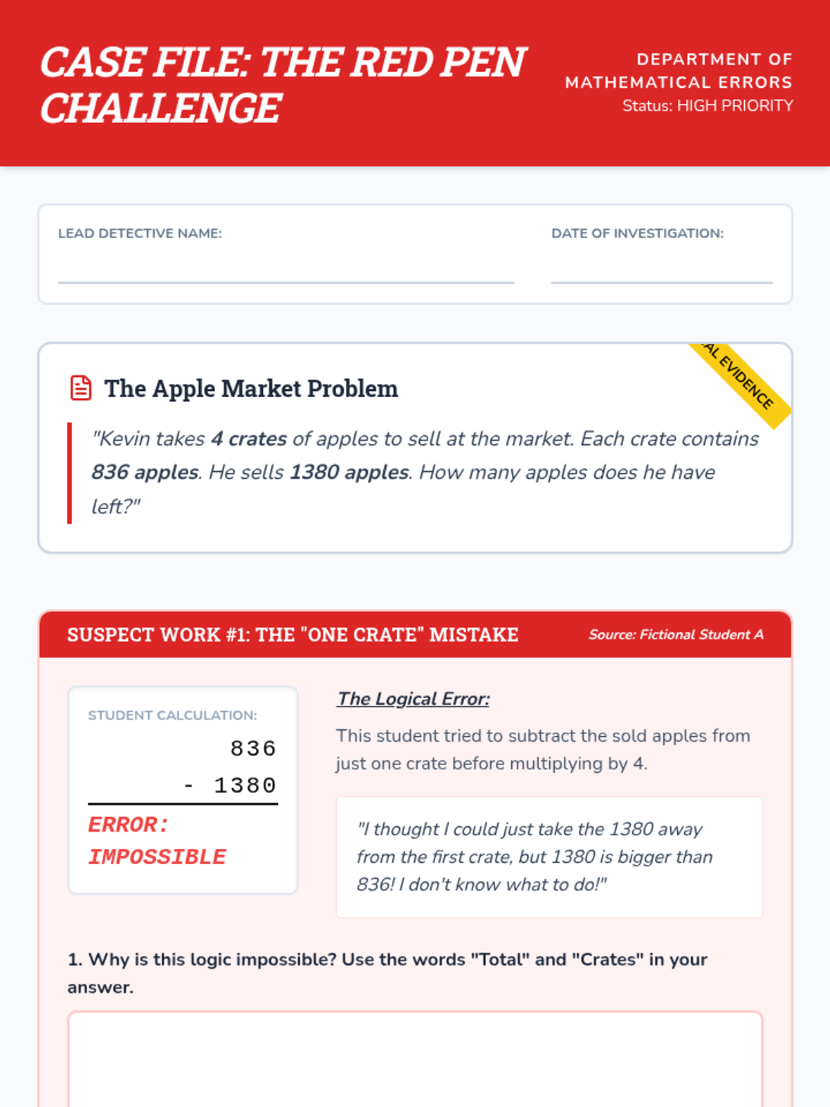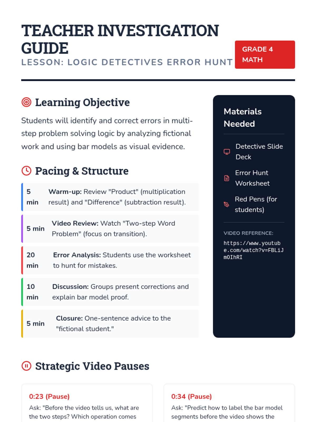 Students act as 'Math Detectives' to identify, explain, and correct logical errors in two-step word problems involving multiplication and subtraction. This lesson uses visual bar models to bridge the gap between reading a problem and calculating the solution.