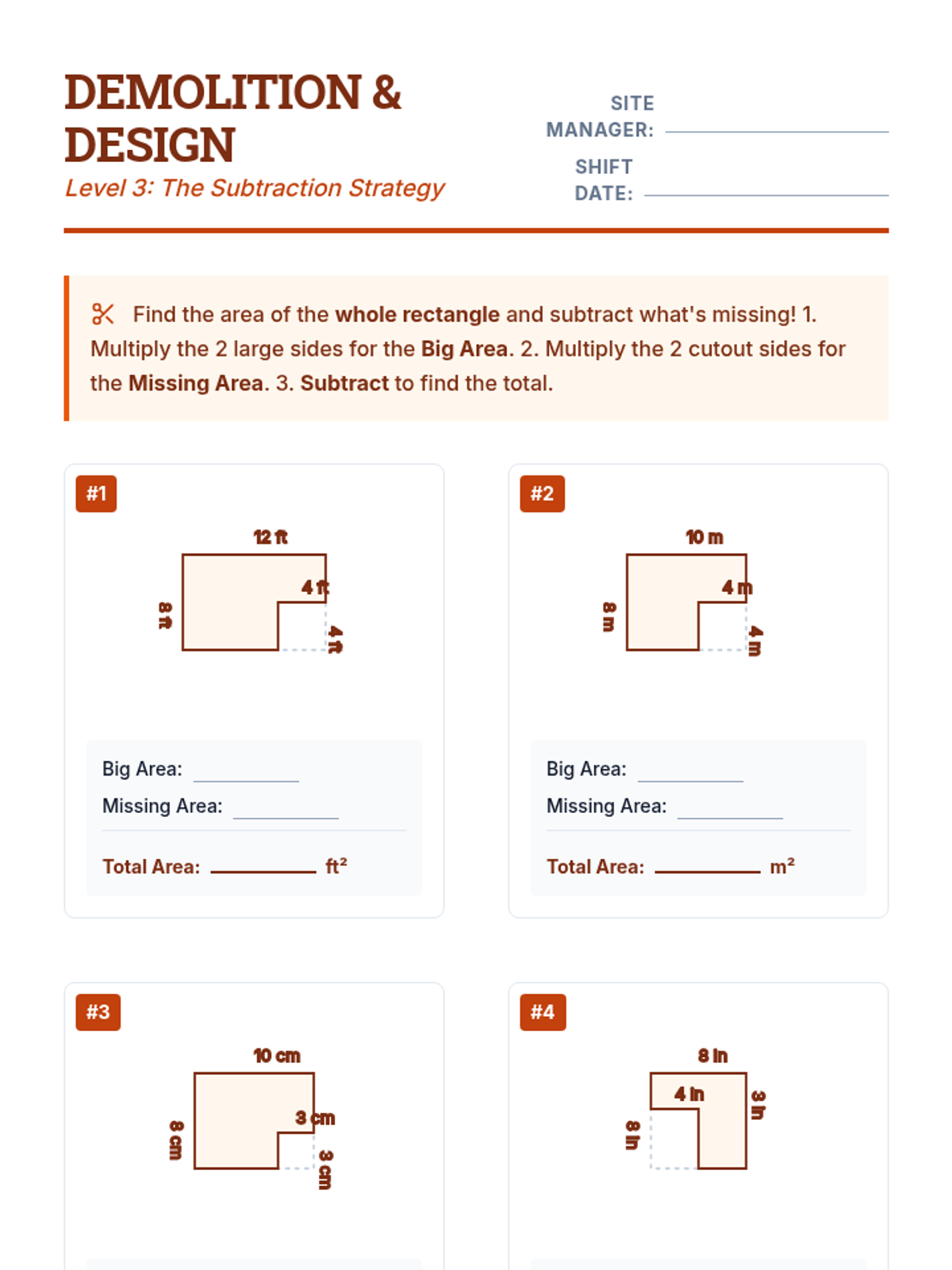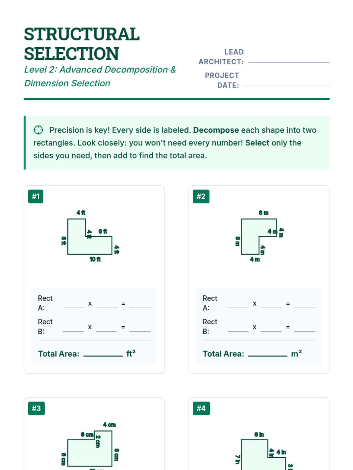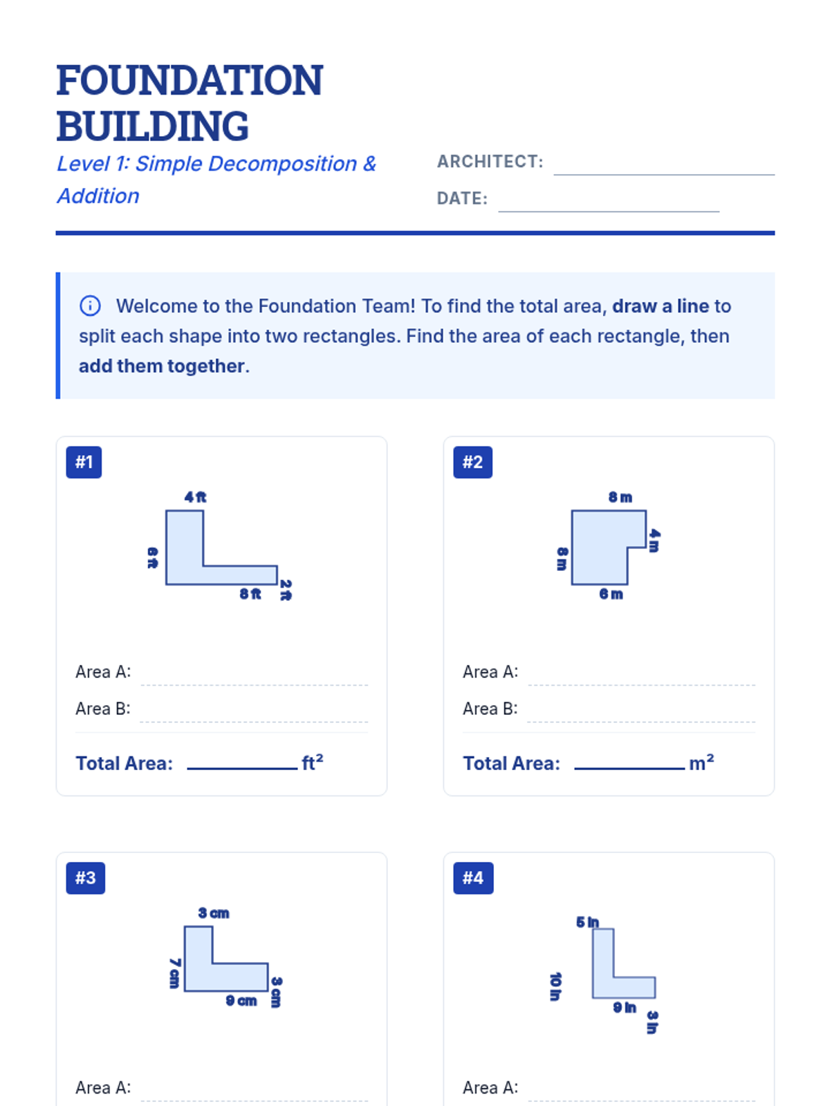 A lesson focused on mastering the area of composite figures through three distinct strategies: basic addition decomposition, selective dimension decomposition, and the subtraction method.