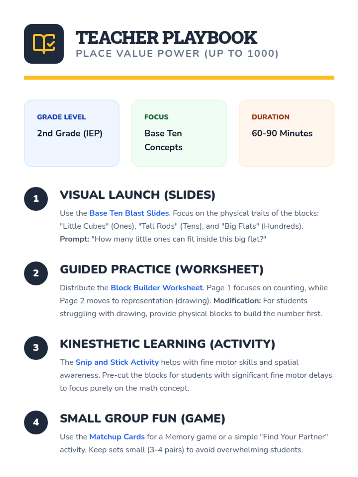 A comprehensive lesson on place value up to 1000 designed specifically for 2nd-grade students on IEPs. Includes visual-heavy instruction, hands-on sorting, matching games, and simplified practice.