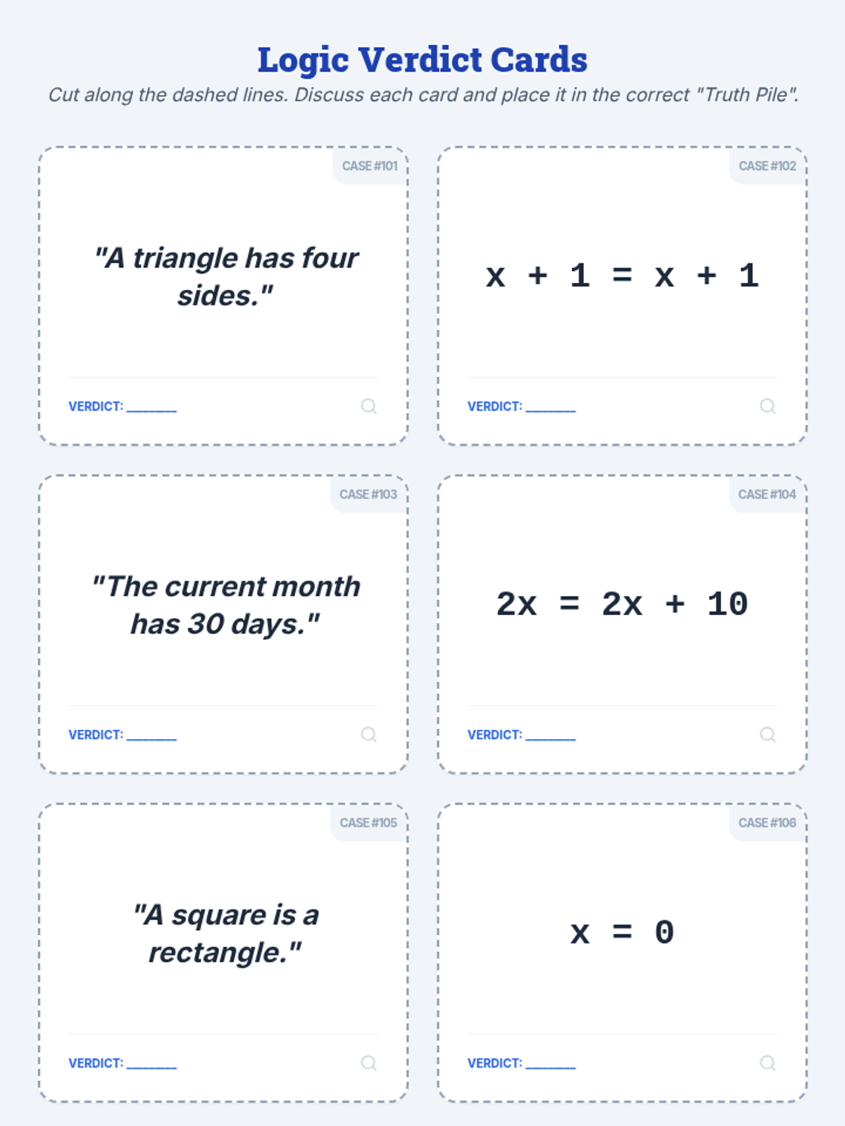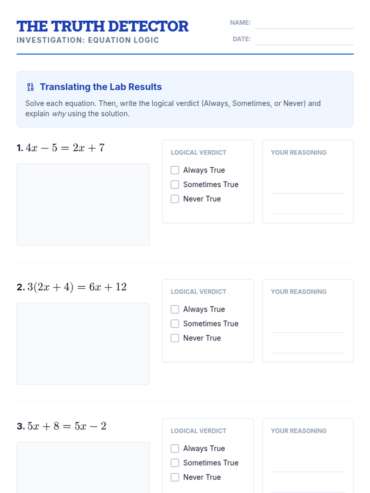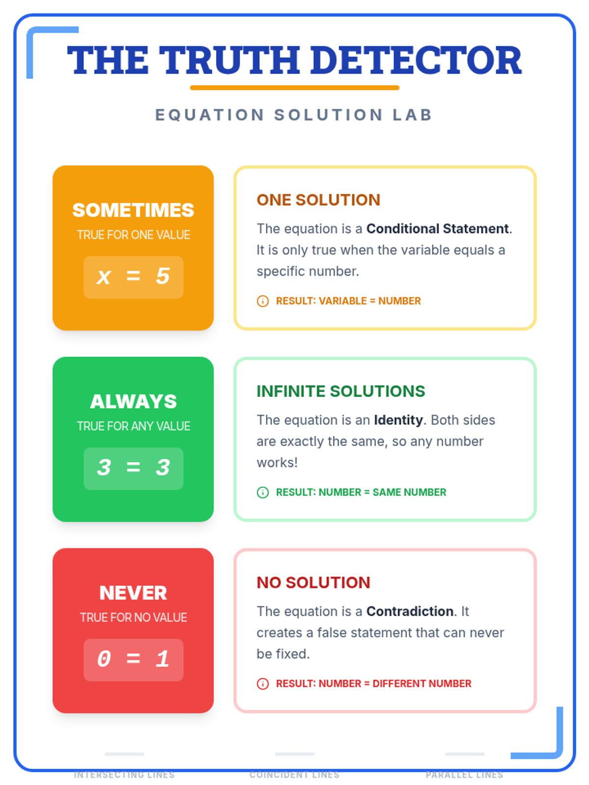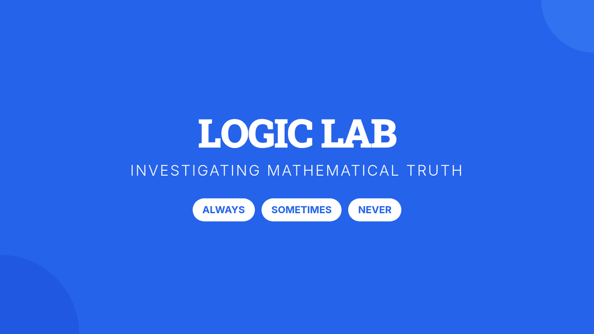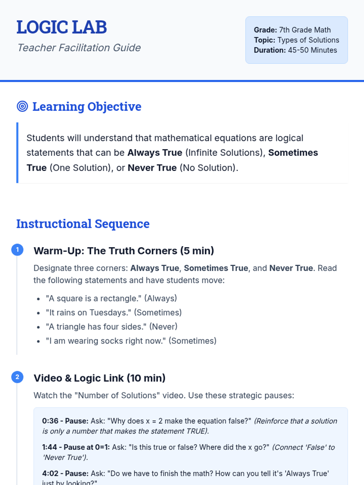 A 7th-grade math lesson that reinterprets algebraic solutions (one, none, infinite) through the lens of logic (sometimes, never, and always true). Includes video-guided discussion, collaborative sorting, and independent practice.
