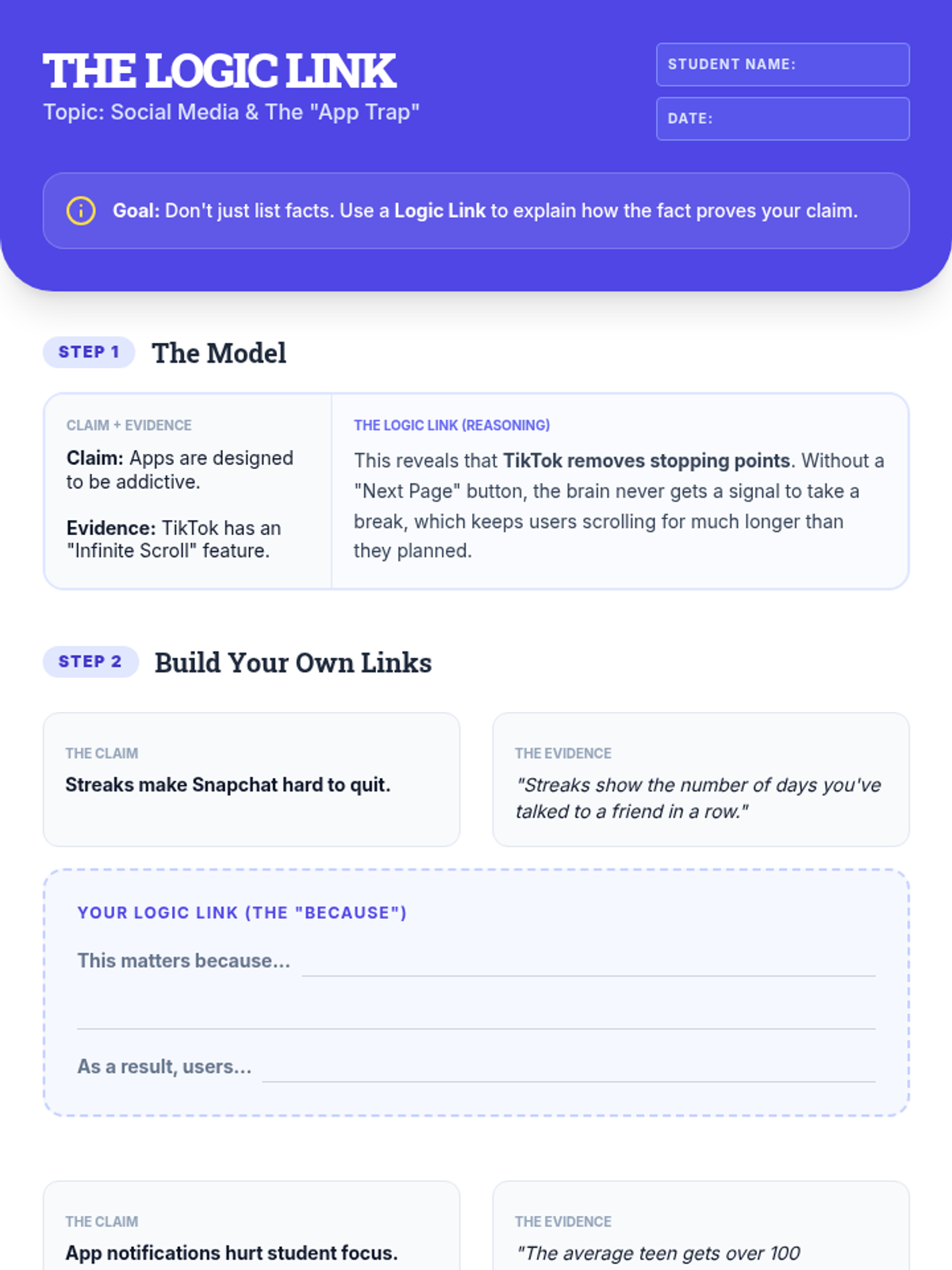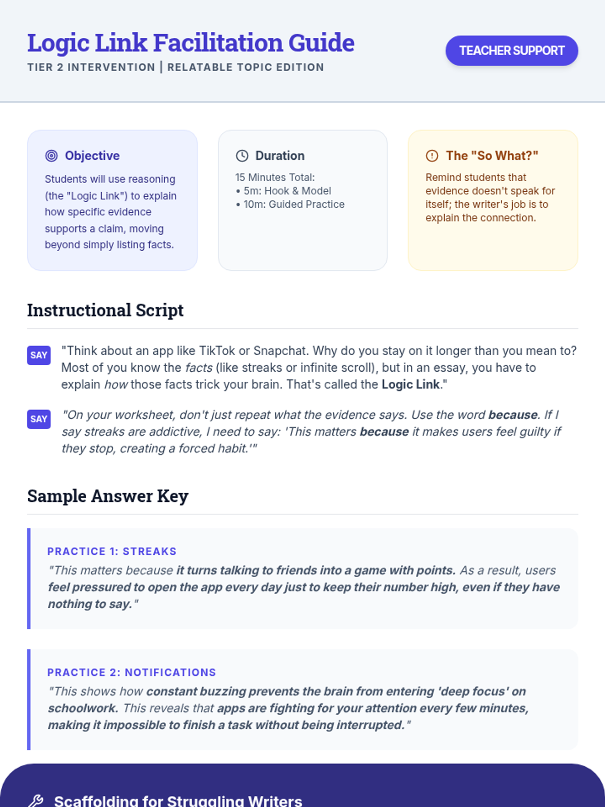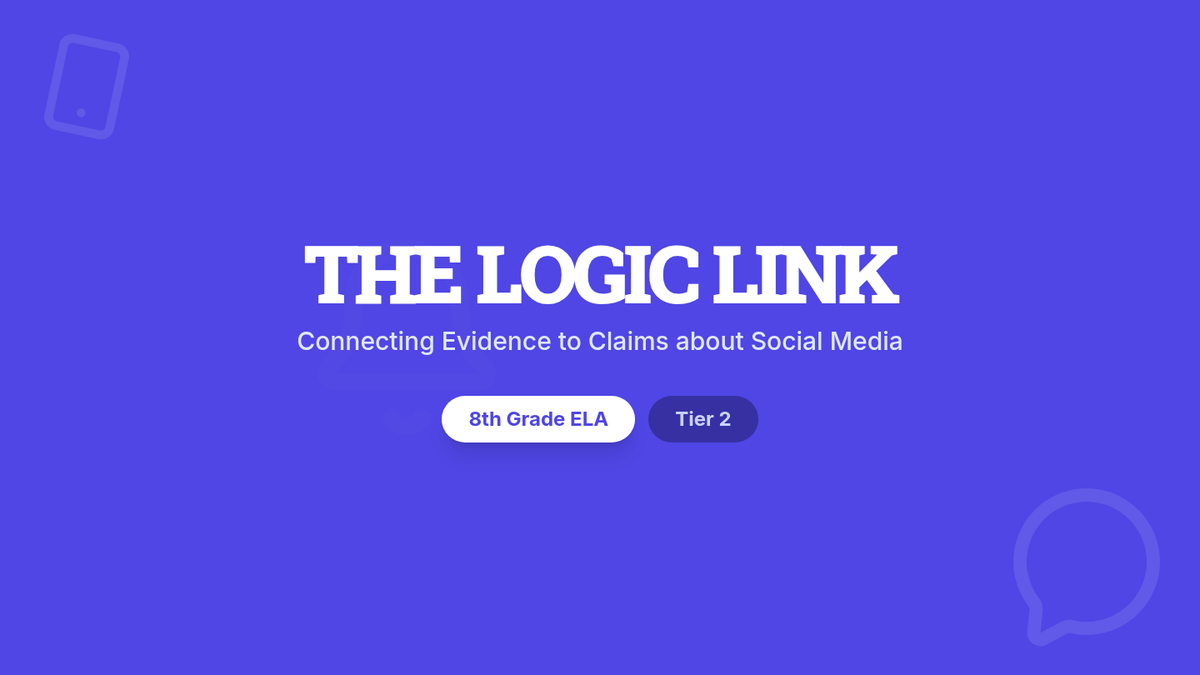 A 15-minute Tier 2 intervention lesson for 8th graders focused on connecting evidence to claims using the relatable topic of social media and focus. Students learn to build "logic links" to explain how specific app features impact behavior.