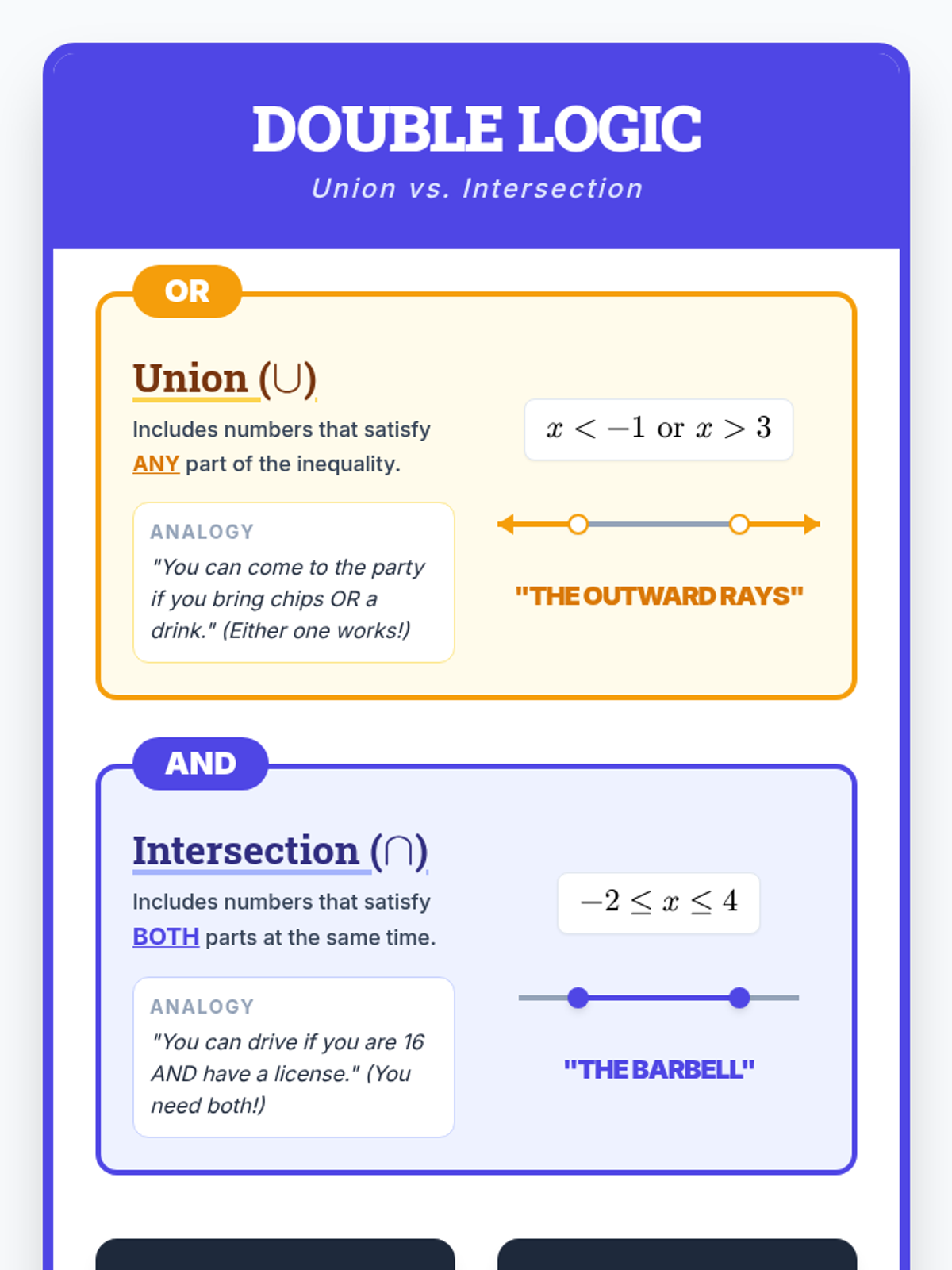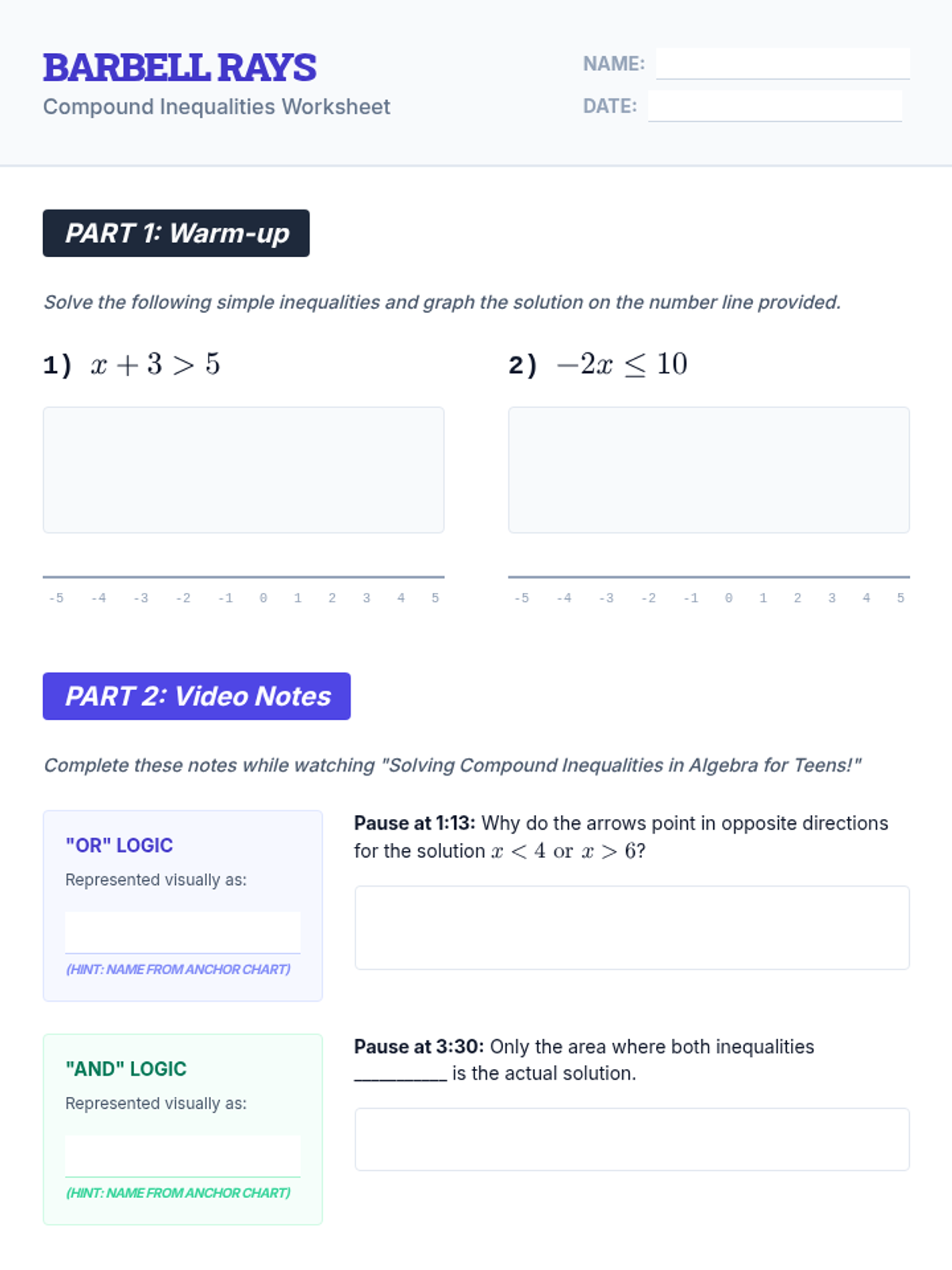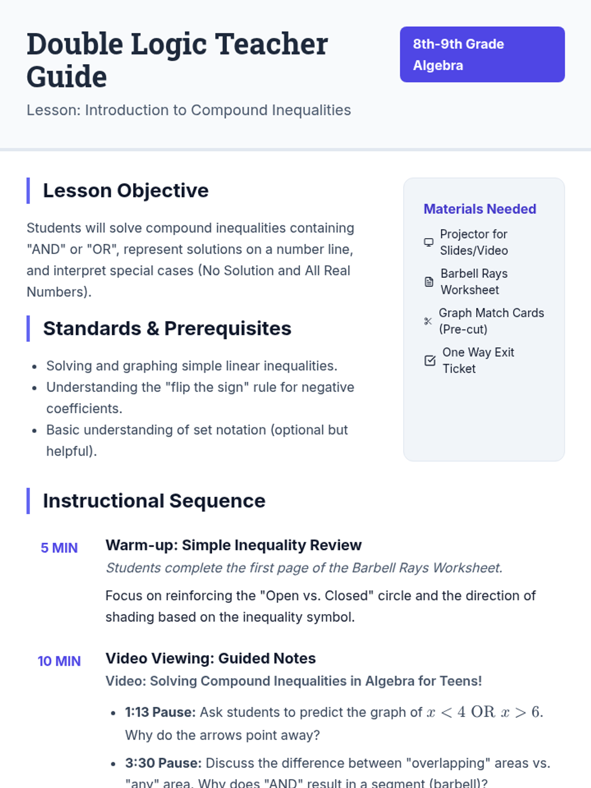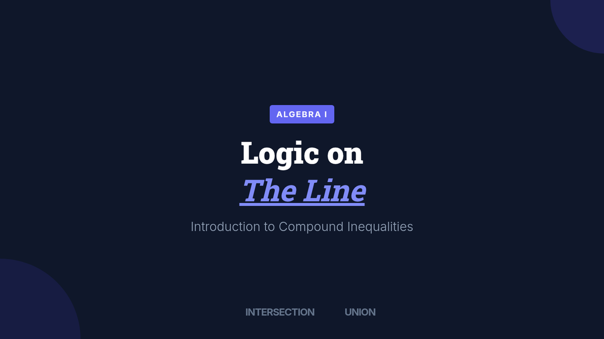 A comprehensive introduction to compound inequalities (AND/OR), covering algebraic solutions, number line graphing, intersection versus union, and special cases like No Solution and All Real Numbers.